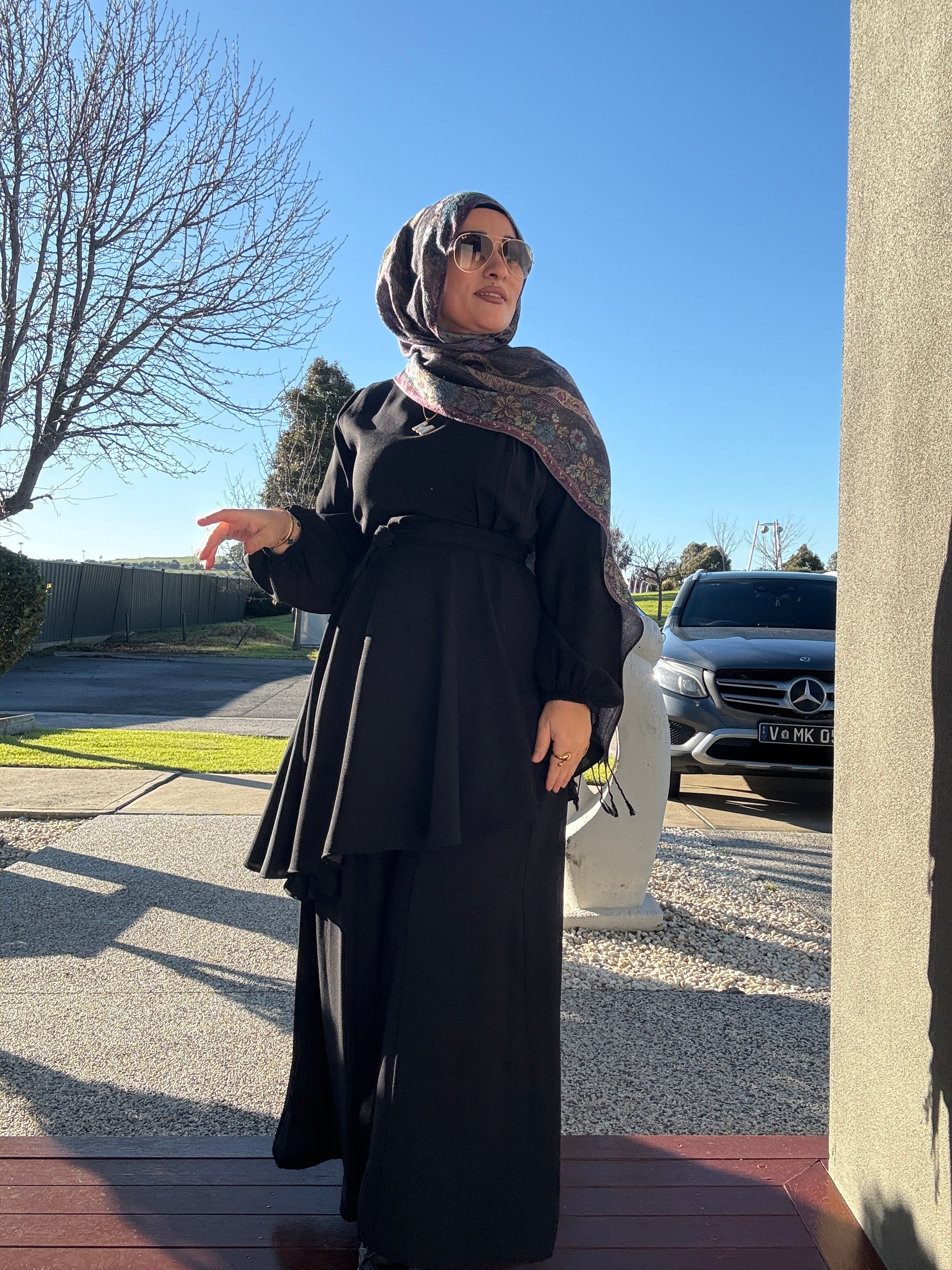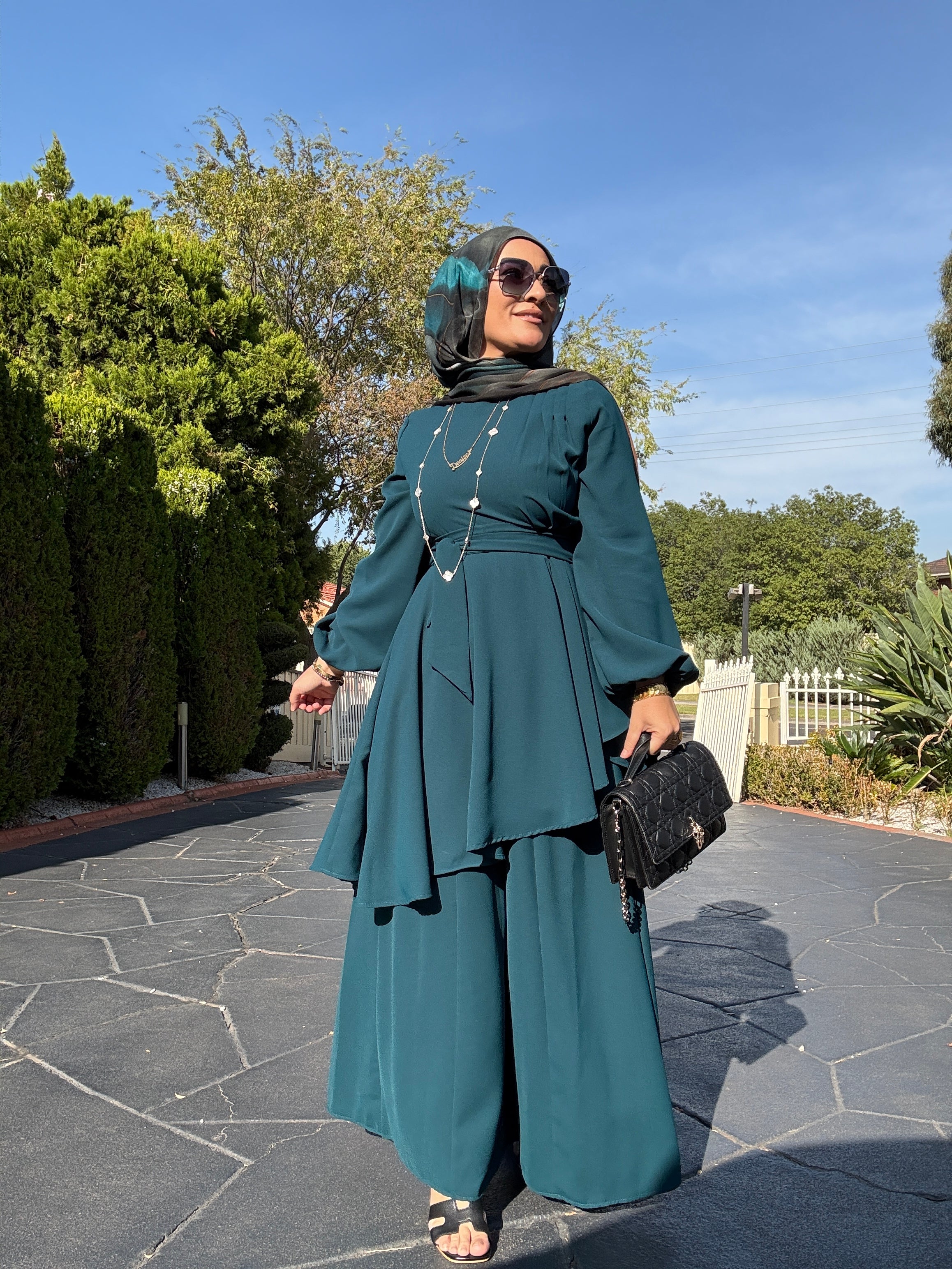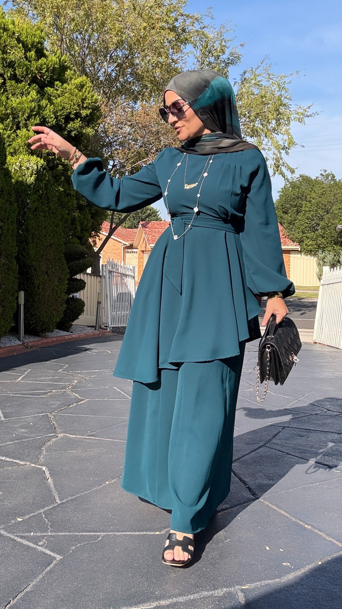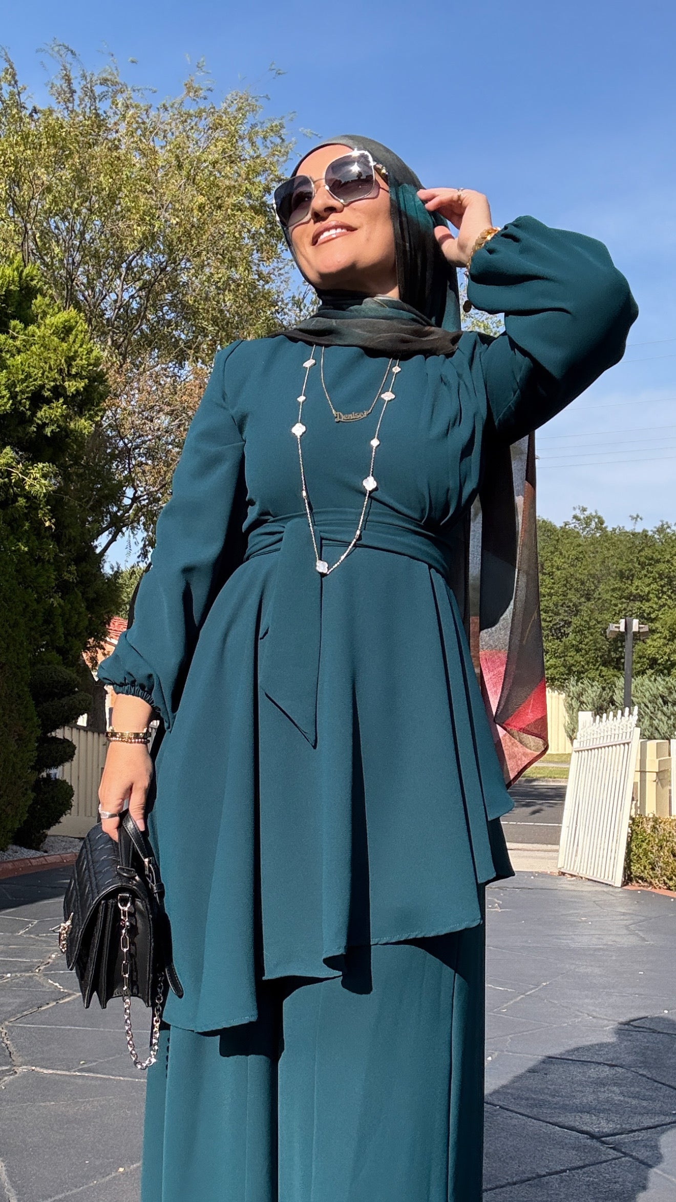 Description: The Ace Set is a stunning set. The top is an asymmetric top, has cuffed wrists and comes with a belt. The pants have an elastic waist and is very flowy.