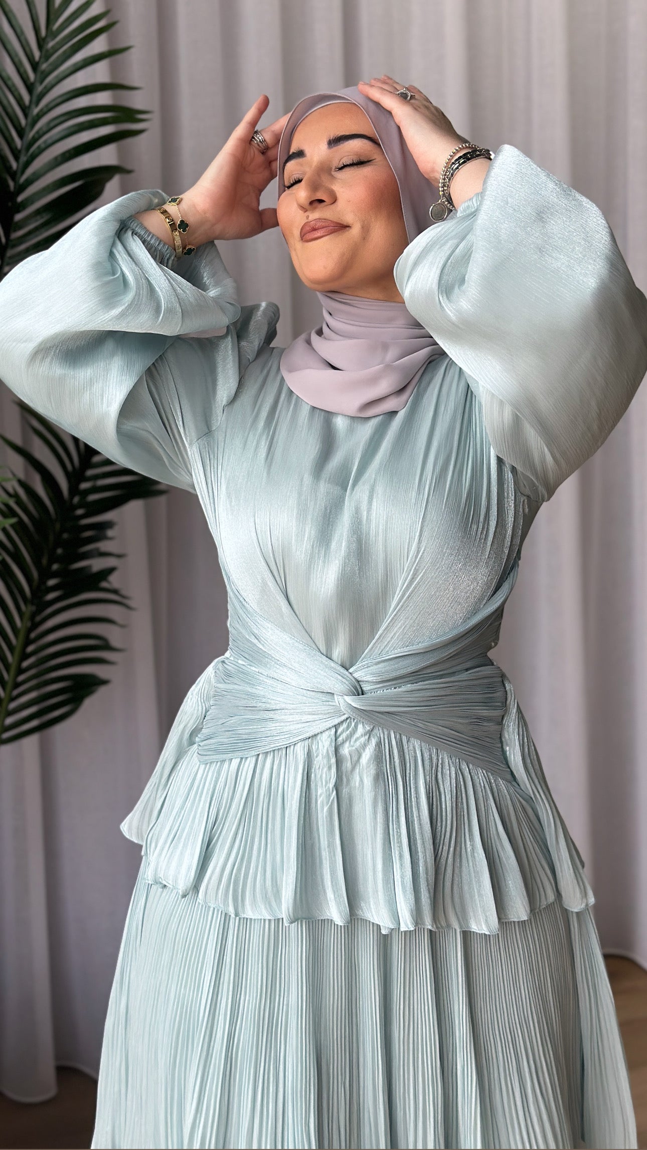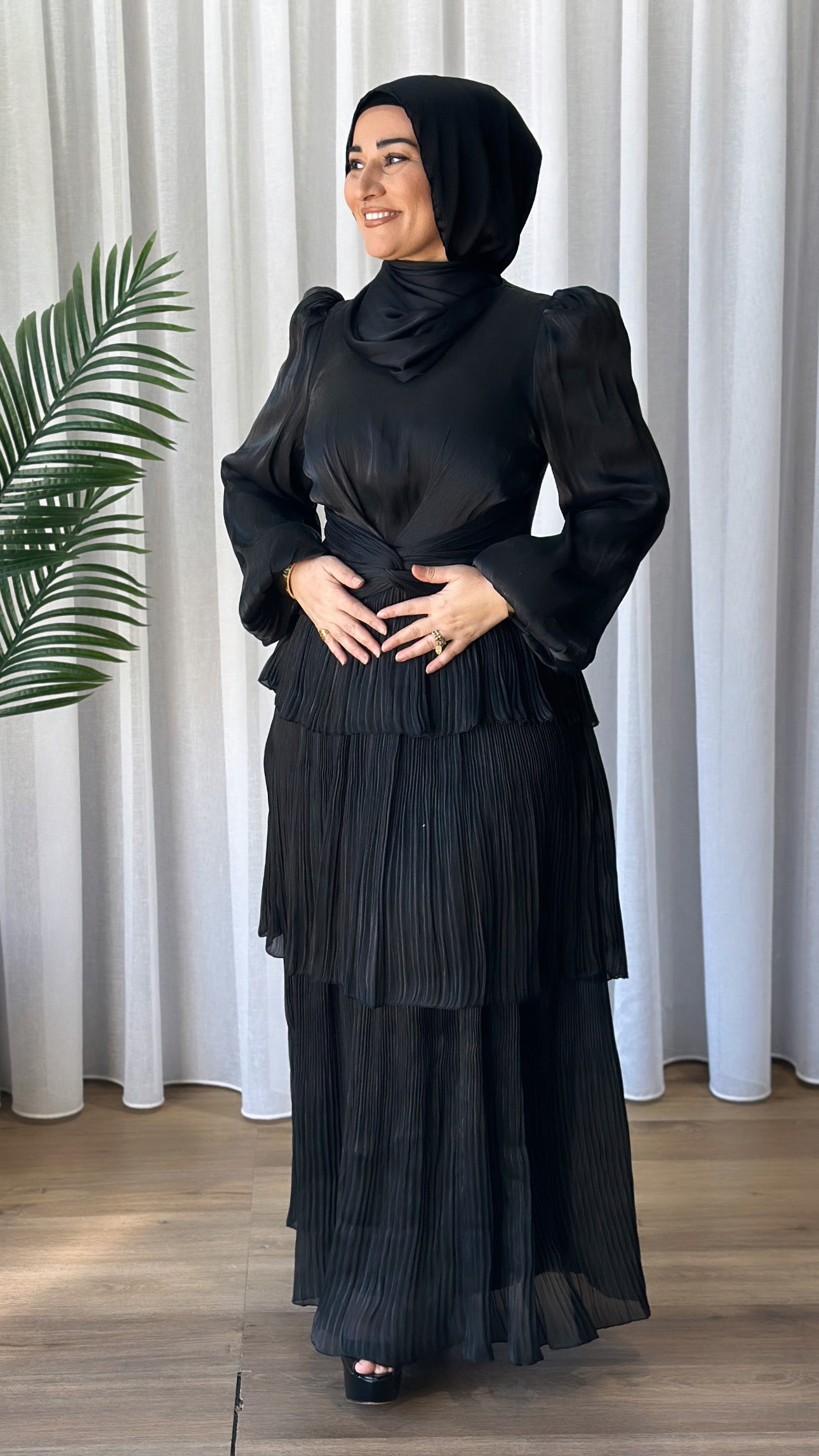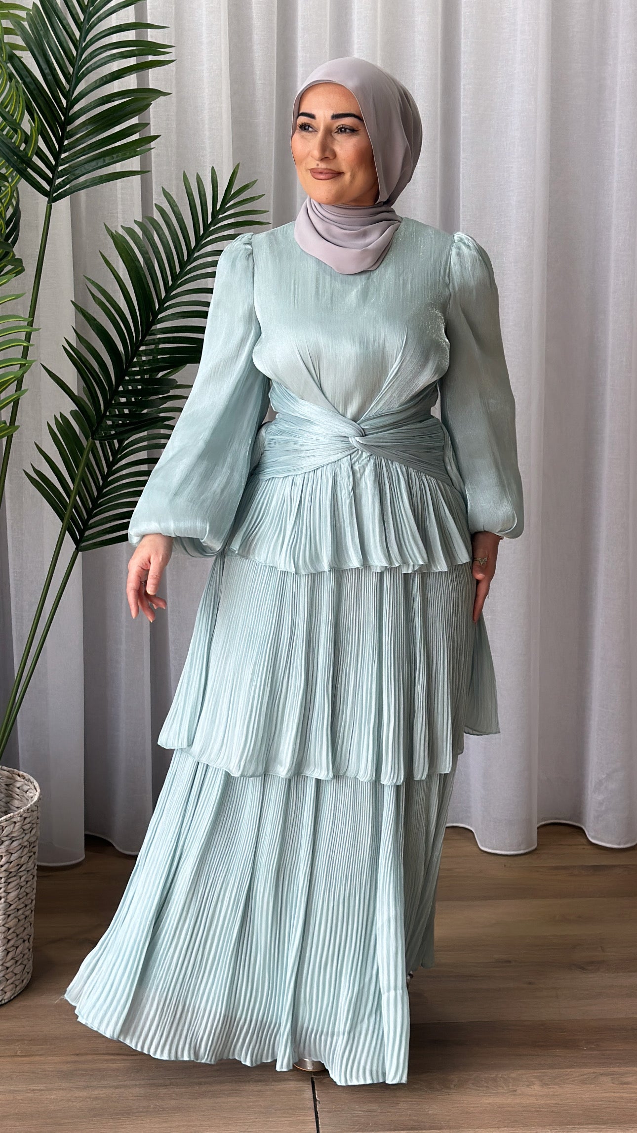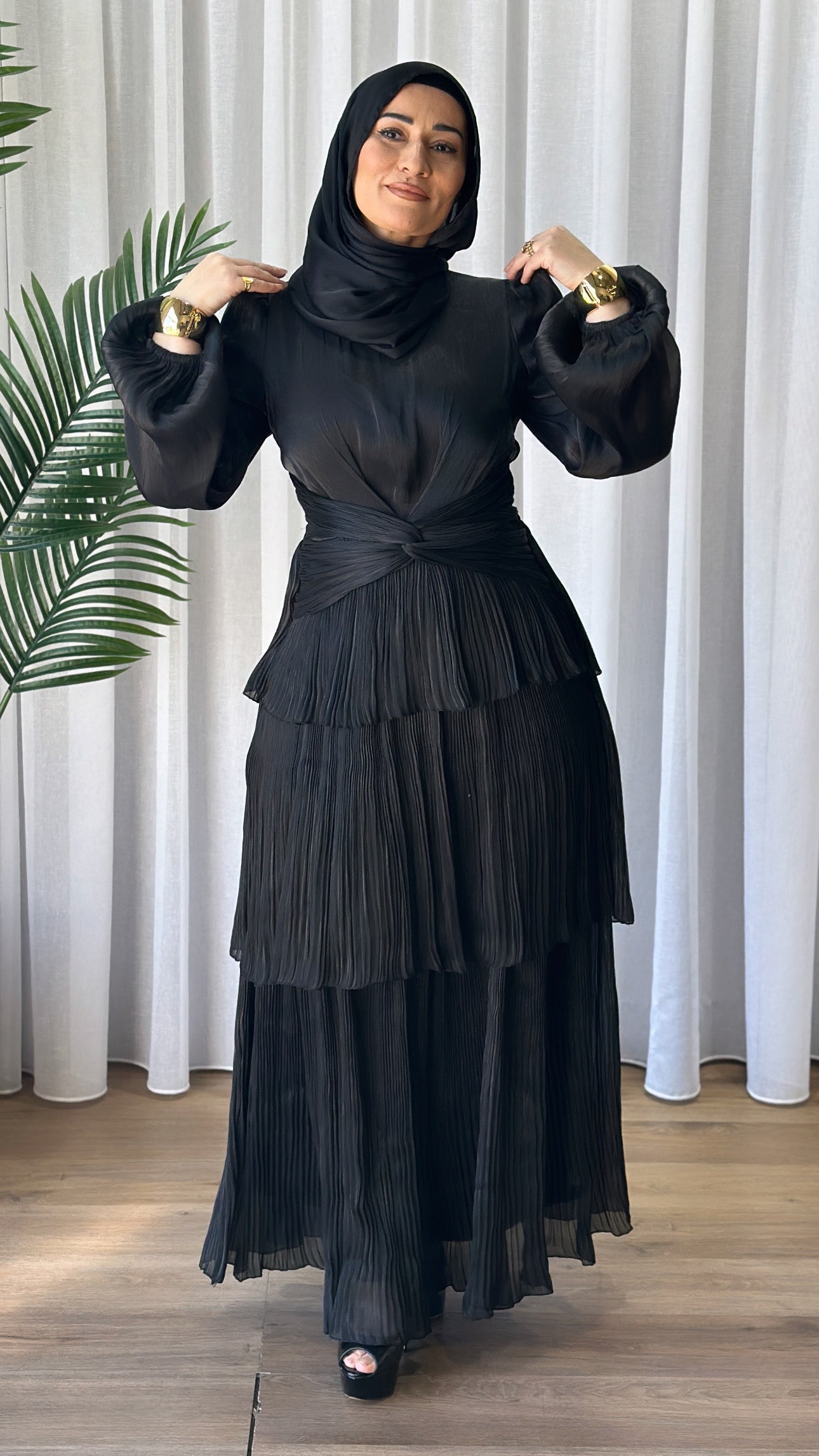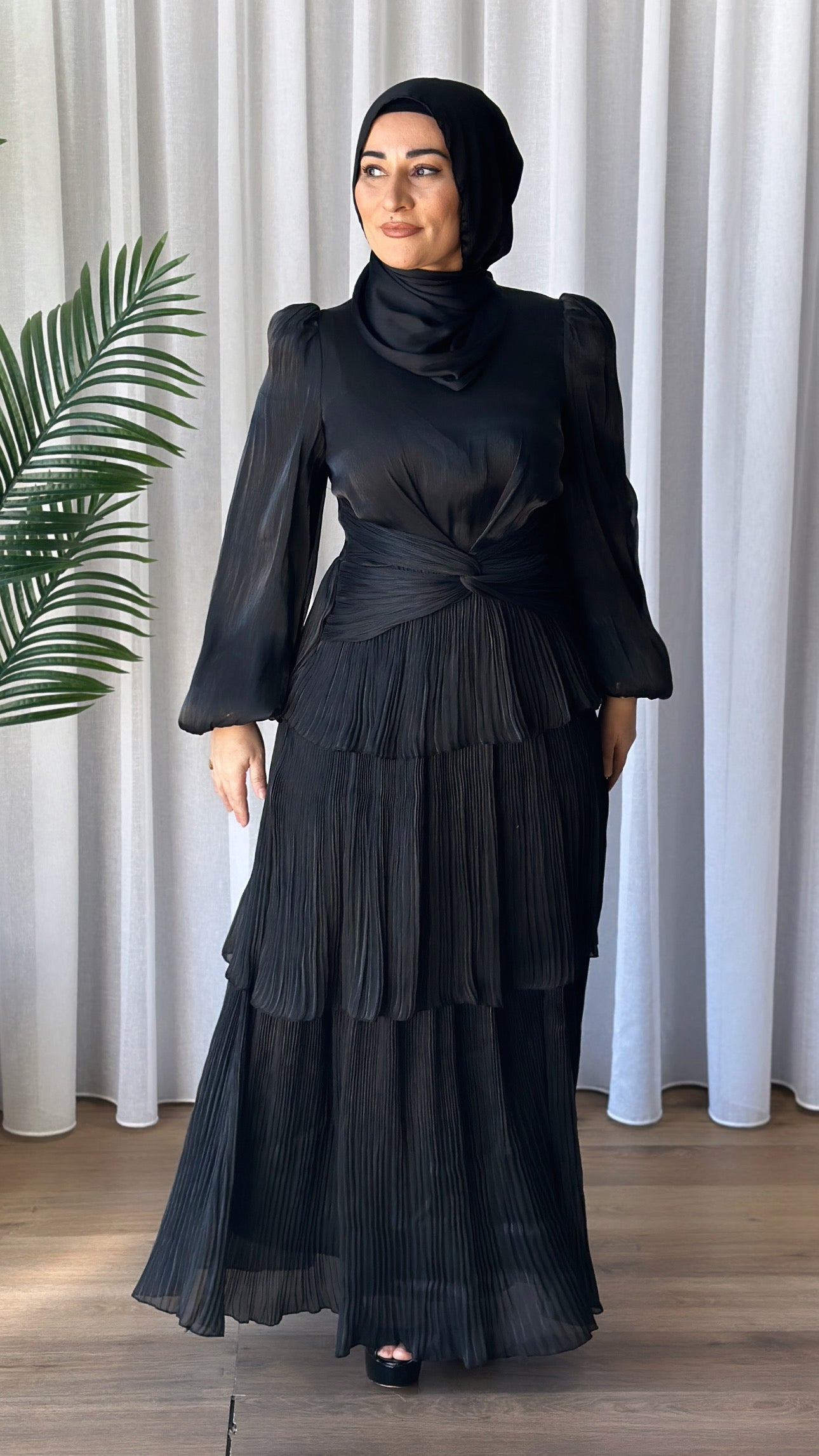Description: The Aysu Dress is a stunning formal dress. It has a layered skirt design, an A line flow, elastic wrists and knot design on the front. The sleeves are also a balloon sleeve.