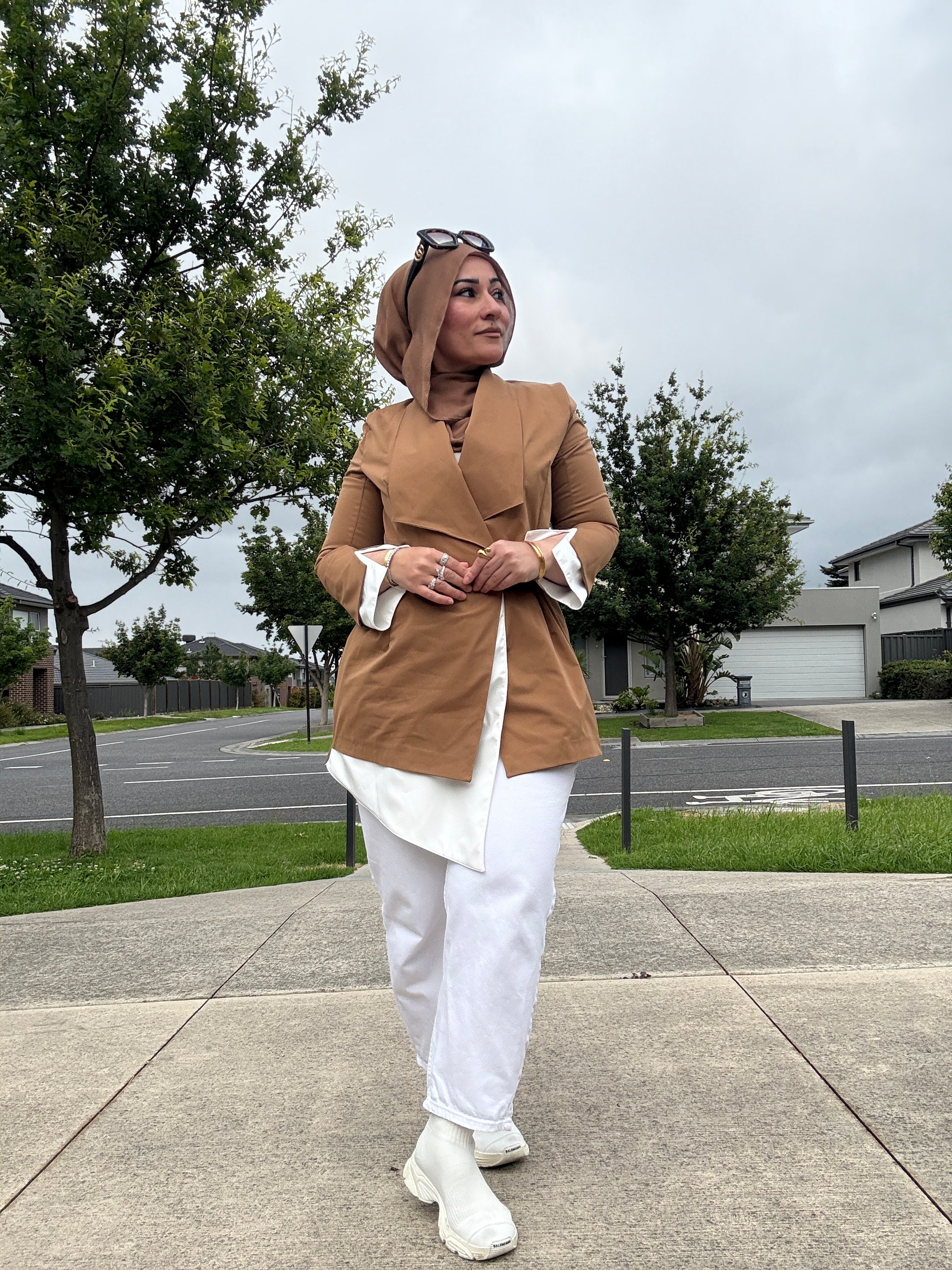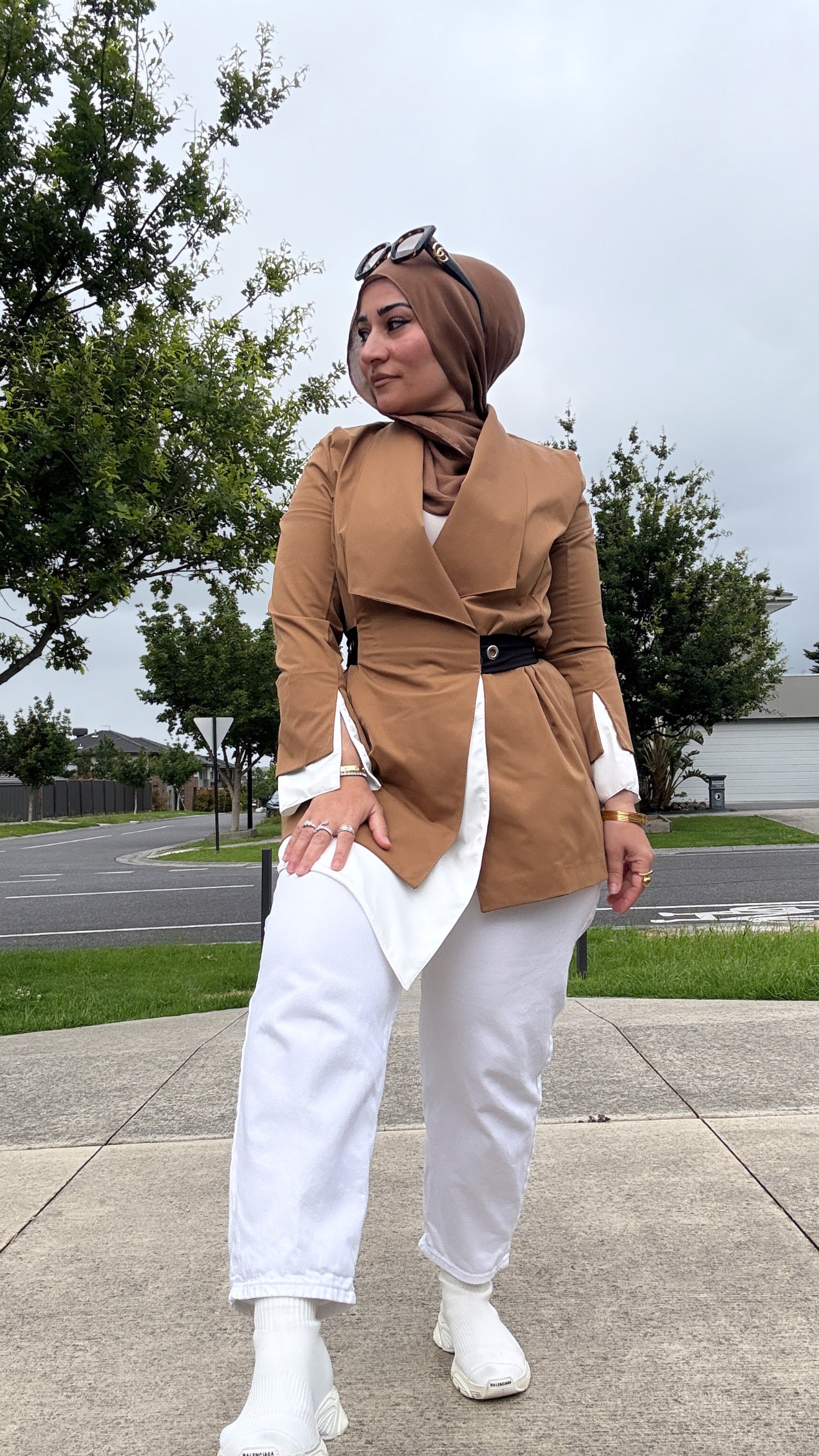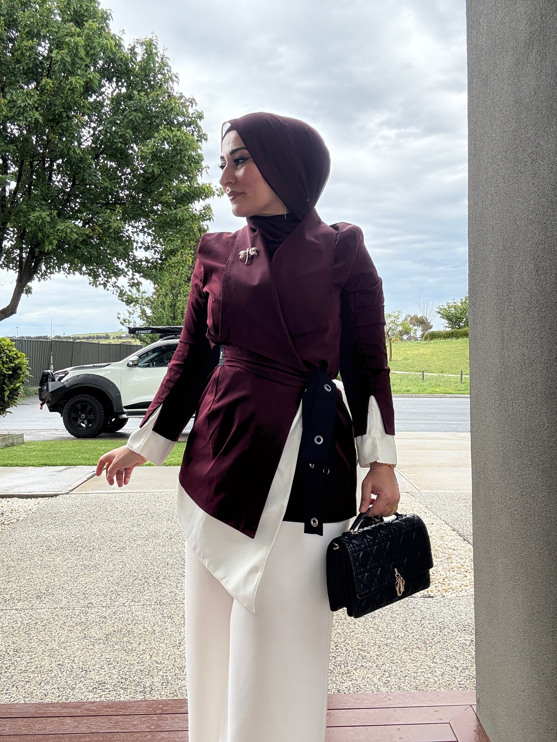 Description: The Bahar Blazer is stunning. It is part of a set and goes with the Bahar pants. It features a slit at the front and is two layered. It comes with a belt and is sinched at the waist.