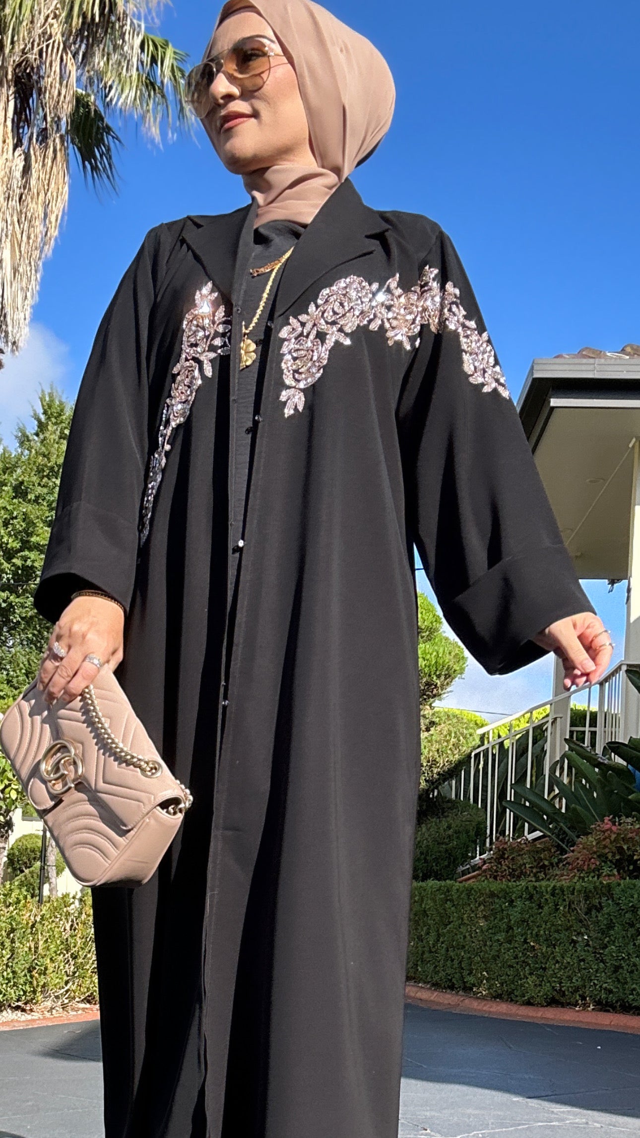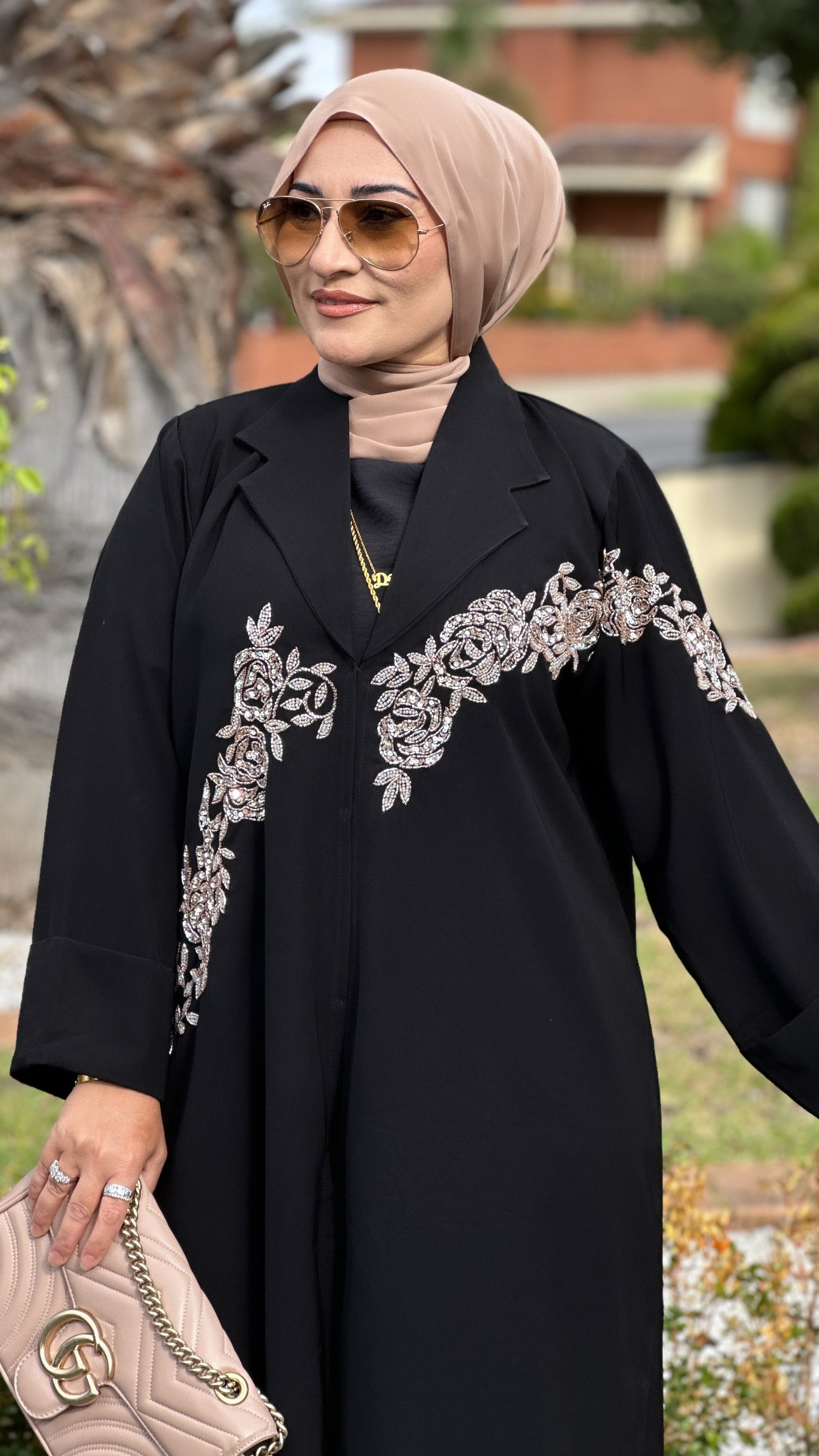 Description: The Blazer Abaya is a stunning abaya. It has a collared neckline, with detailing on the chest. The abaya is fully buttoned and can be worn open or closed.