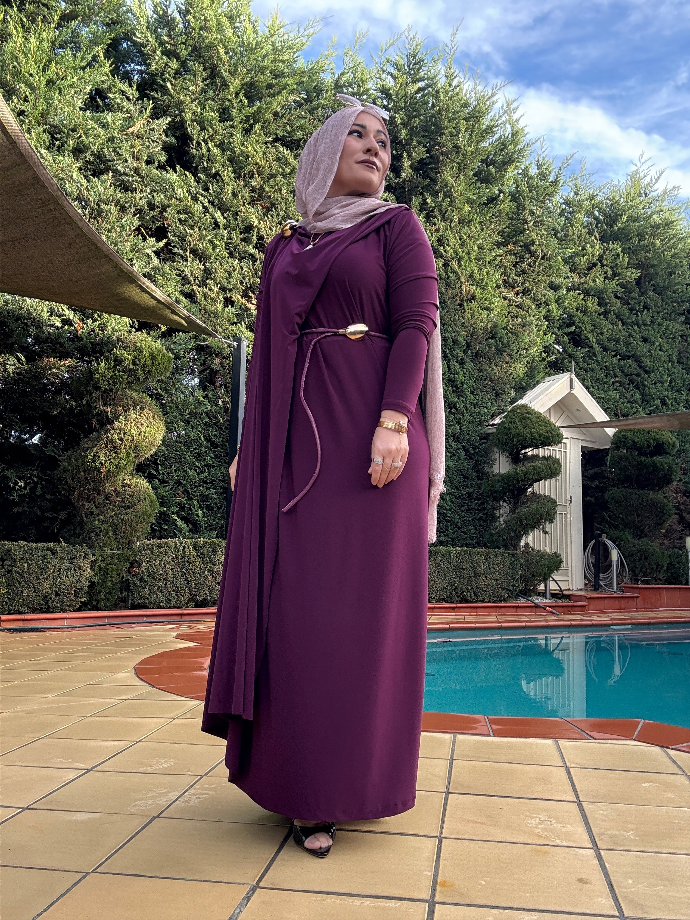 Description: The Brooch Lycra Dress is a stunning dress. It is a fitted lycra dress with cape detailing, brooch belt, brooch pin and fitted sleeves. You can definitely dress it up or down for a more casual look.