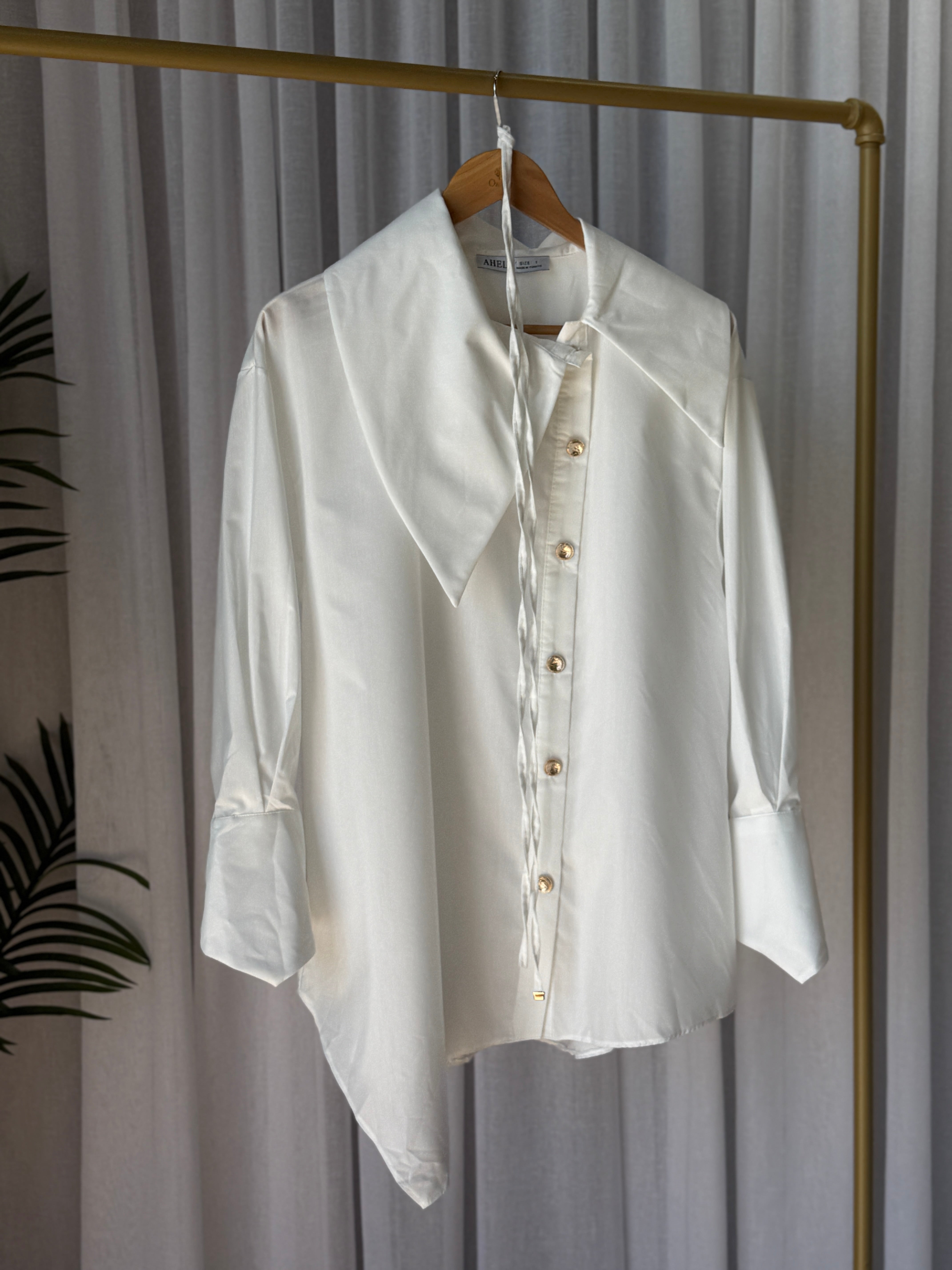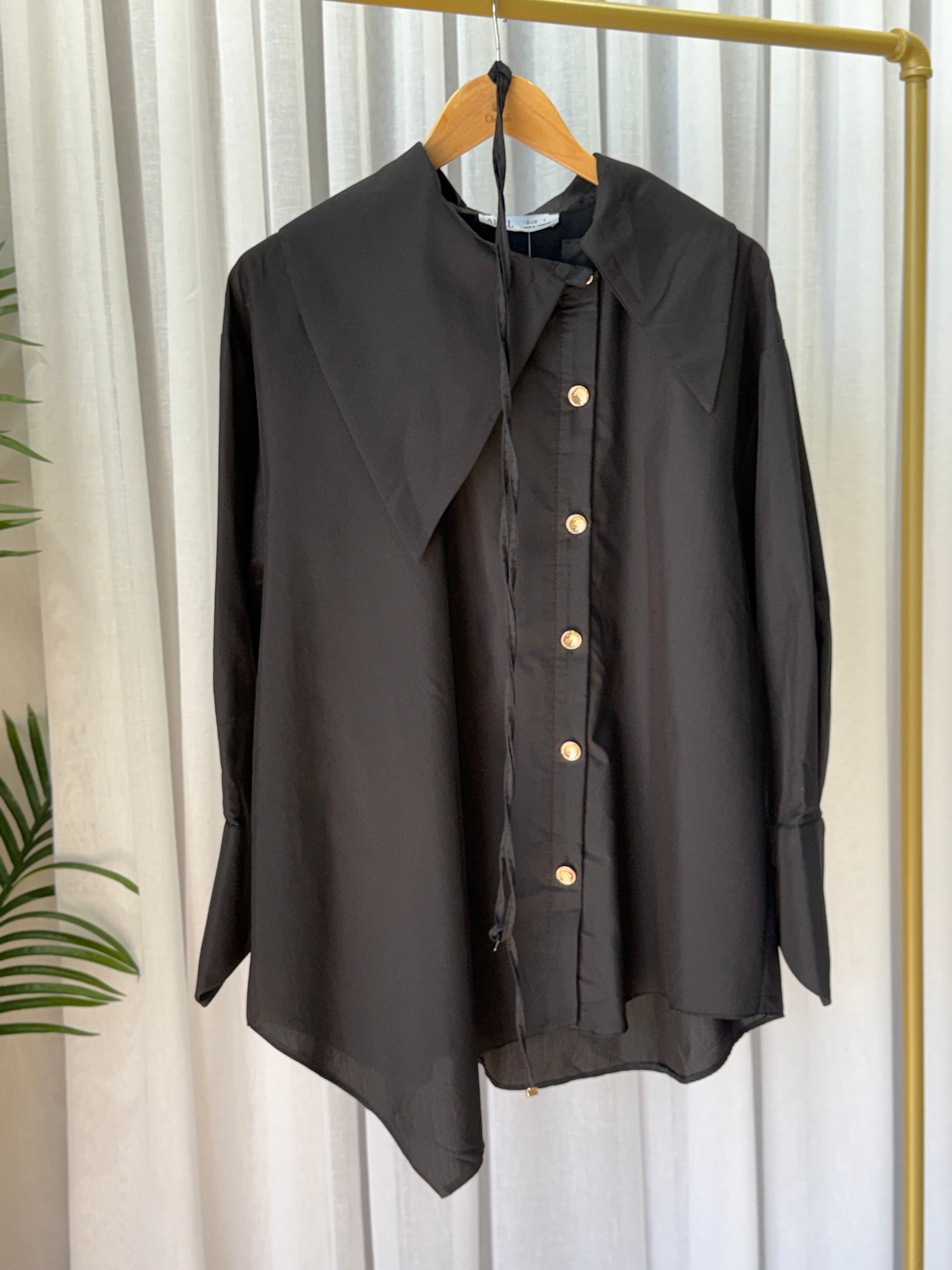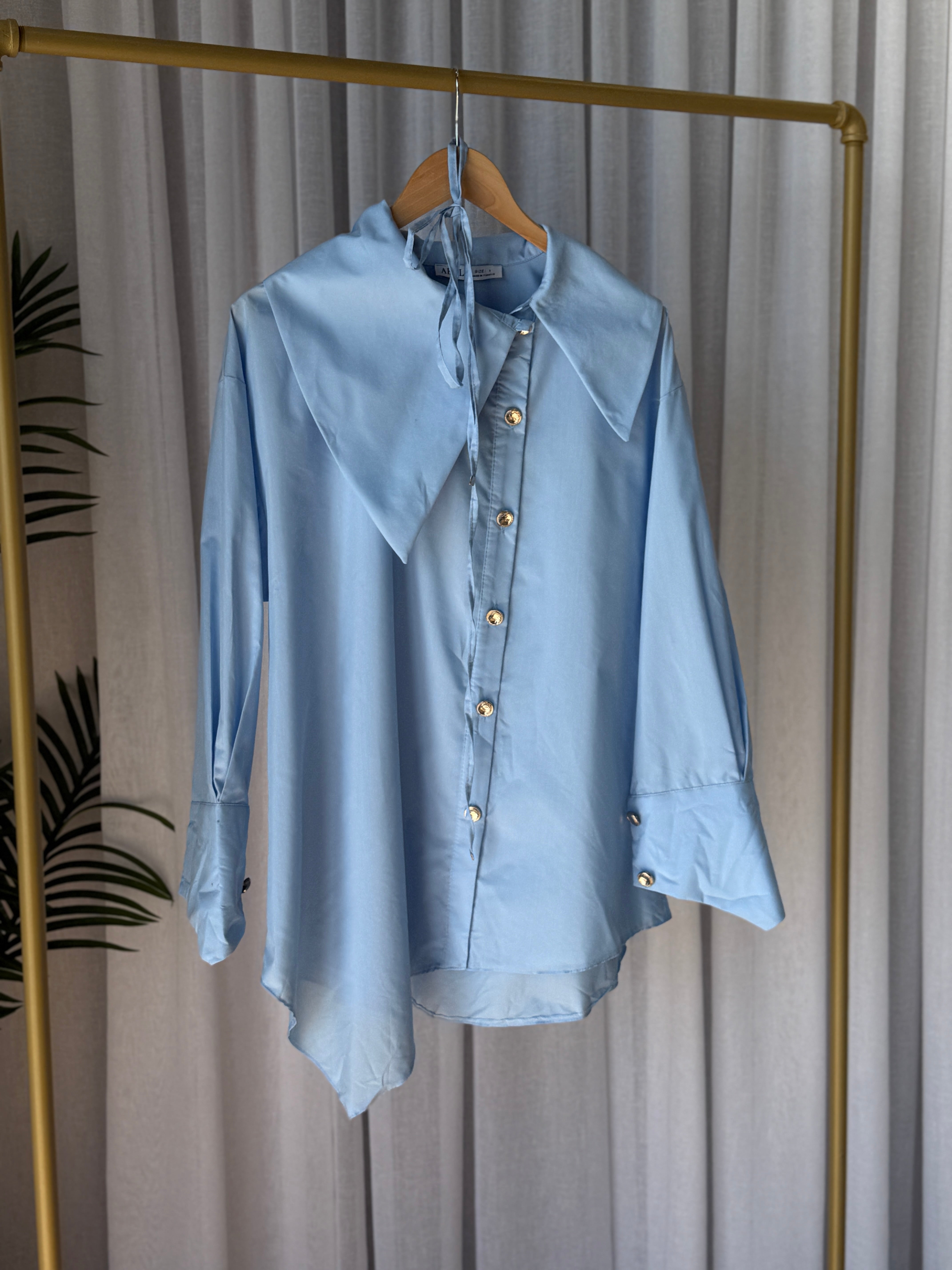 Description: Elevate your wardrobe with this refined butterfly shirt, featuring a classic button-up silhouette and crisp collared neckline. Distinctive button detailing adorns the sleeves, adding an unexpected touch of elegance, while the adjustable tie-up closure allows for effortless styling versatility.