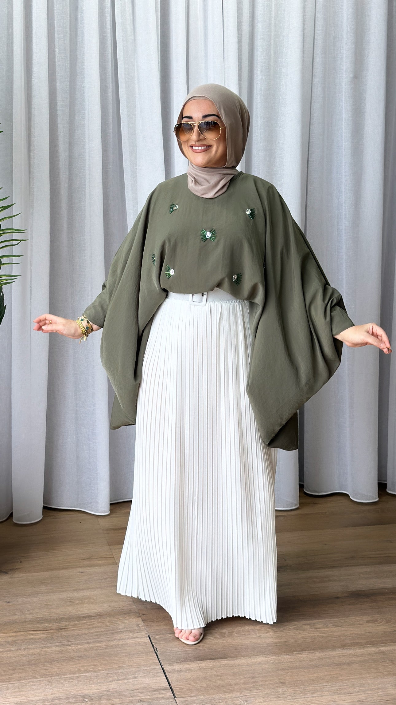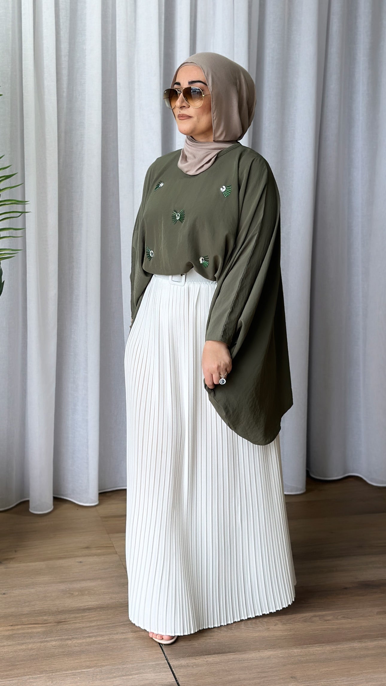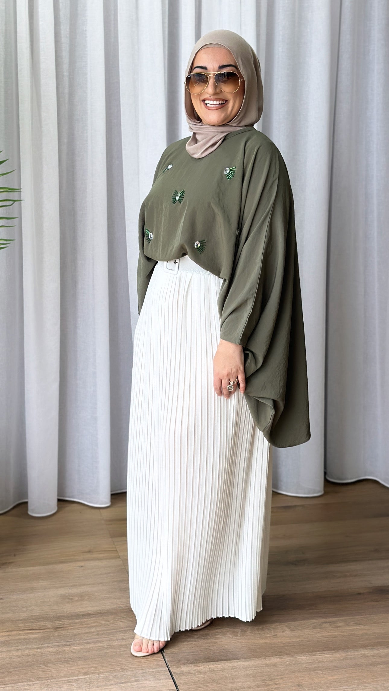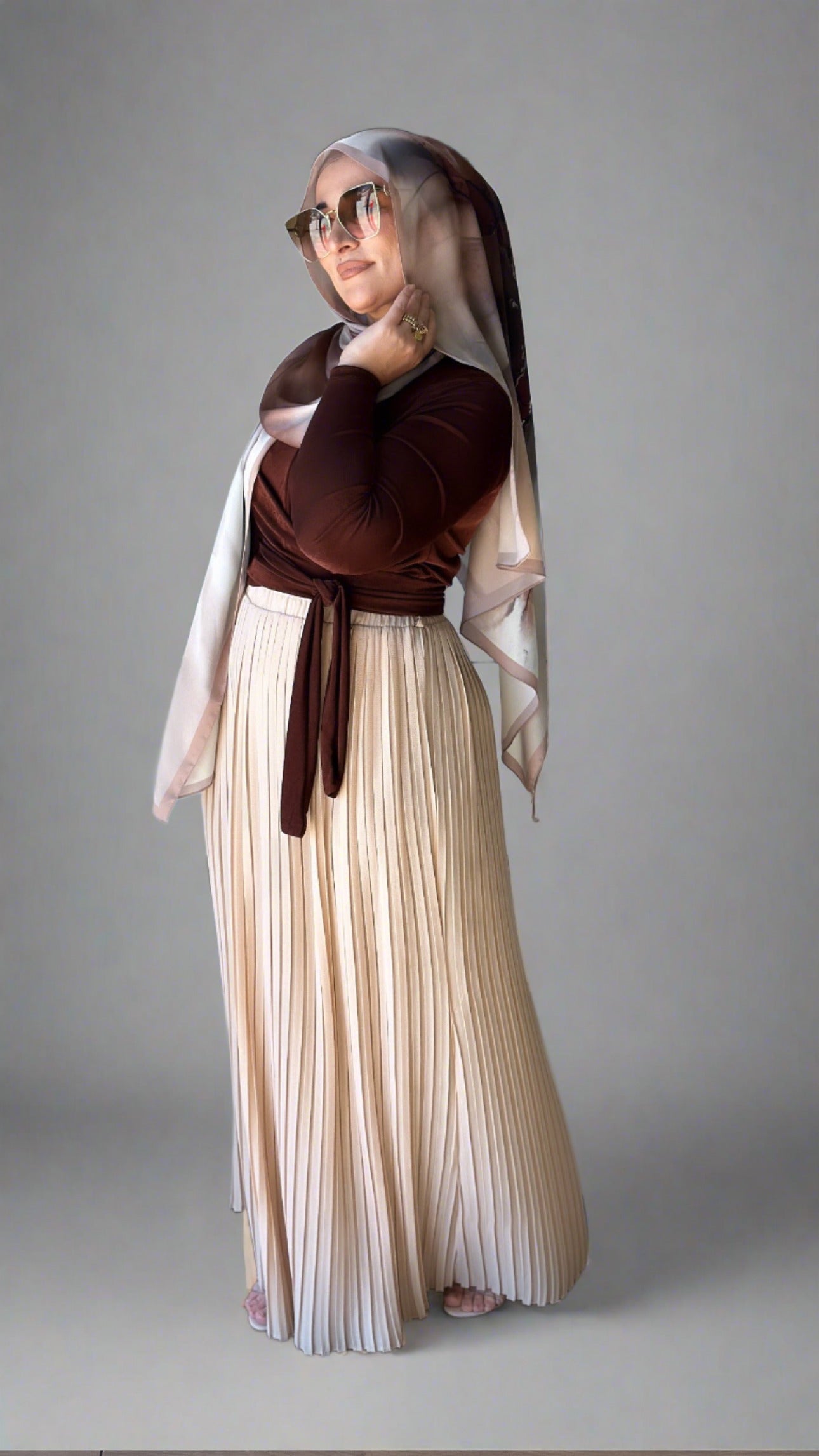 Description: The Clarissa Skirt is a stunning fully pleated skirt, elastic waist and it comes with a belt.