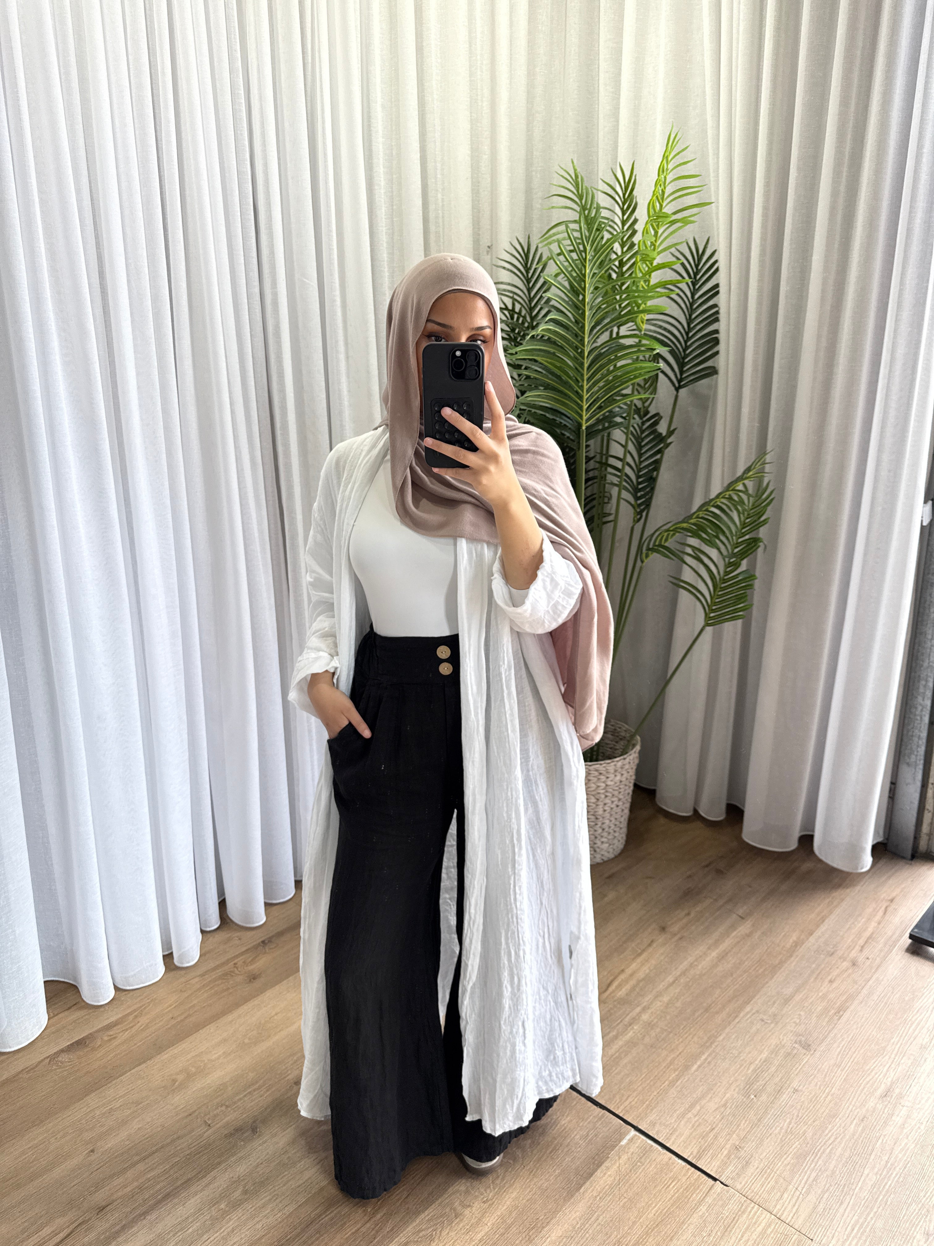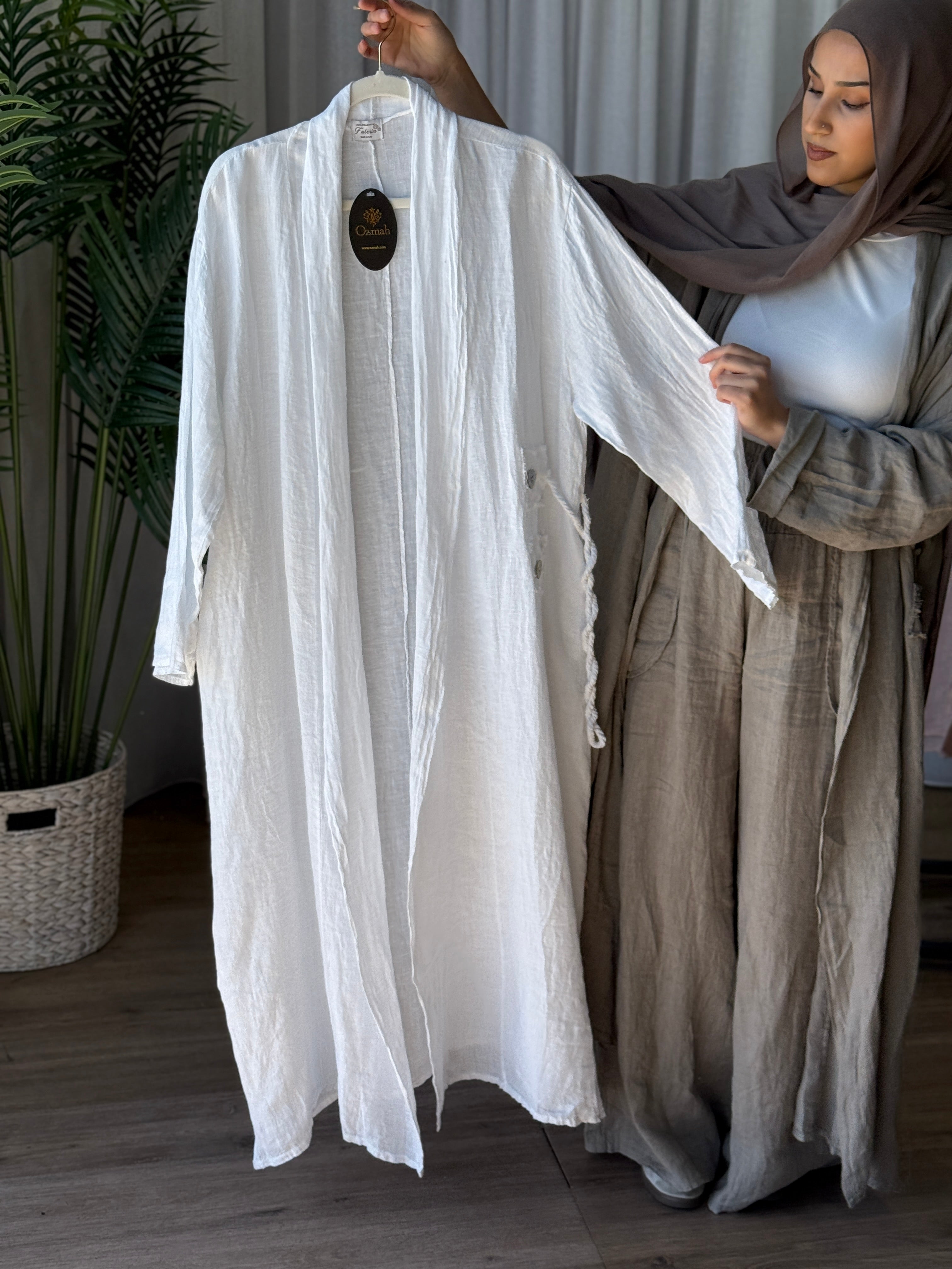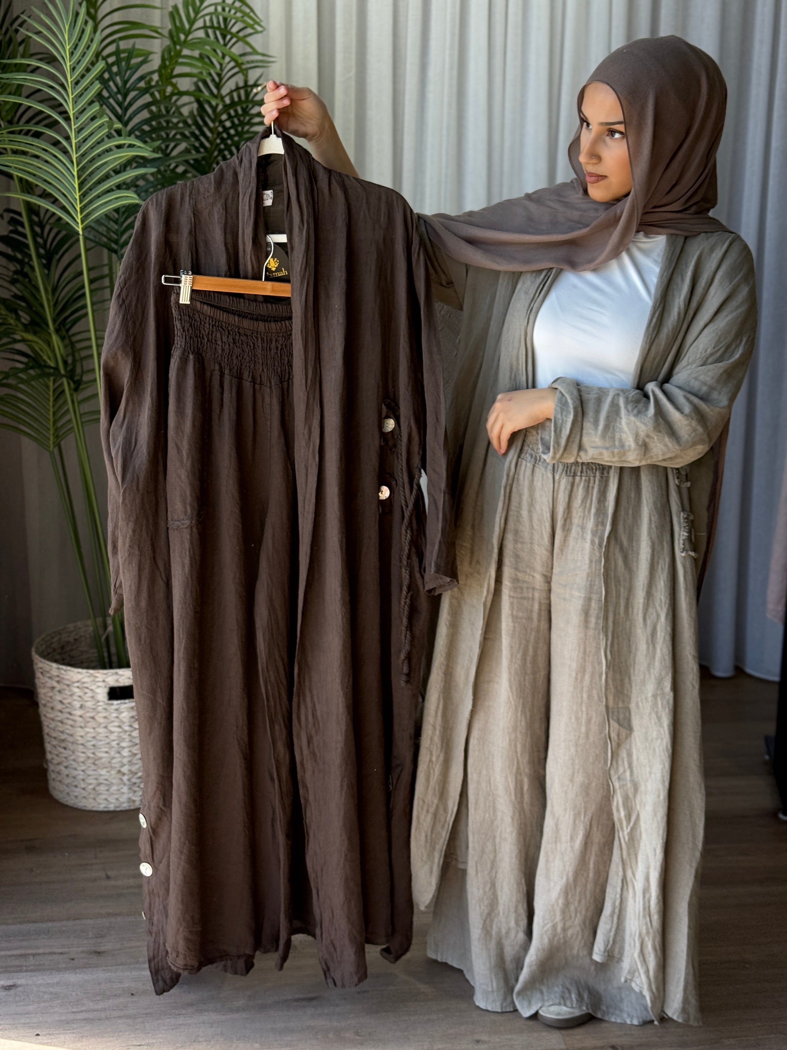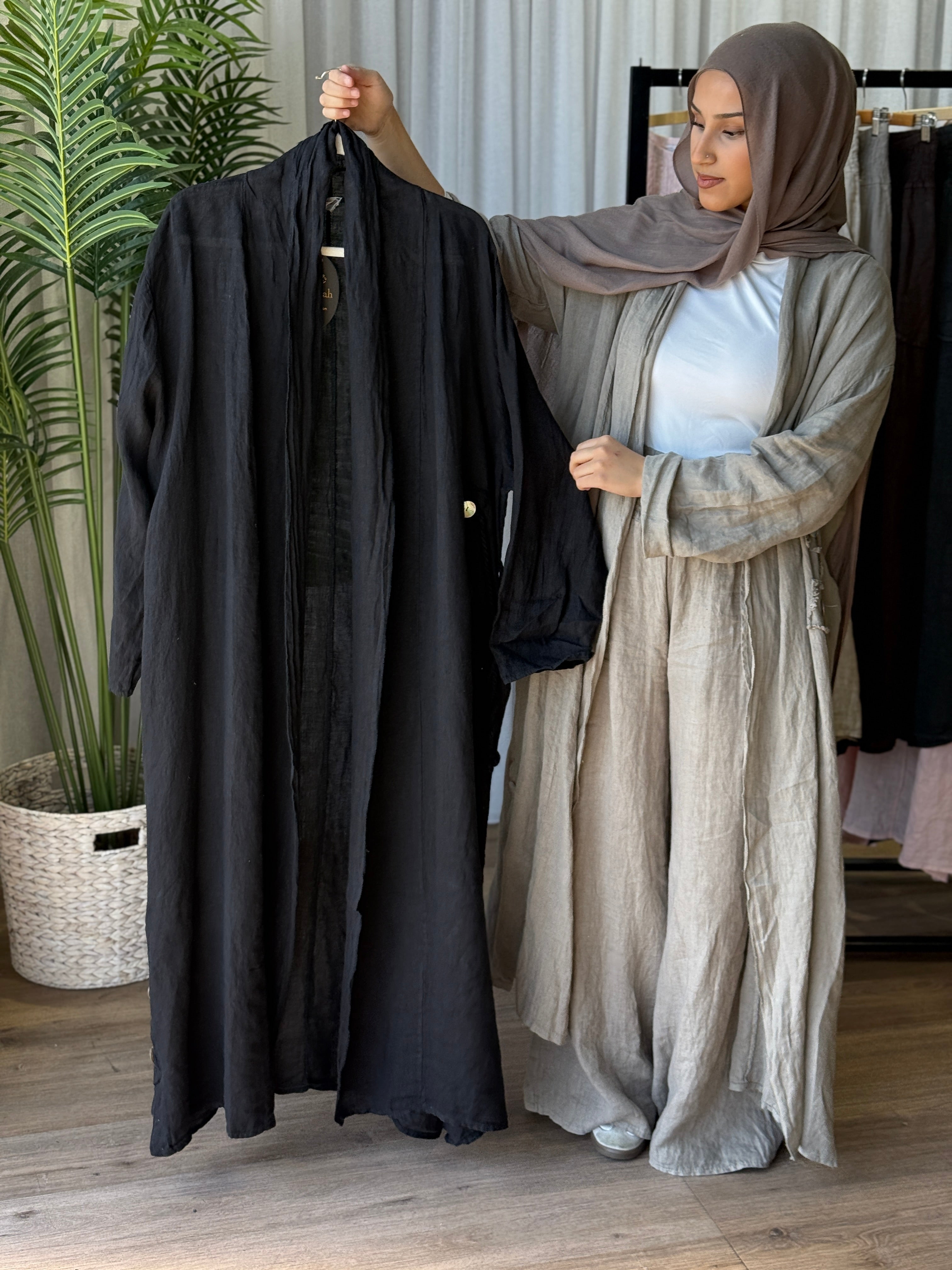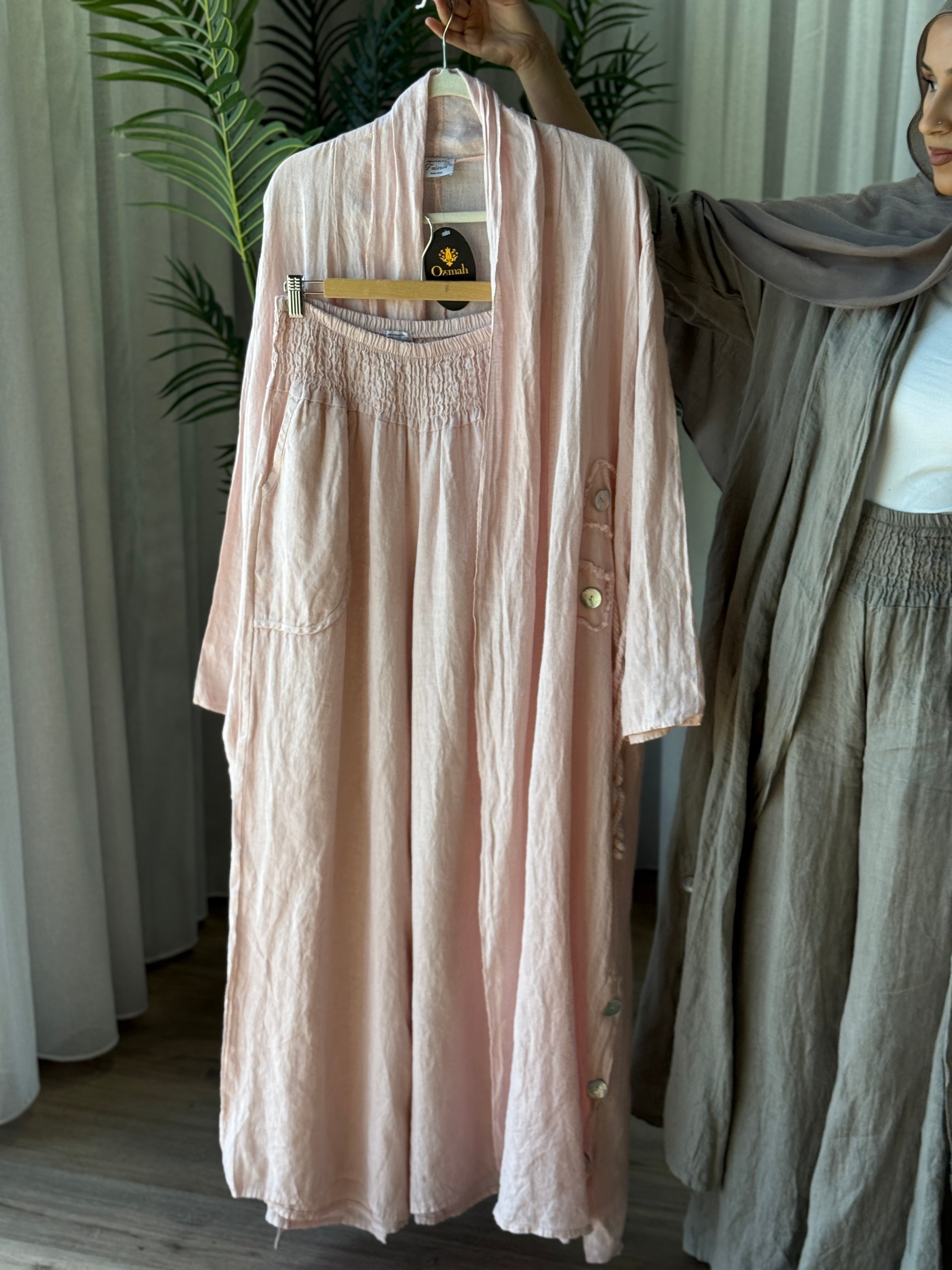 Description: The Deniz Cardigan is a stunning cardi. With its generous fit and the use of the finest italian Linen makes this a must have. Can be matched up with the other "DENIZ" range. pearly buttons as design, and is a loose, flowy fit.