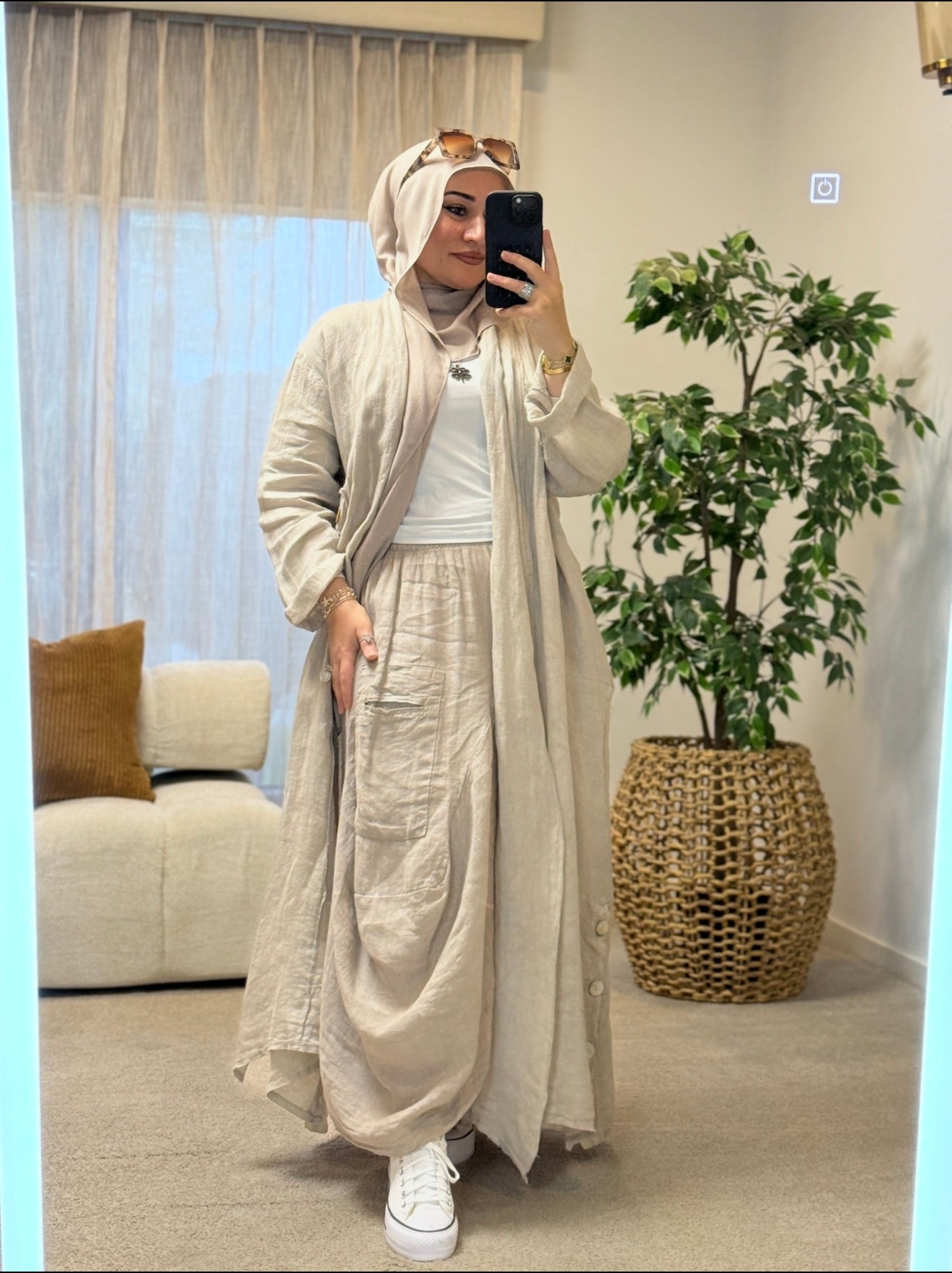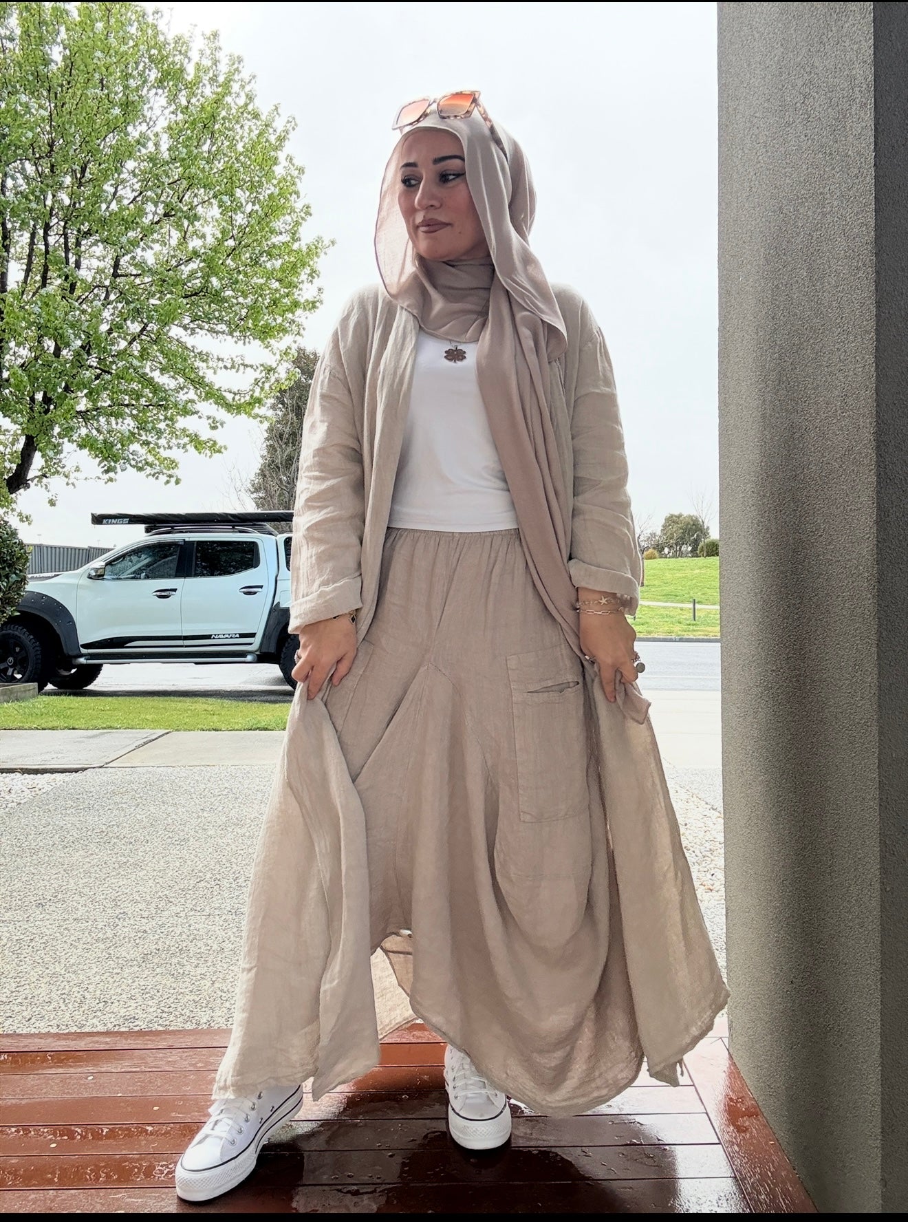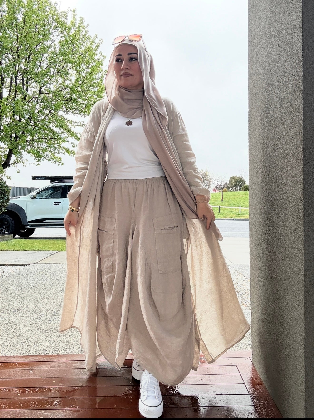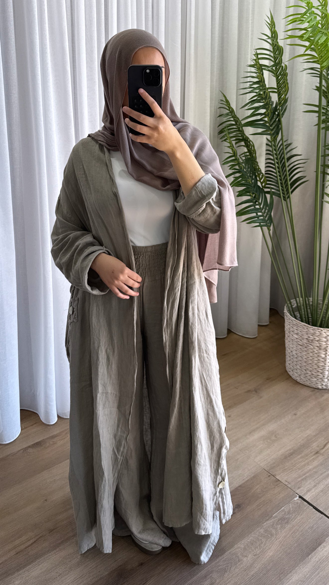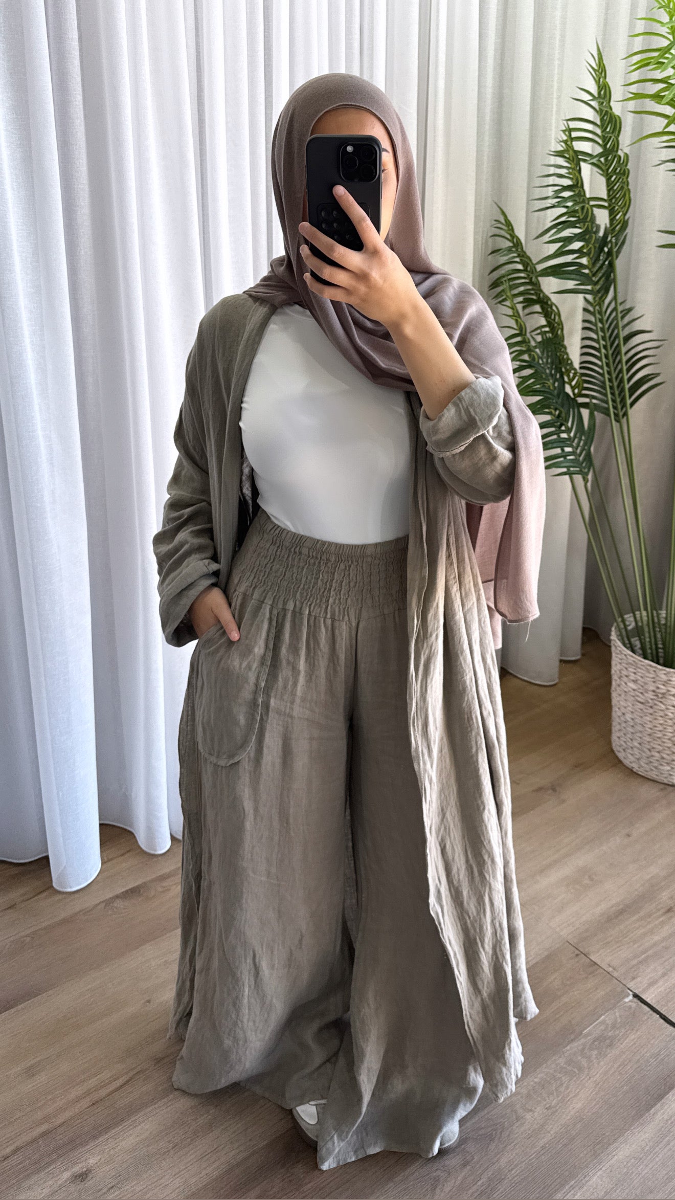 Description: The Deniz Cardigan is a stunning cardi. With its generous fit and the use of the finest italian Linen makes this a must have. Can be matched up with the other "DENIZ" range. pearly buttons as design, and is a loose, flowy fit.