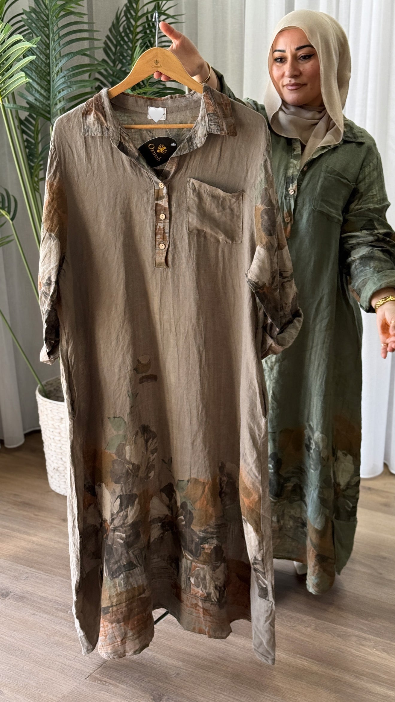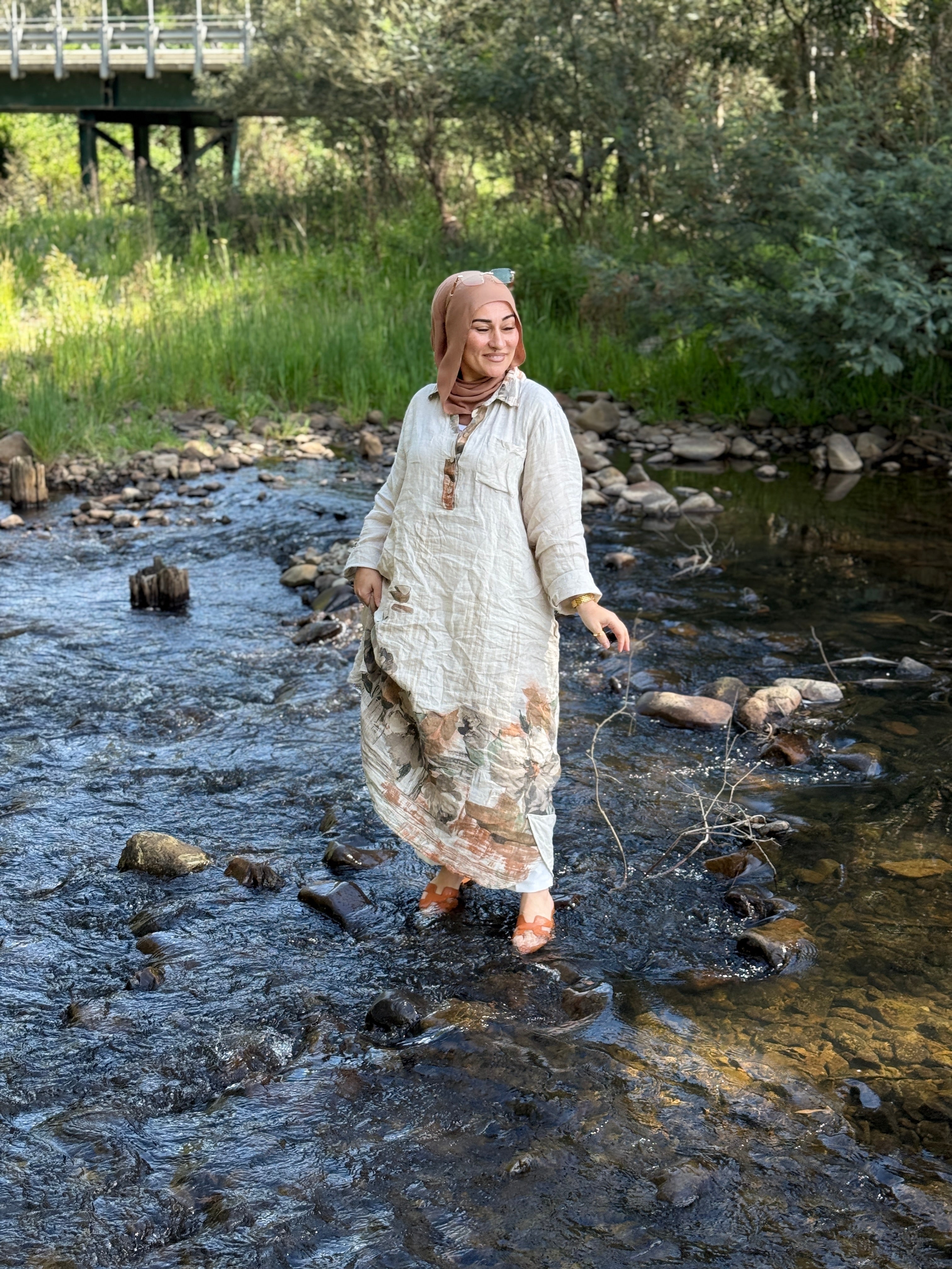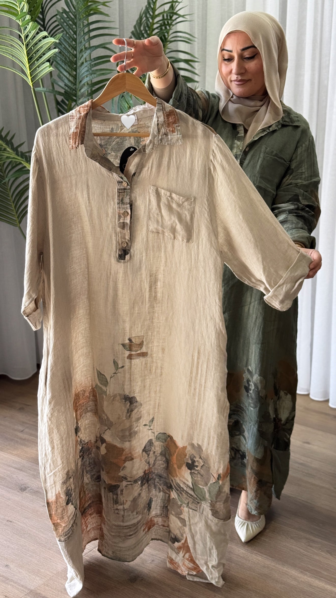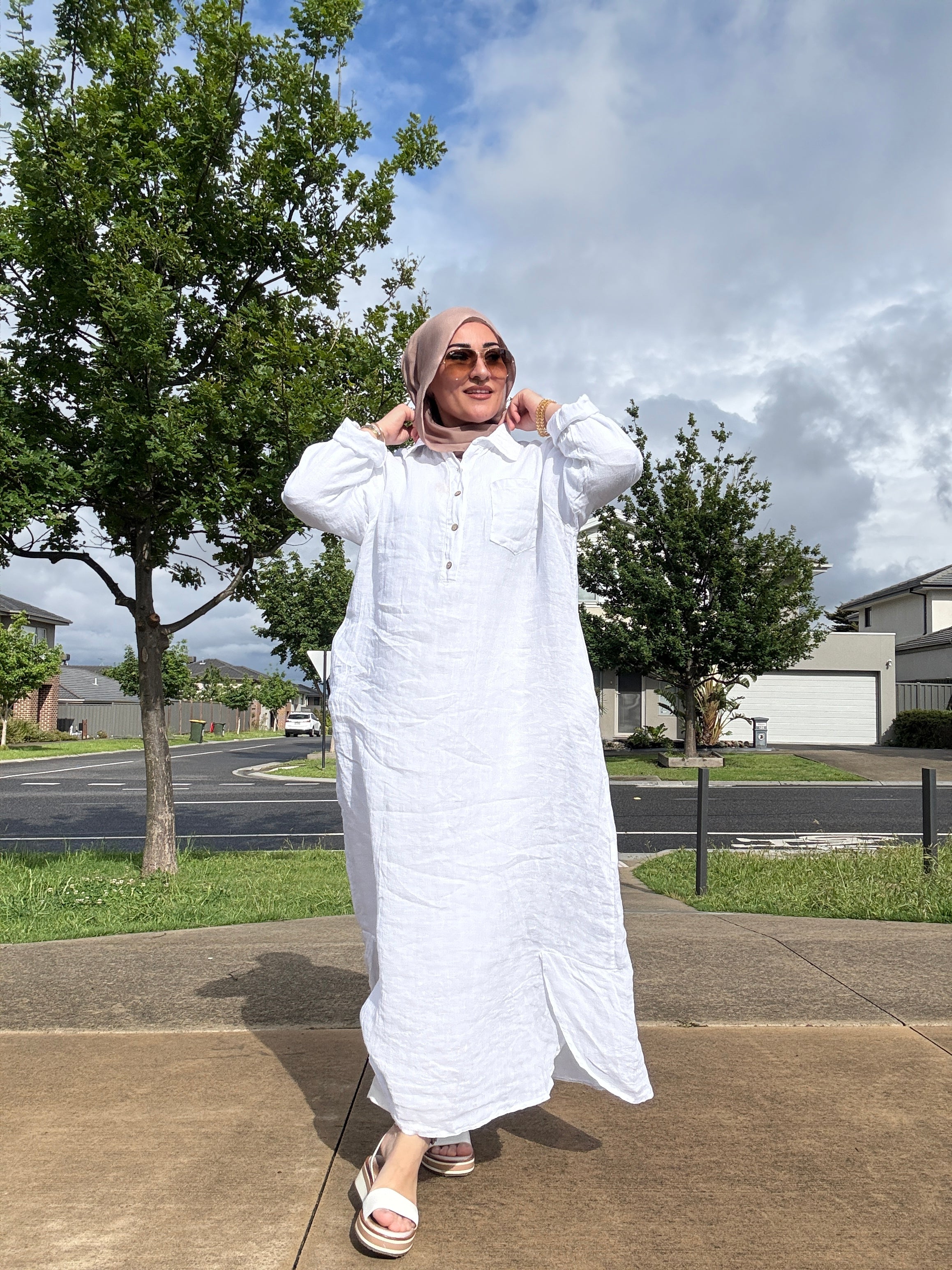 Description: The Deniz Dress is a must haves with the warmer weather approaching. It has a v neck collar, drop shoulder for the extra room and comfort, is a loose fit, and breathable.