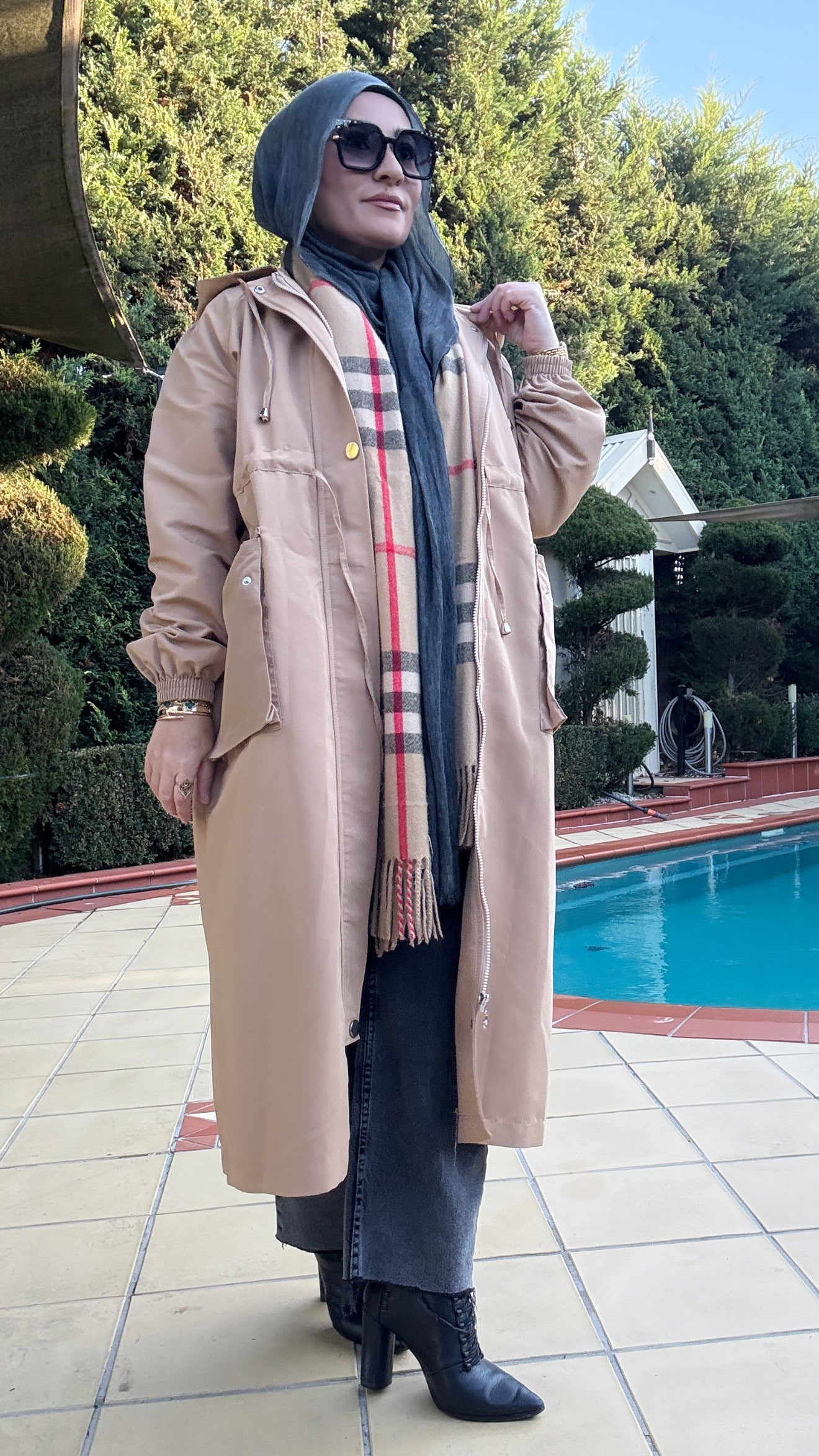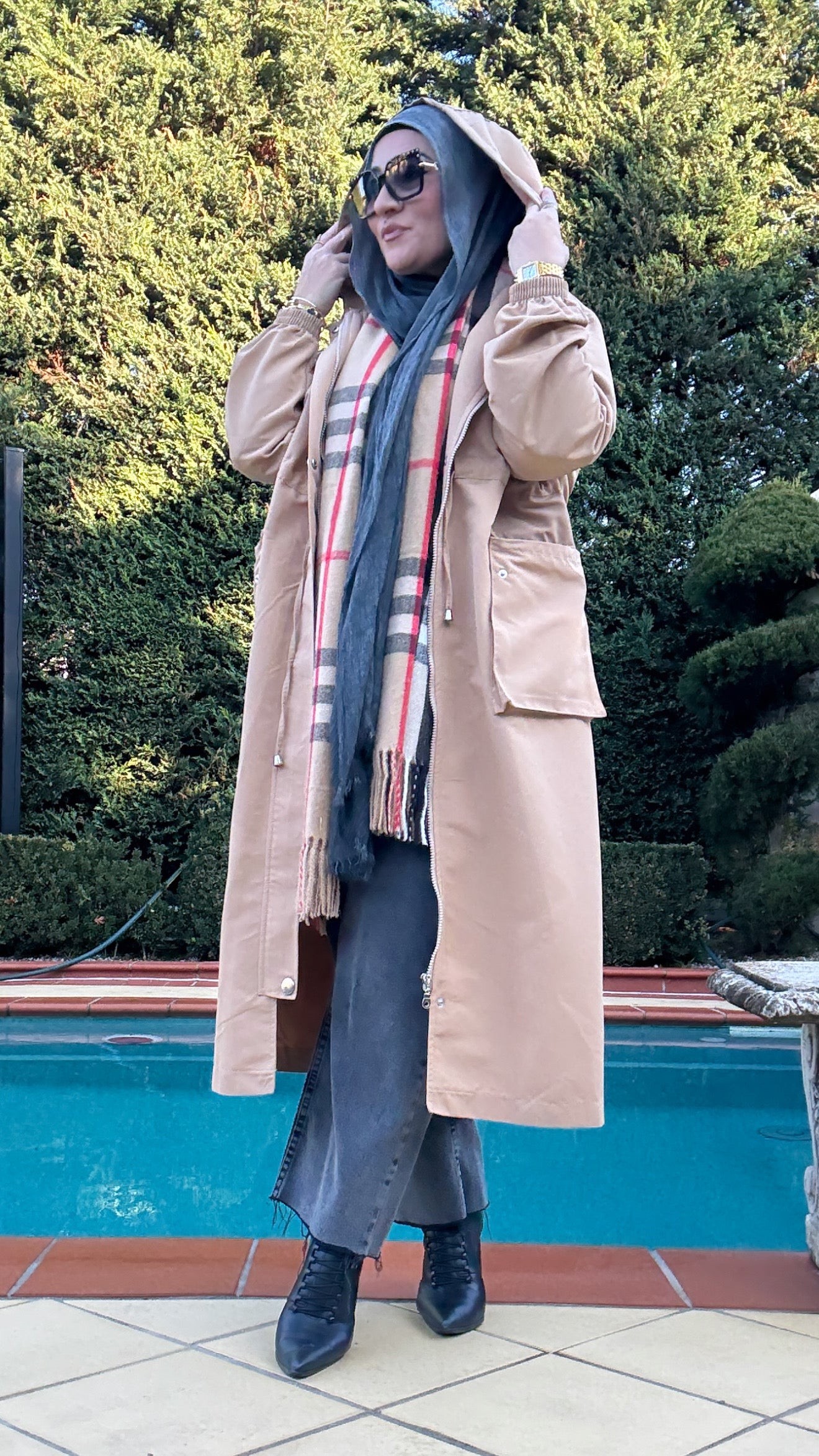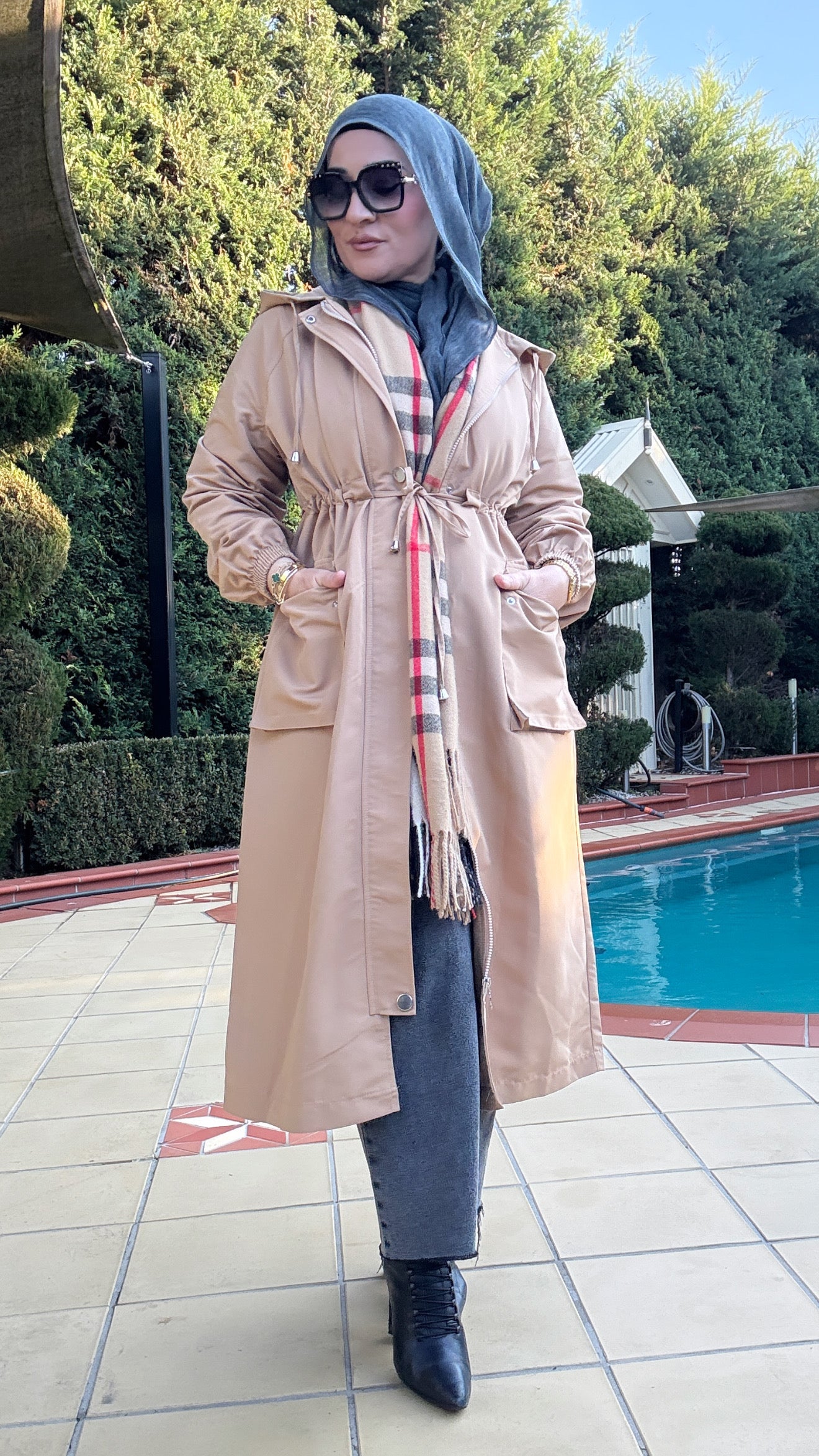 Description: The Drawstring Trench is a stunning trench. It has a drawstring hoodie, a drawstring waist, full zip and buttons, elastic cuff wrists and big front pockets.