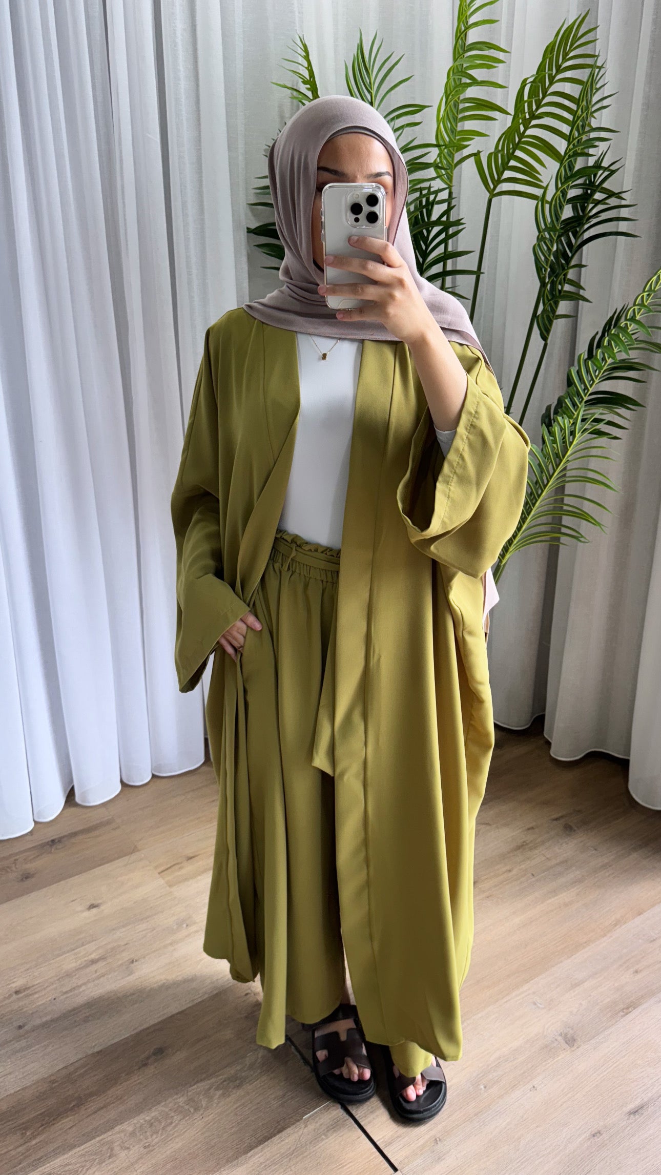 Description: The Gozde Set is a stunning set. It consists of a loose cardi, flared sleeves, comes with a belt and the pants have an elastic waist and loose fit.