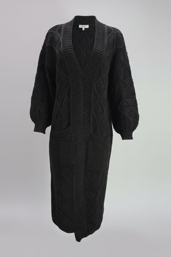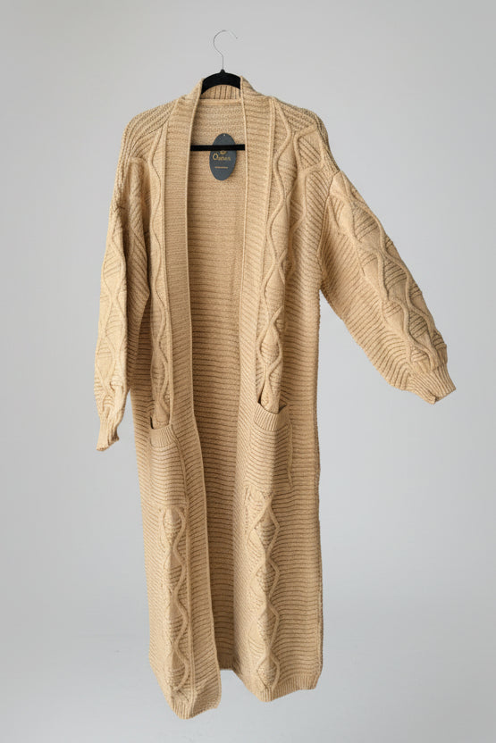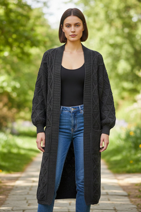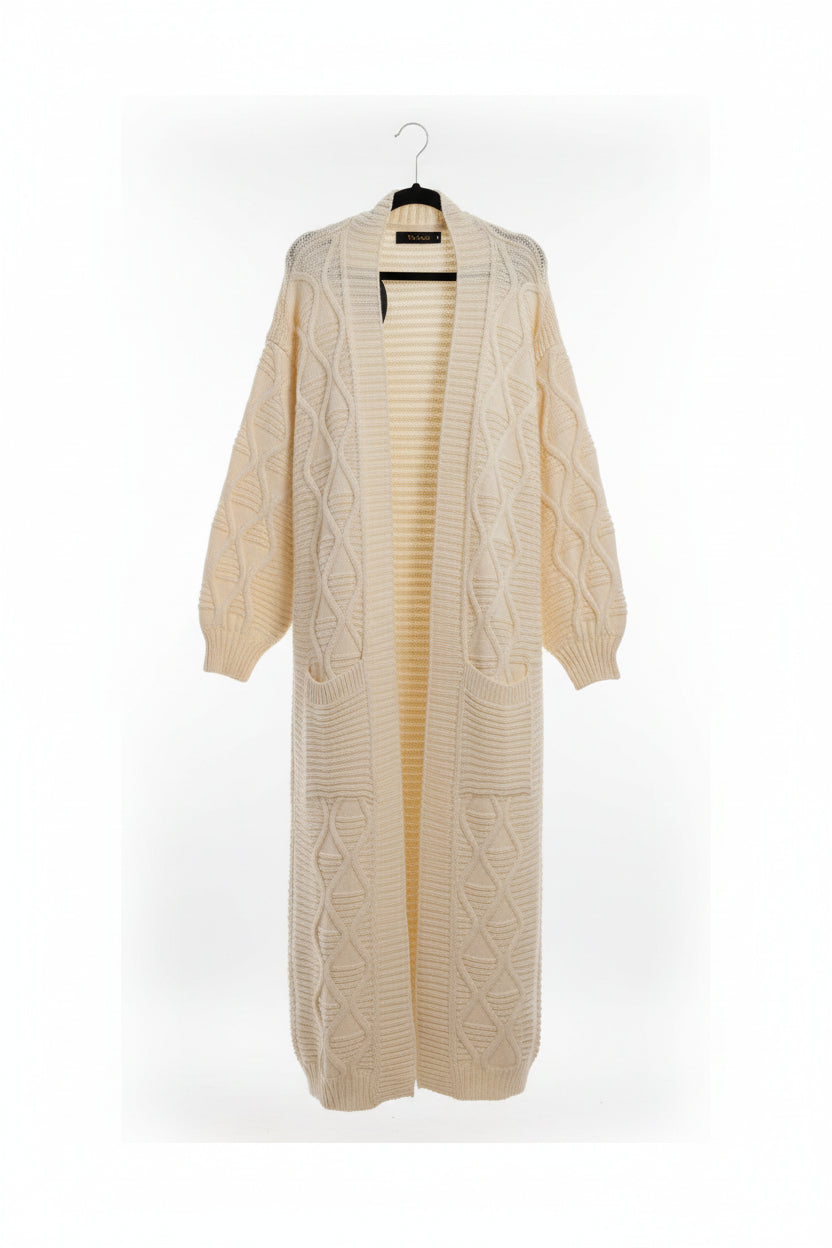 Description: The Hazar Cardigan combines timeless design with practical warmth, making it an essential layering piece for any season. This long cable cardigan features expertly crafted cable knit sleeves that add visual interest and tactile texture, while the relaxed fit ensures comfort without compromising on style. The generous length provides coverage and versatility, allowing you to layer it effortlessly over dresses, tees, or lightweight sweaters. The structured cable knit construction offers superior insulation, keeping you warm during cooler months while remaining breathable enough for transitional weather. Whether worn open as a throw layer or buttoned for a polished look, the Hazar Cardigan adapts to your personal style and wardrobe needs. A sophisticated investment piece that transcends seasonal trends and pairs seamlessly with your existing collection.