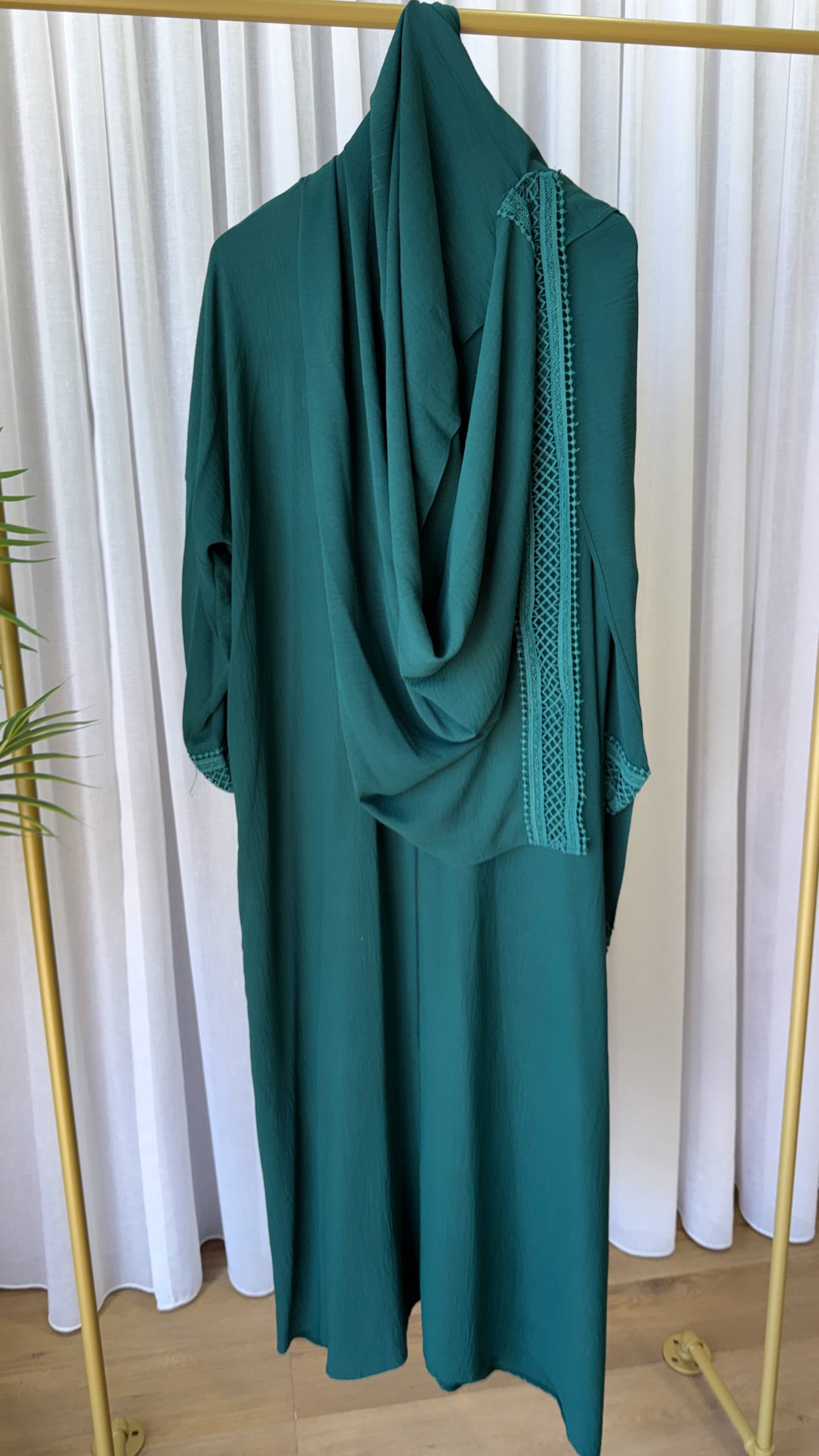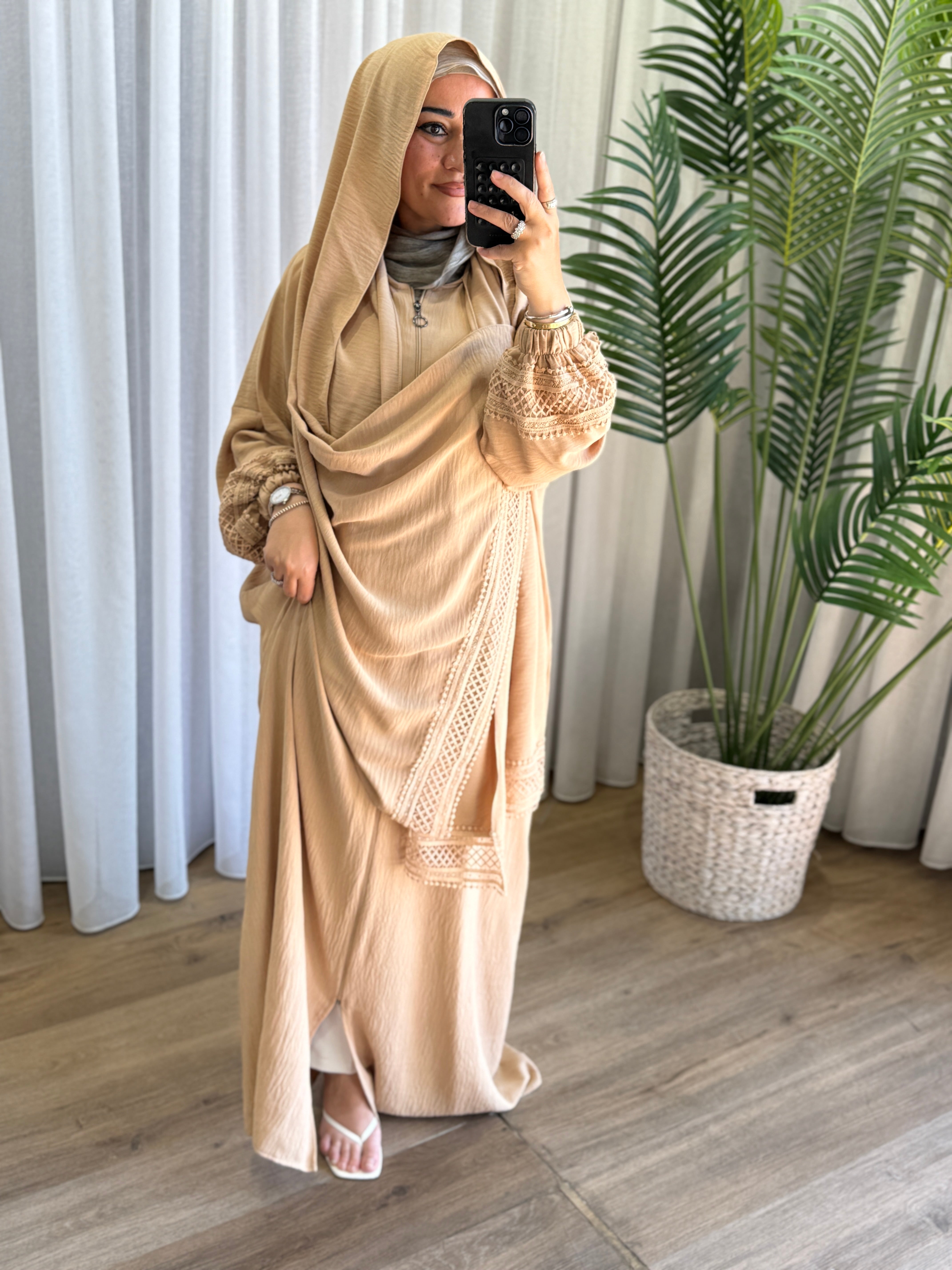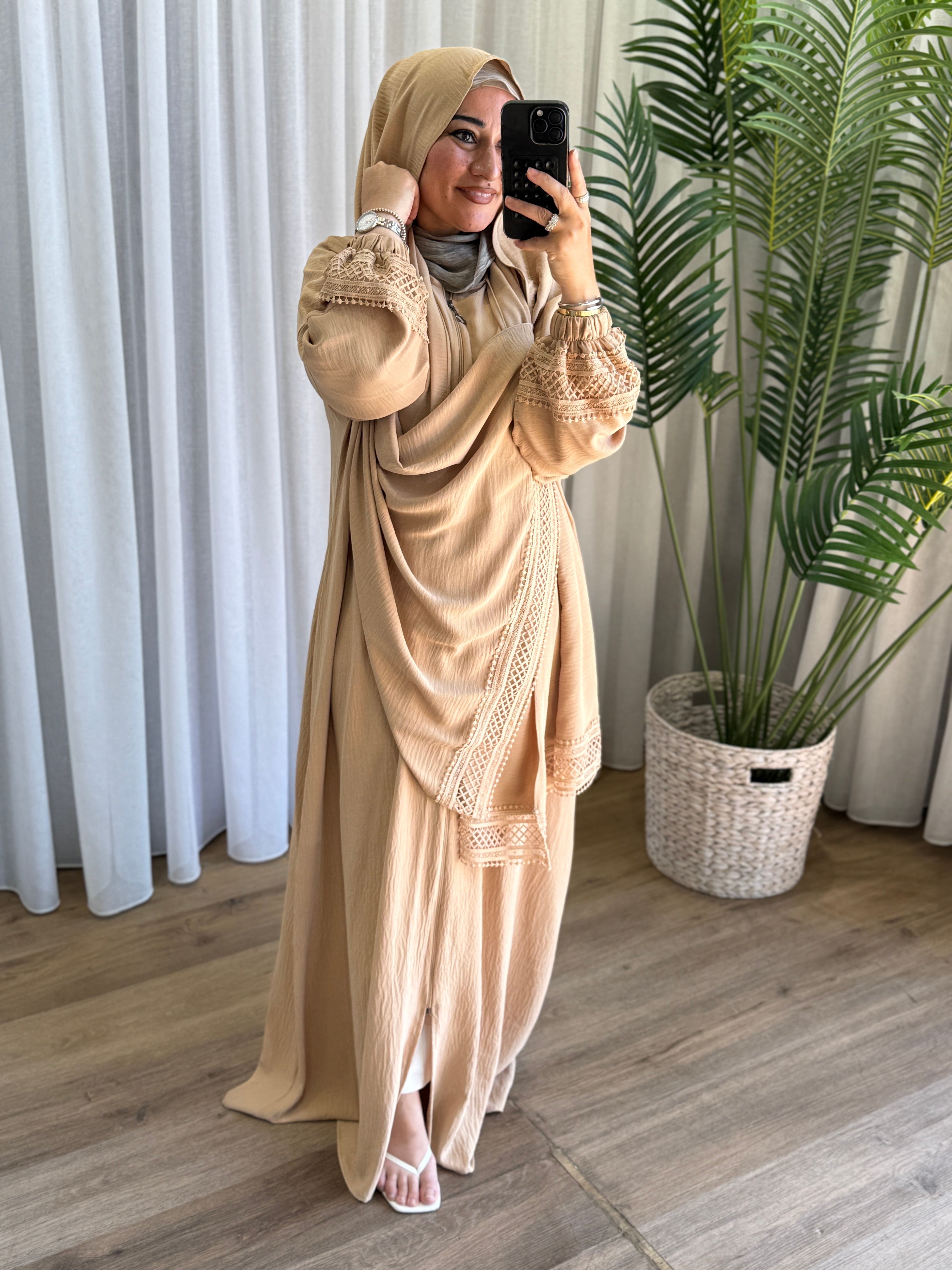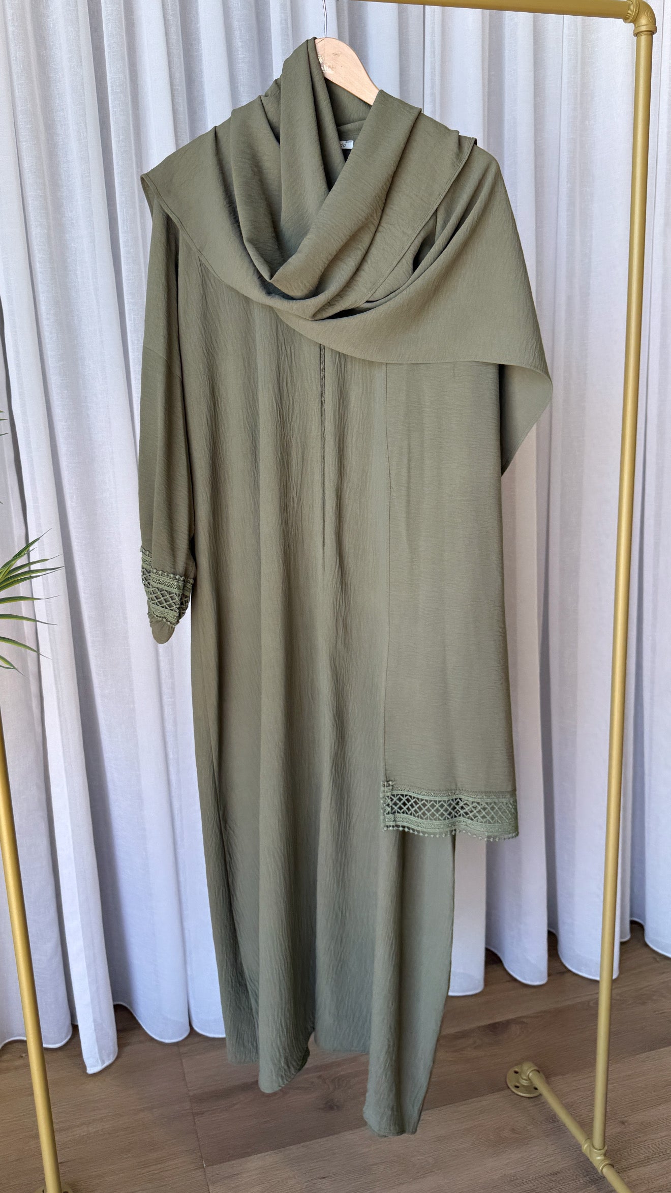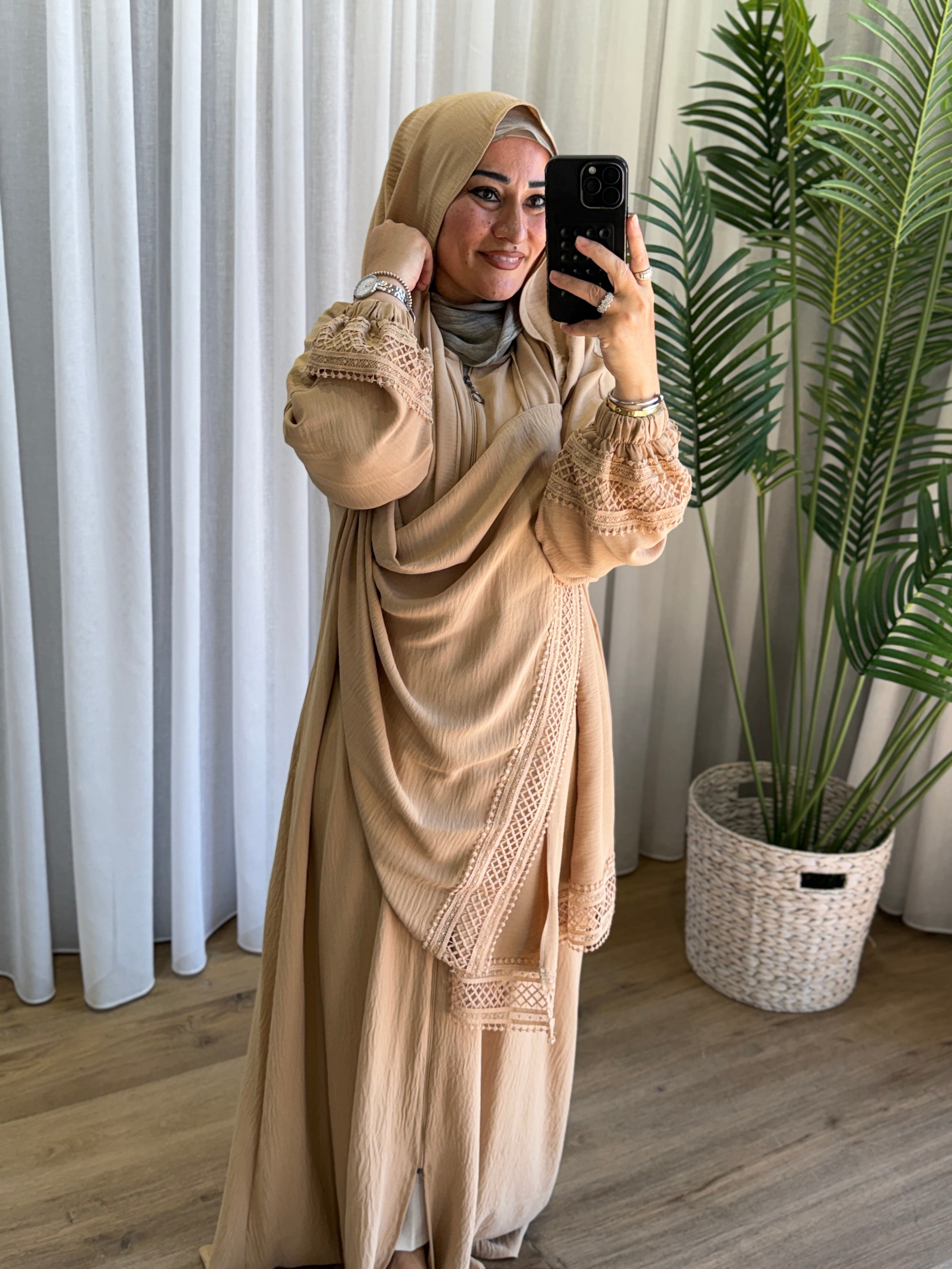 Description: This hijab abaya is designed with both style and modesty. It features a zipper for ease of wear and is adorned with delicate lace sleeves, finished with comfortable cuffs. The attached hijab adds a touch of elegance and sophistication to the overall look, while also maintaining coverage.