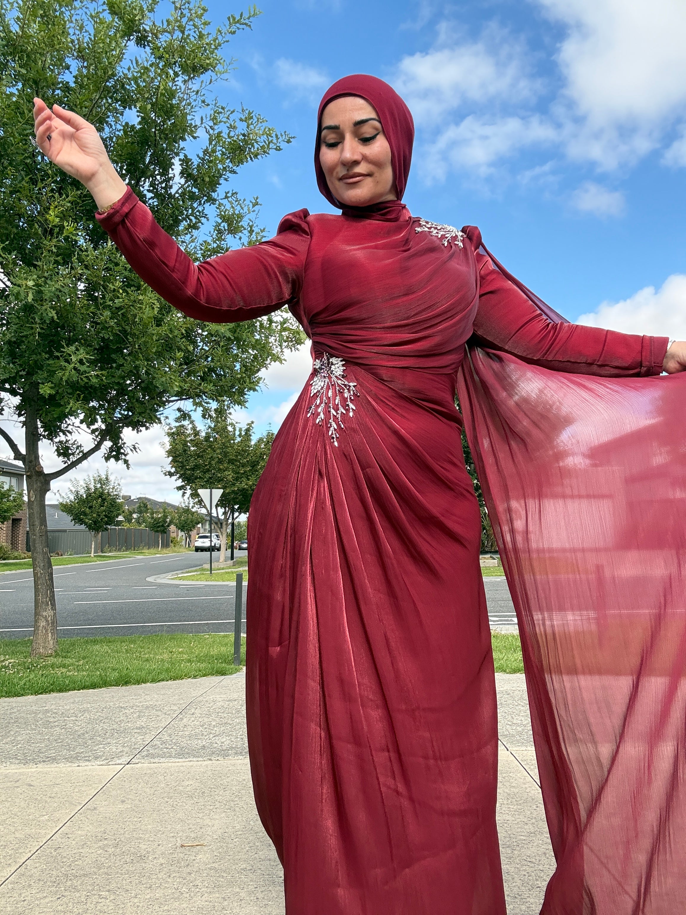 Description: The Hydrangea Dress is a stunning dress. It has a beautiful drape at the sleeve. It has a sinched waist and it has sequin features at the shoulder and waist. The dress has straight arms and is a straight dress,