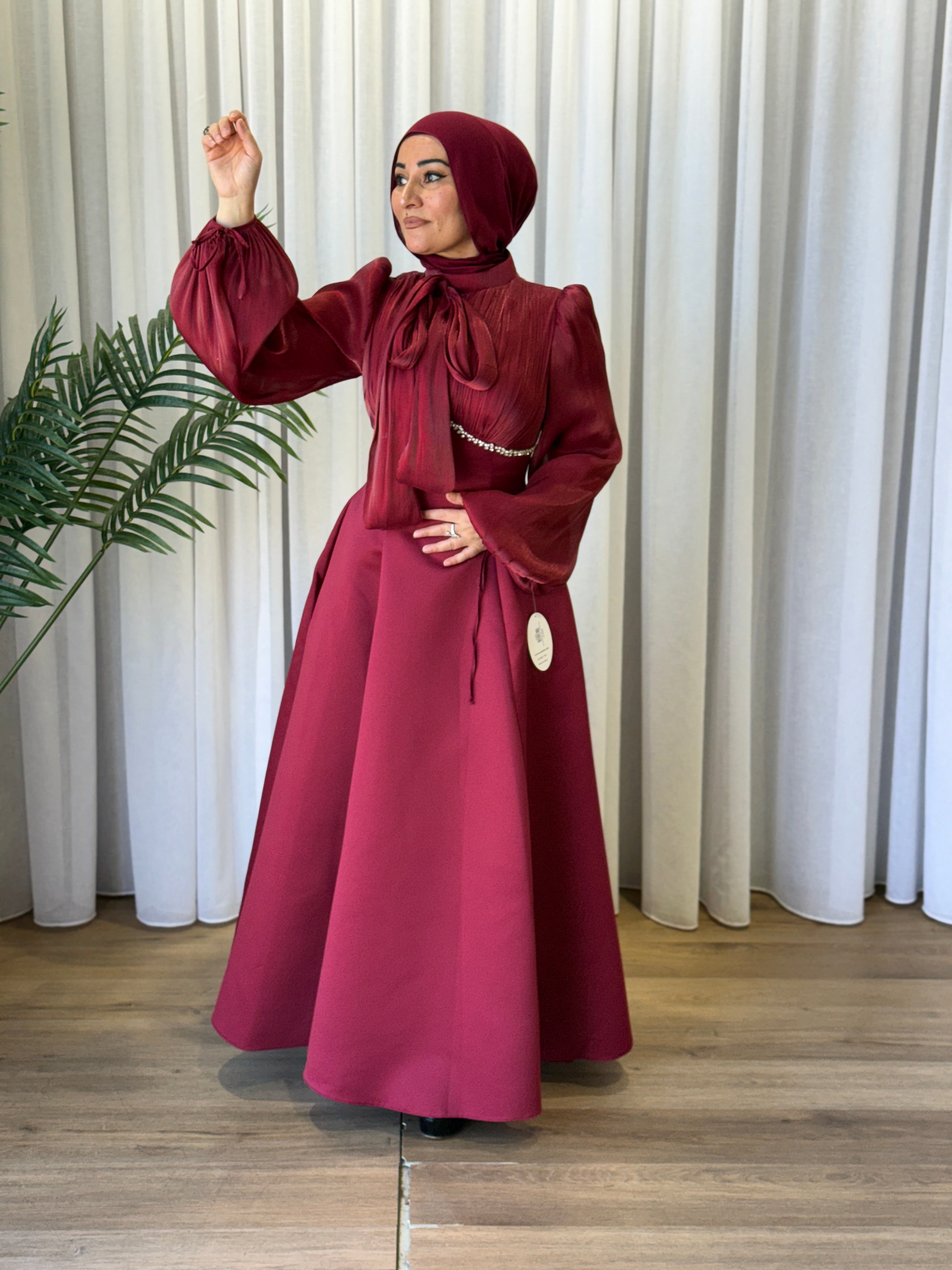 Description: The Iris Dress is a stunning dress. It features beautiful Tie up sleeves. There is ruching on chest and diamantes under. It also features an elegant tie up detail.