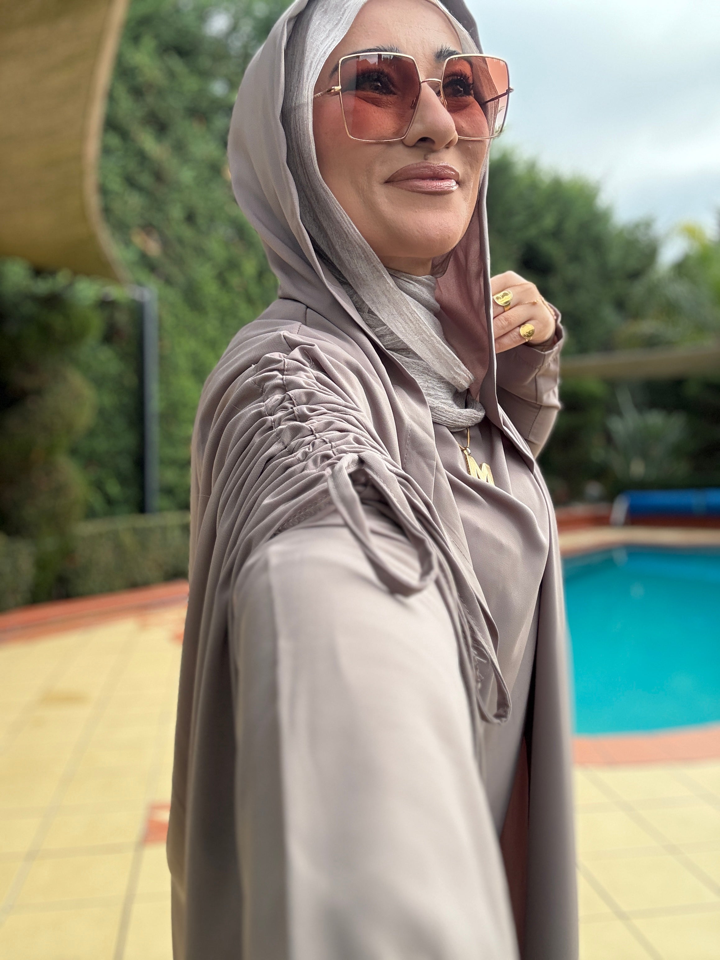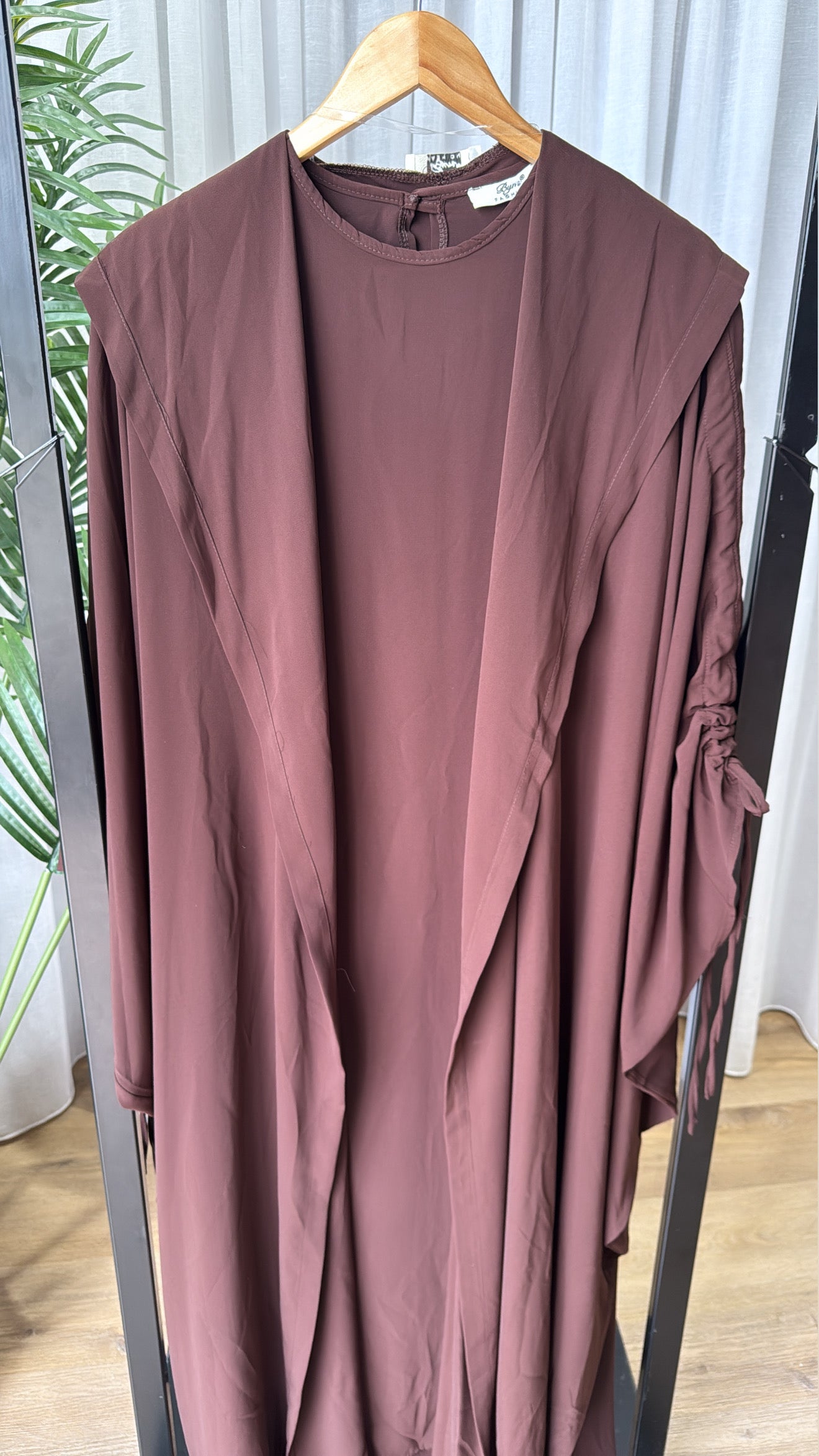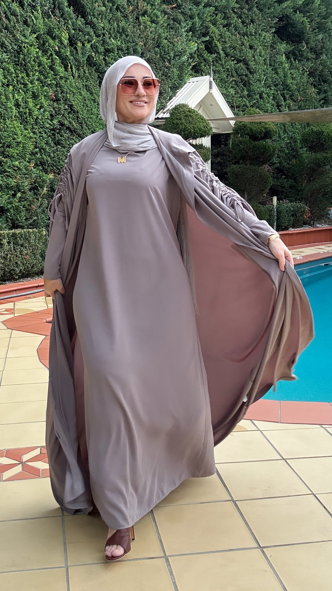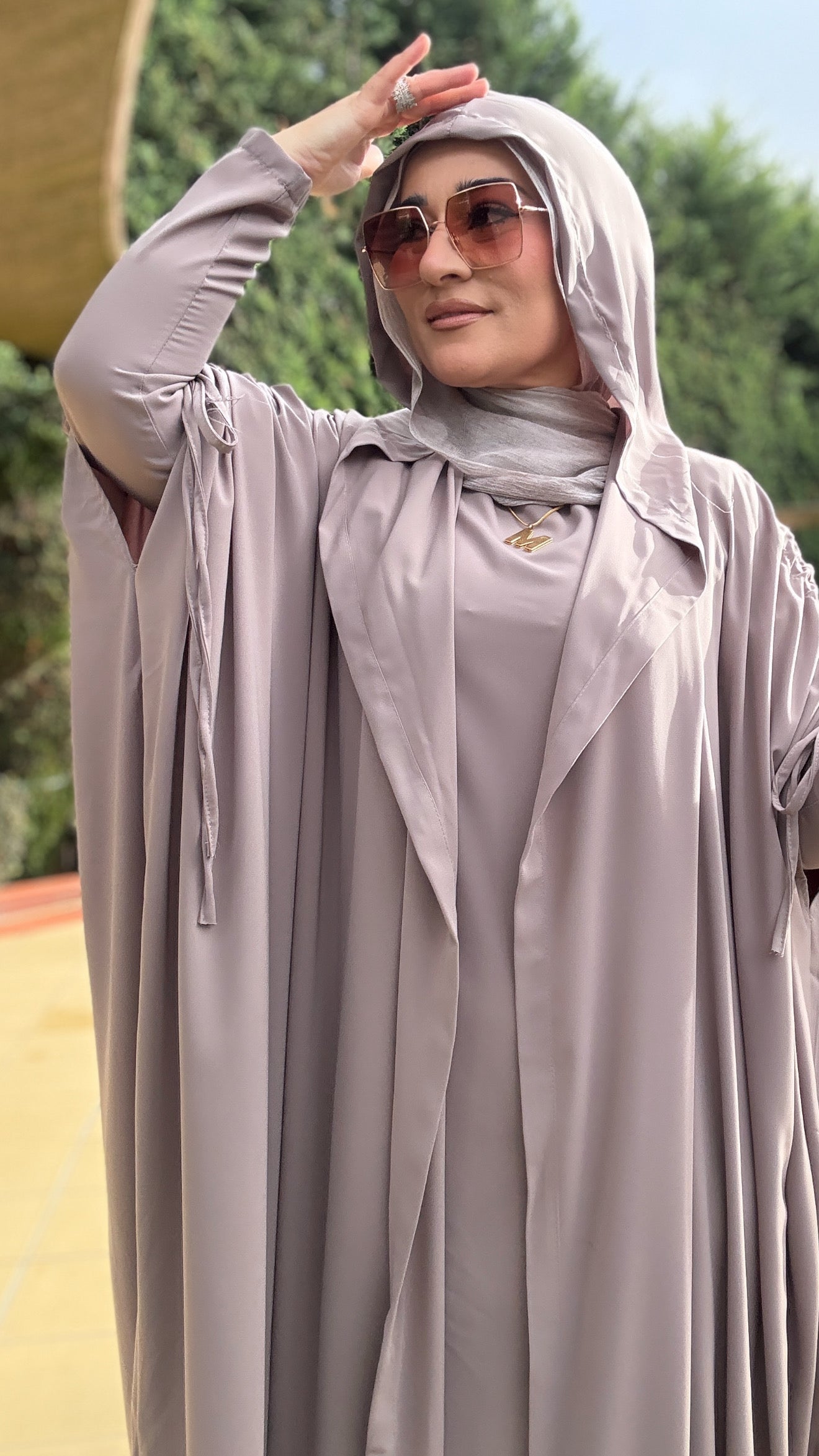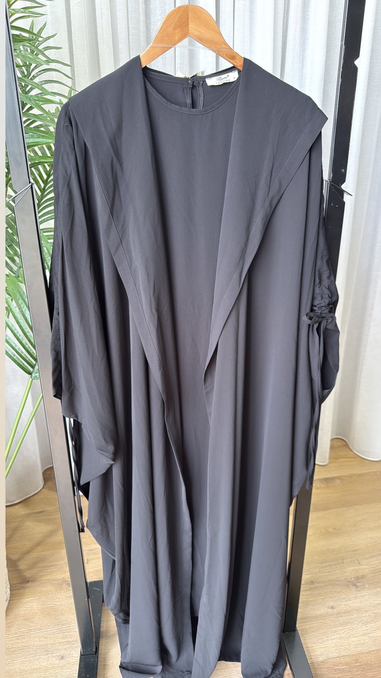 Description: The Jade Abaya is a stunning abaya. It consists of an inner, basic long sleeve dress. The outer cape is a batwing cape with drawstring arm deails and hood.