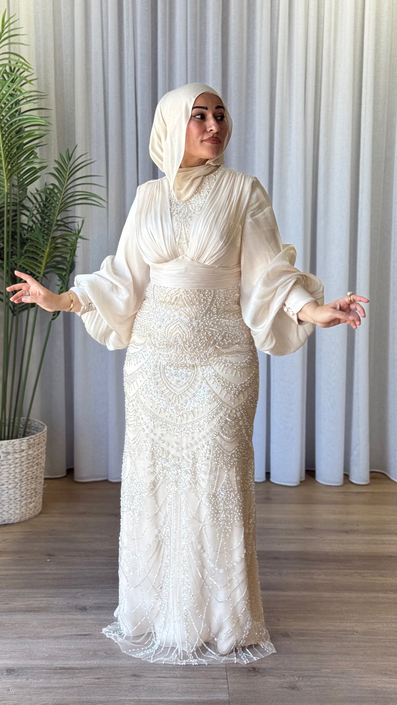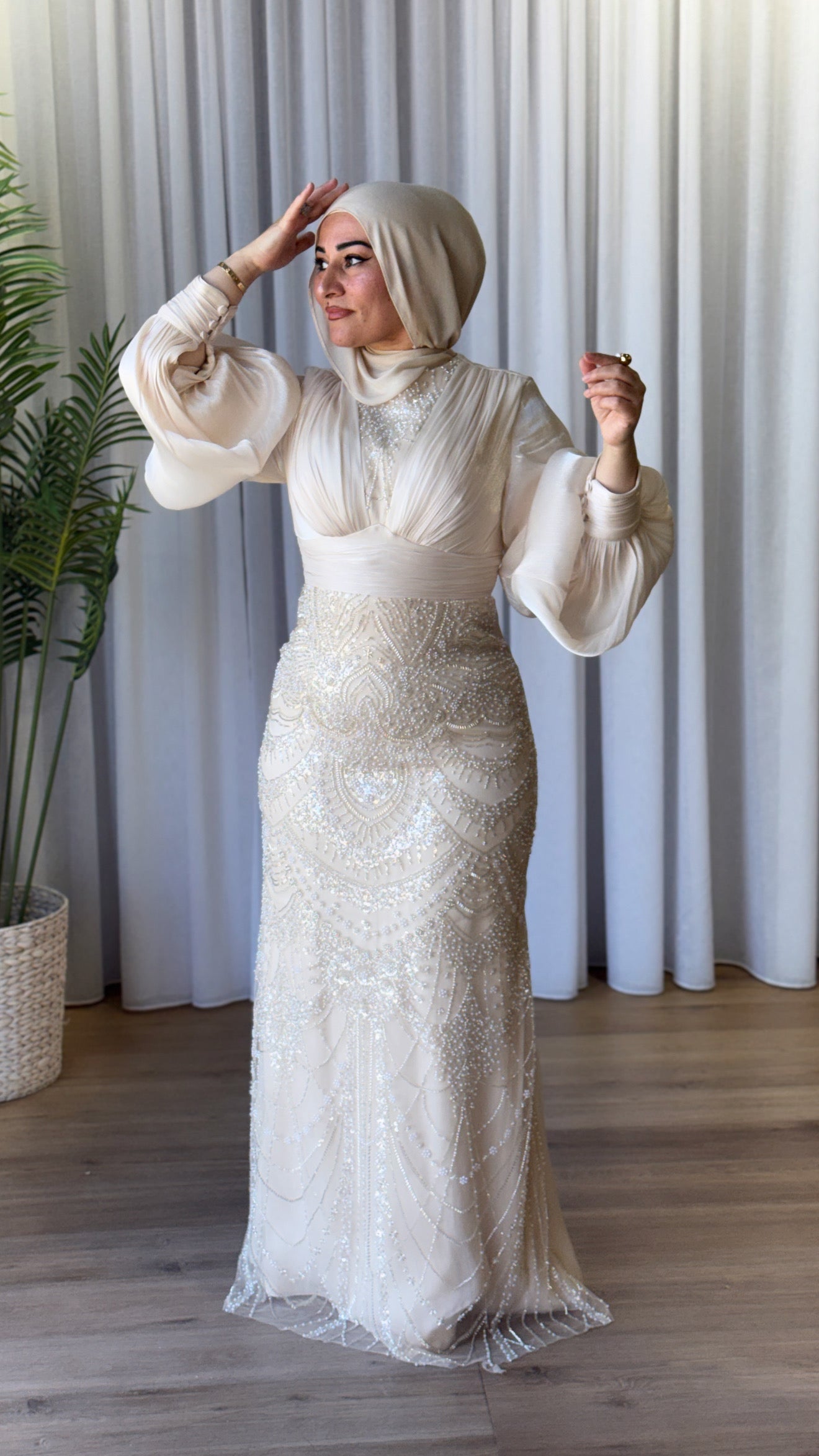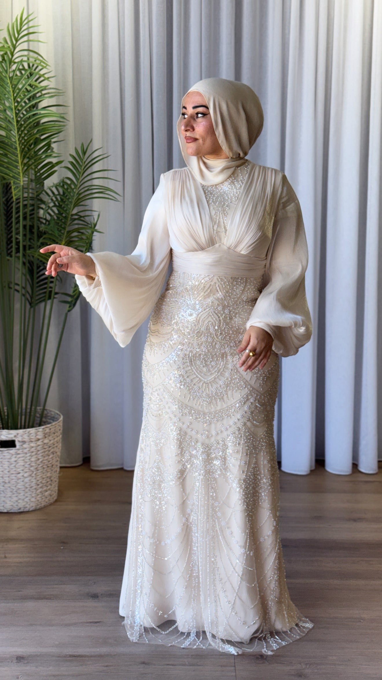 Description: The Jasmine Dress is a beautiful dress. The gown is floor length and features diamantes on the front of the dress with a plain back. The sleeves come out and have cuffed wrists. There is a swoop feature on the chest and waist detailing to allow the dress to flatter the body.