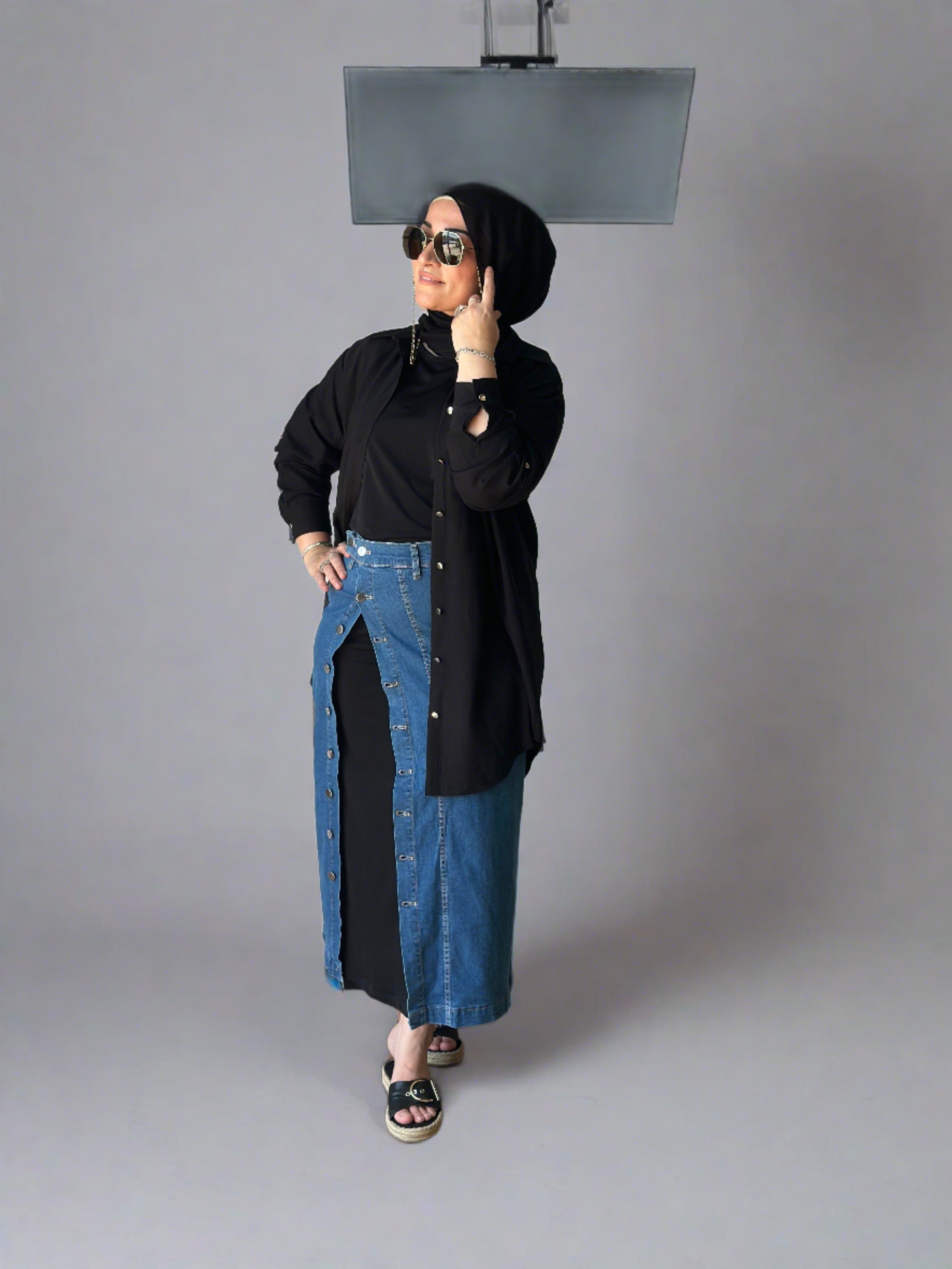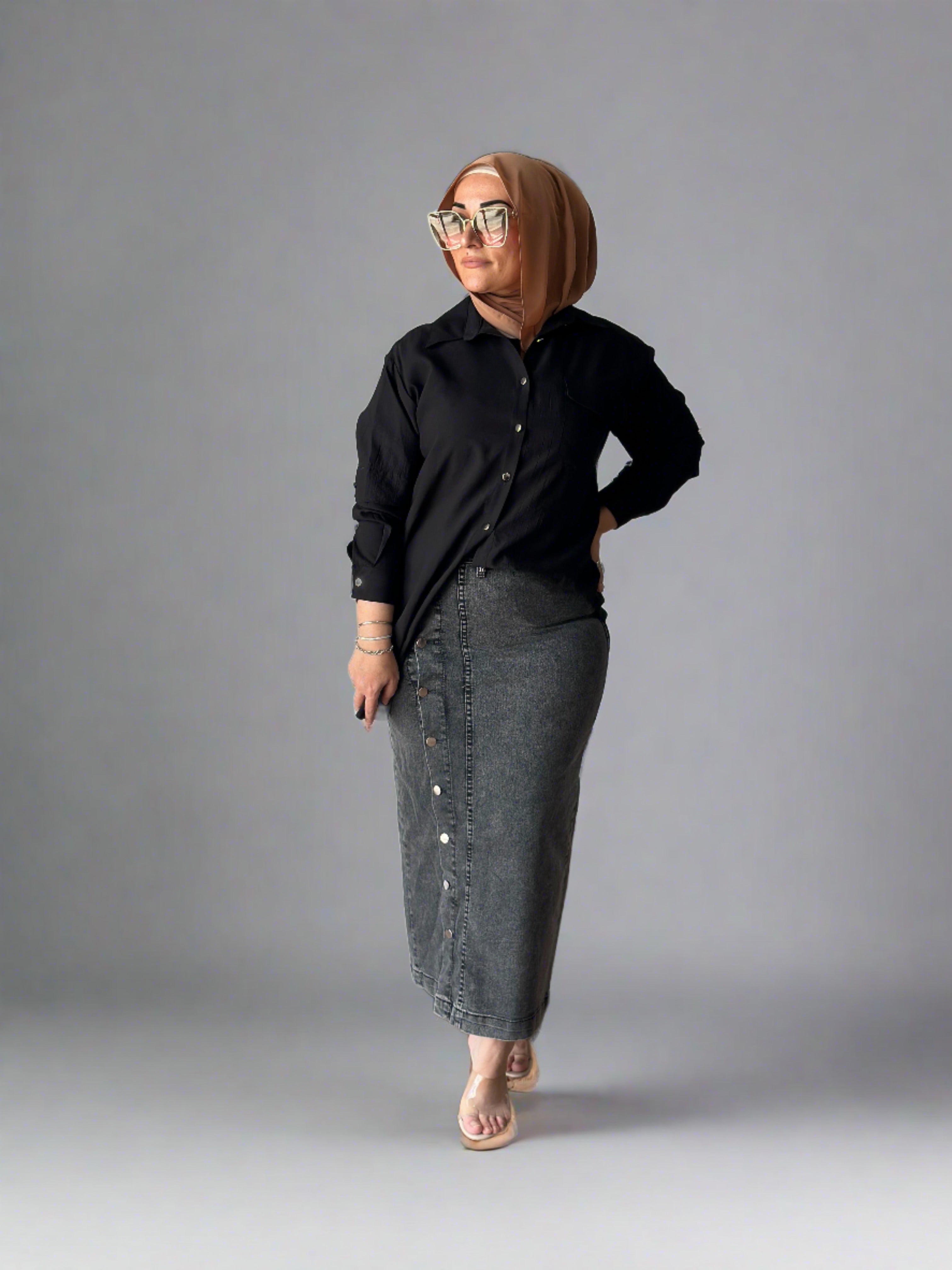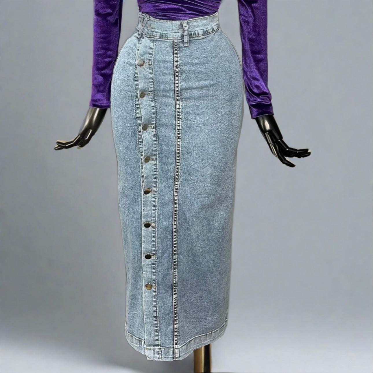 Description: The Jihan Skirt is a denim skirt that can be paired with anything. It has full buttons going down and a bit of a stretch.