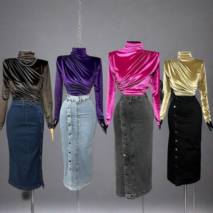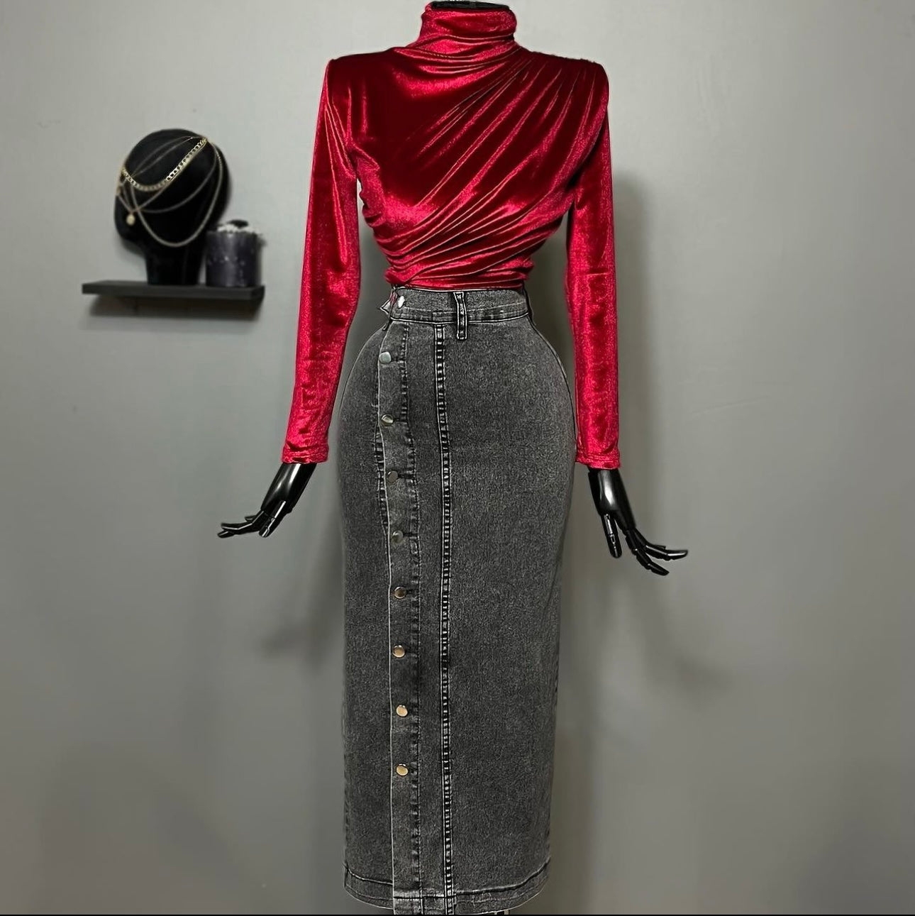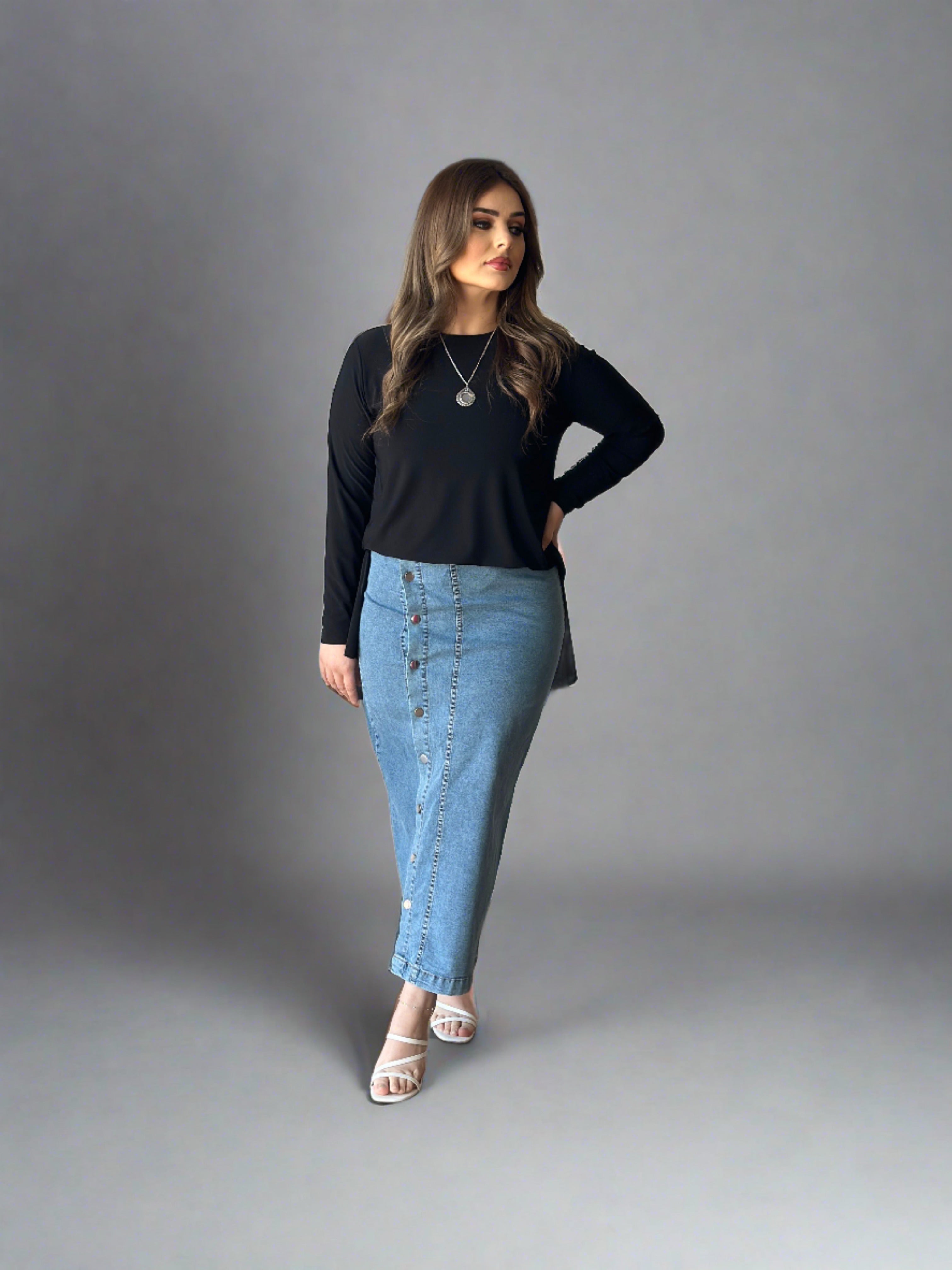 Description: The Jihan Skirt is a denim skirt that can be paired with anything. It has full buttons going down and a bit of a stretch.