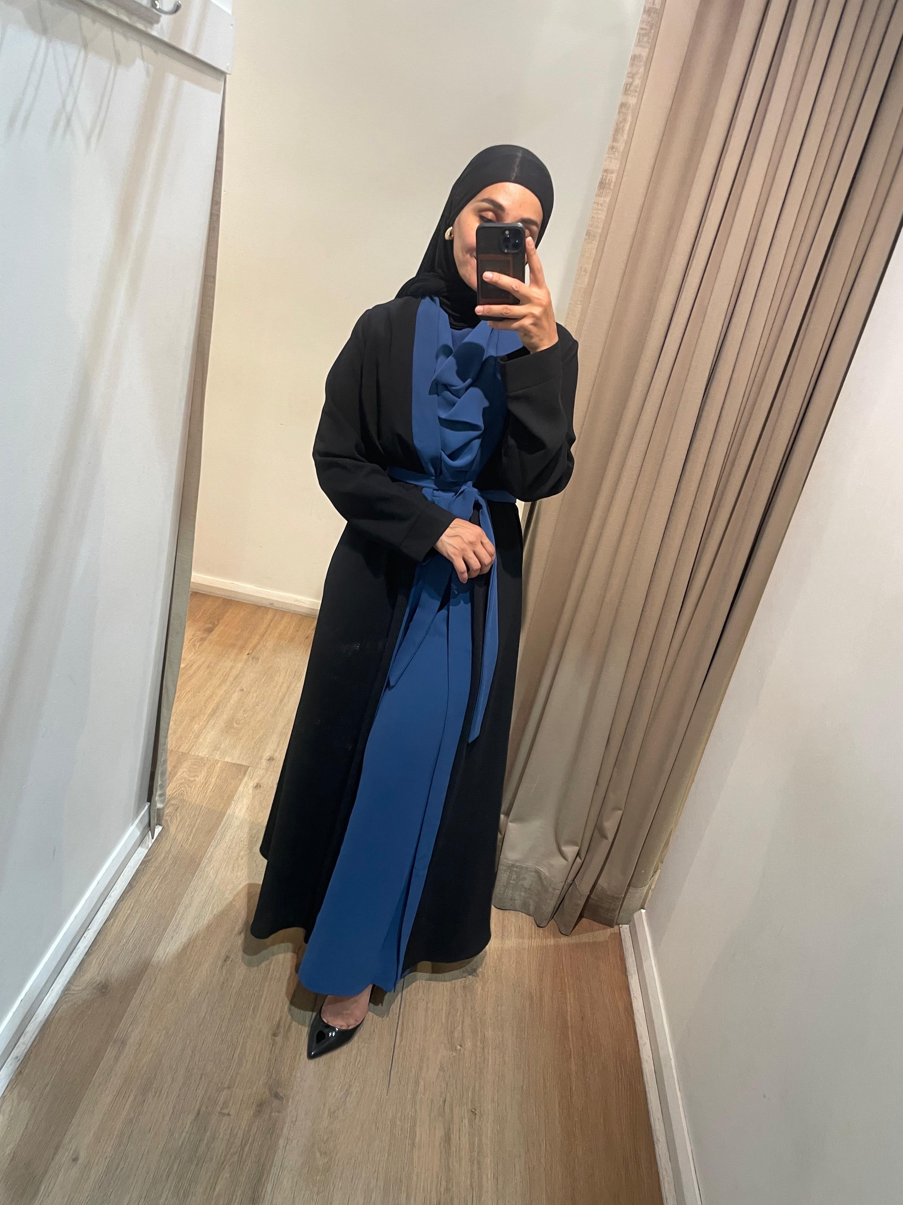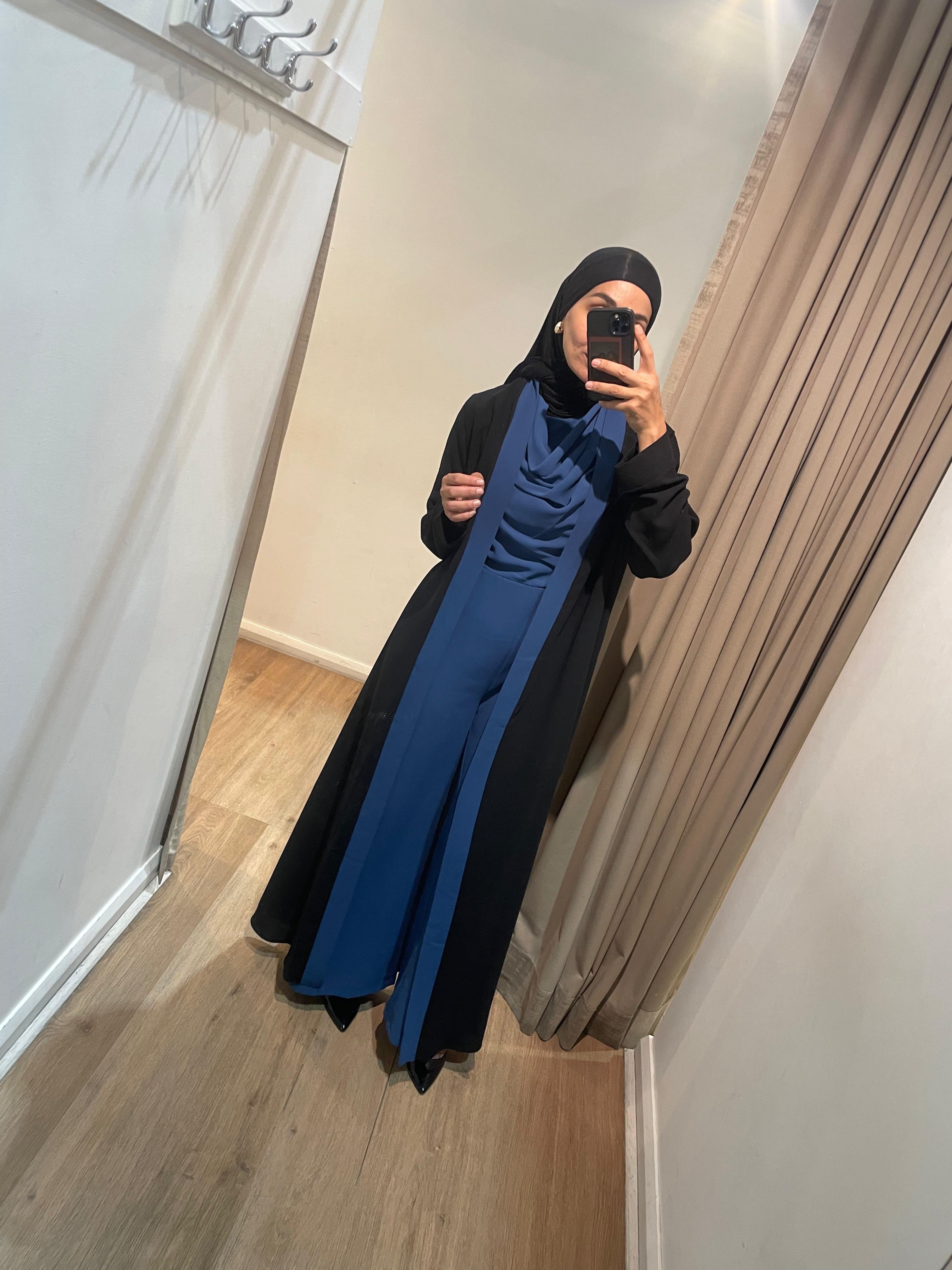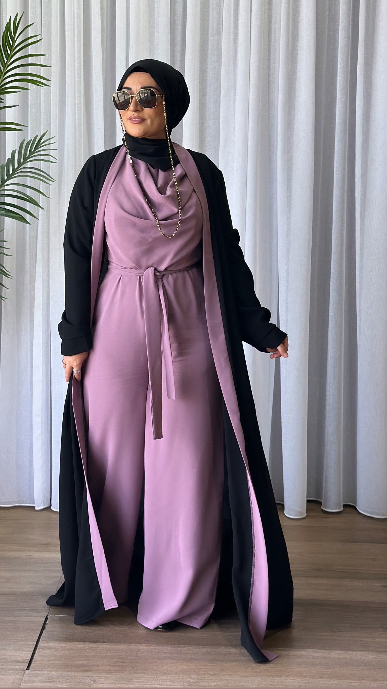 Description: The Jumpsuit Abaya is a stunning two-piece abaya. The inner is a sleeveless jumpsuit with drape detailing on the chest, and the outer abaya fits to size. Also, comes with a belt.