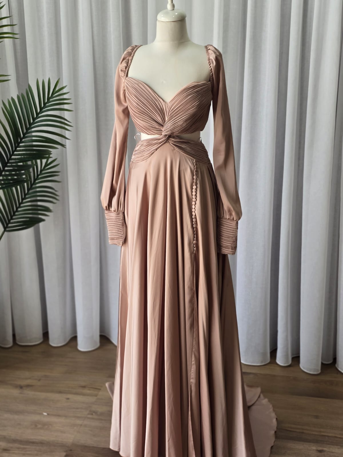 Description: The Katy Dress is a stunning formal dress. It has an open neckline, long sleeves, and open sides on the waist. It also has decorative buttons on the dress and the cuffs are button cuffs. Extremely elegant and a showstopper.