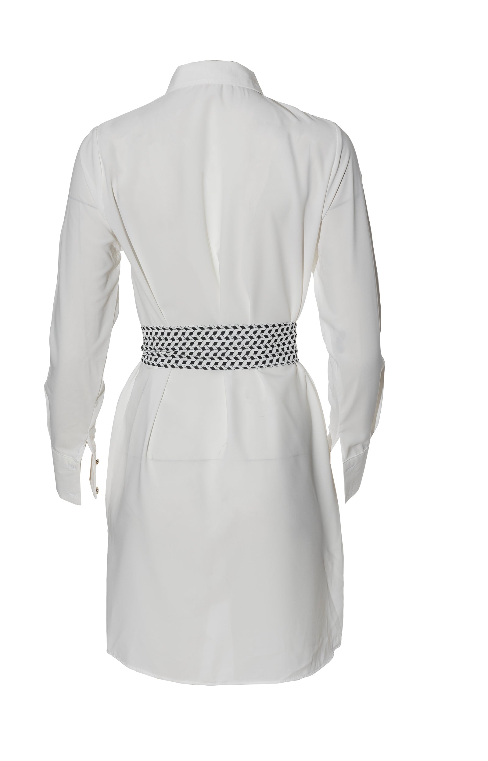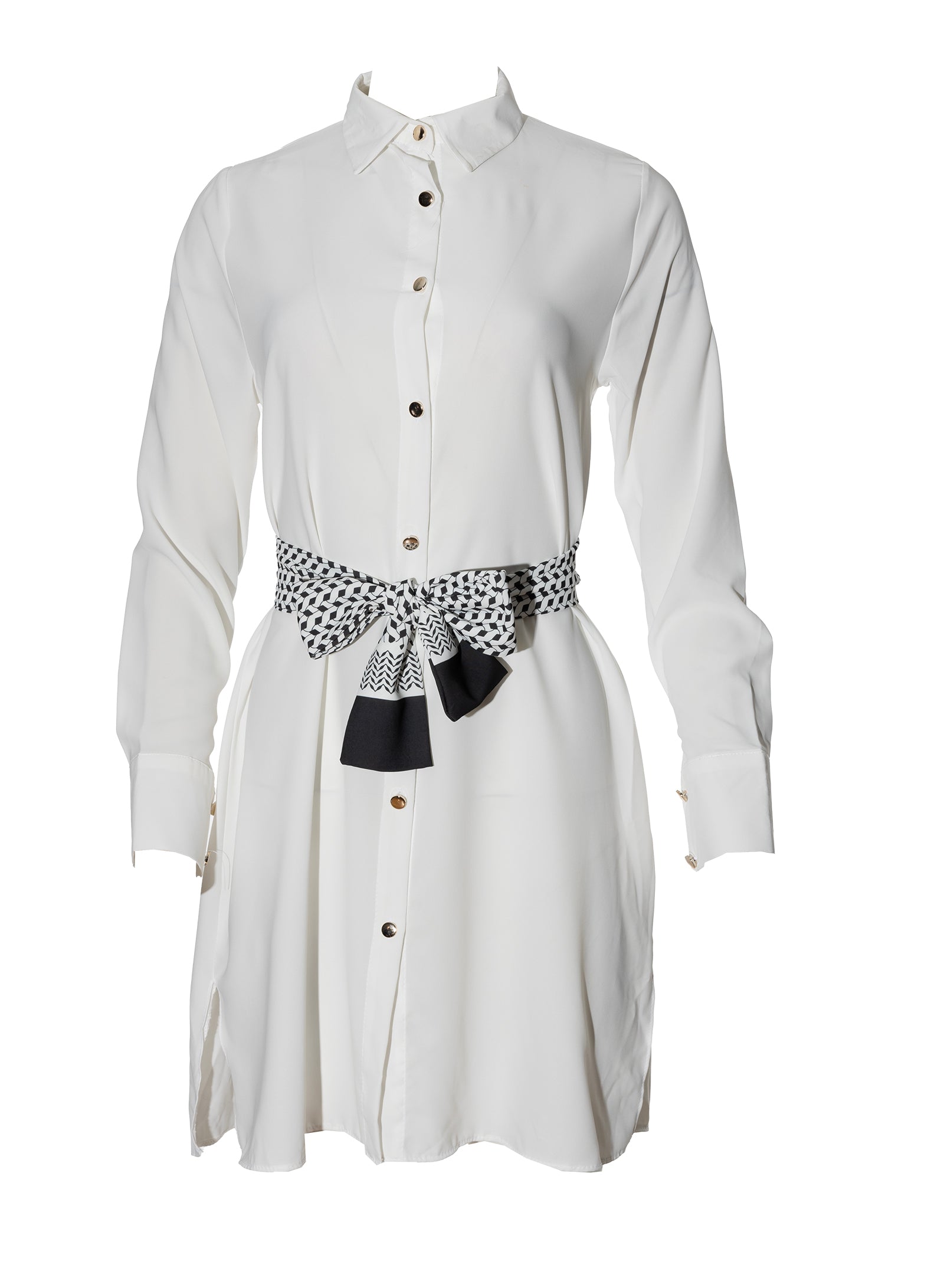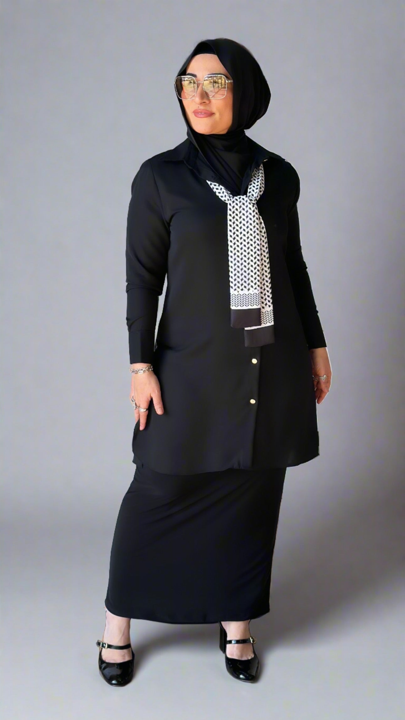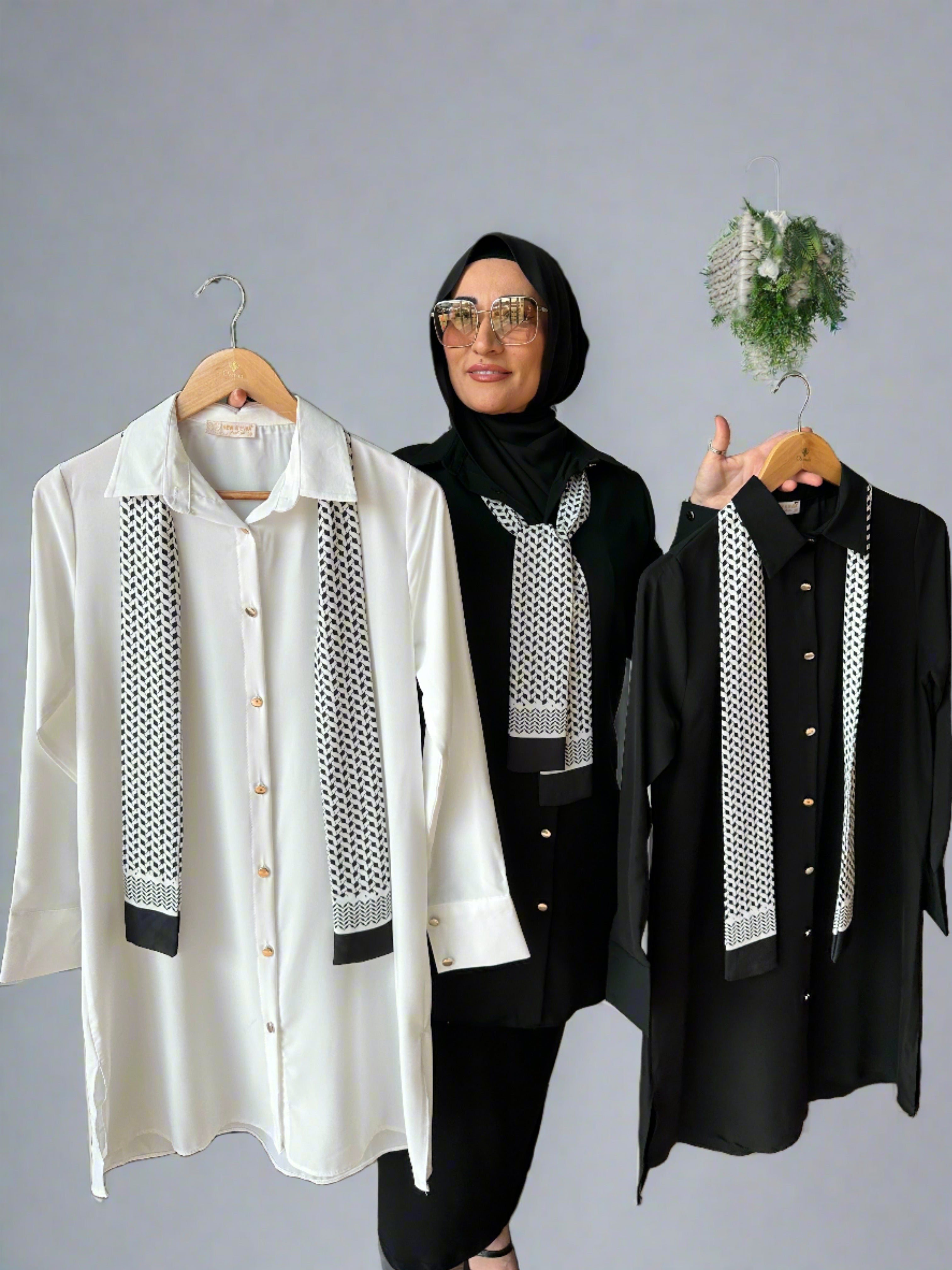 Description: The Keffiyeh Tunic is a stunning button up. It is long, collared, full length gold buttons, button cuff wrists and side splits. It also has a skinny keffiyeh scarf that goes under the collar or can be styled how you like it.