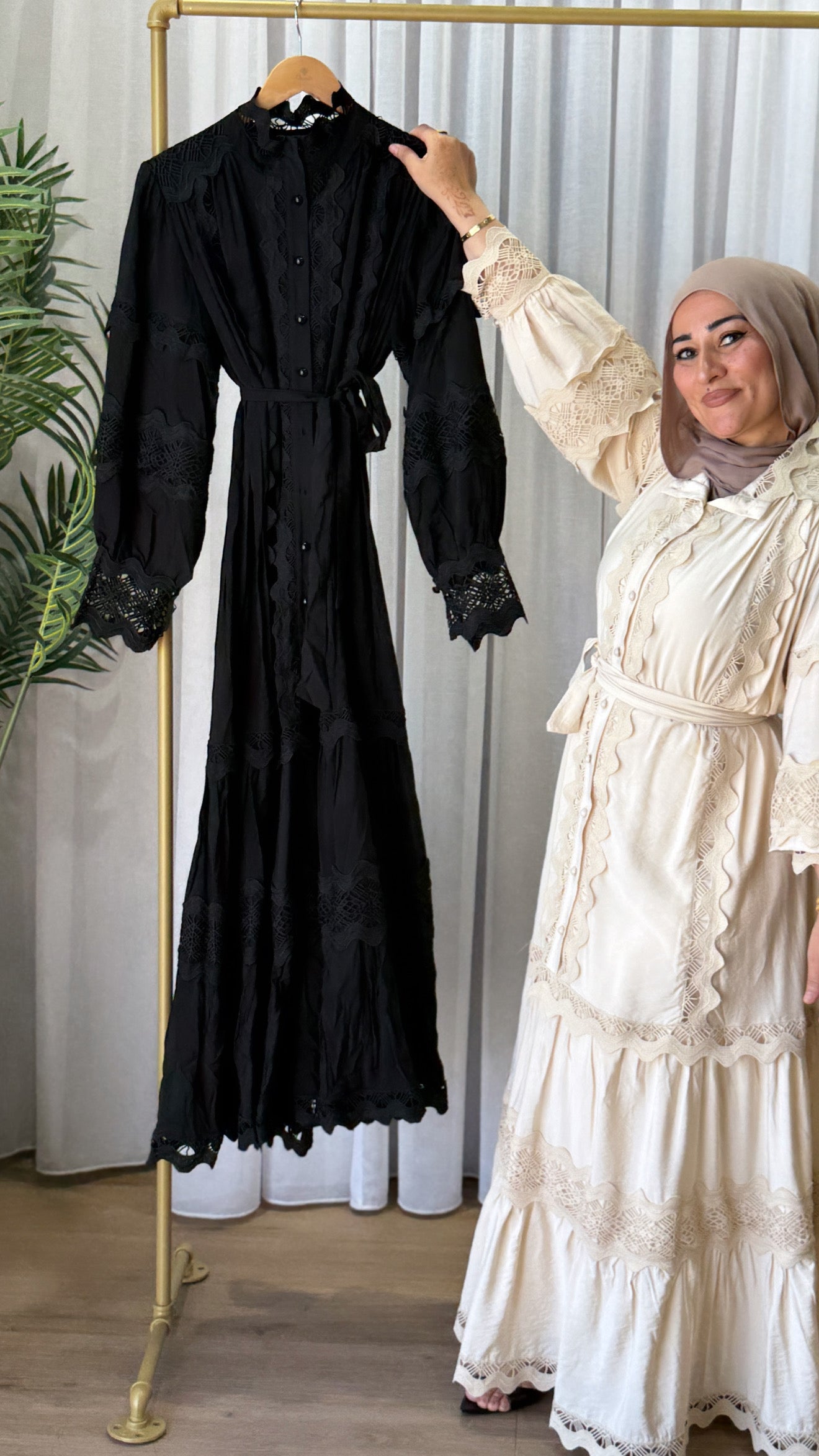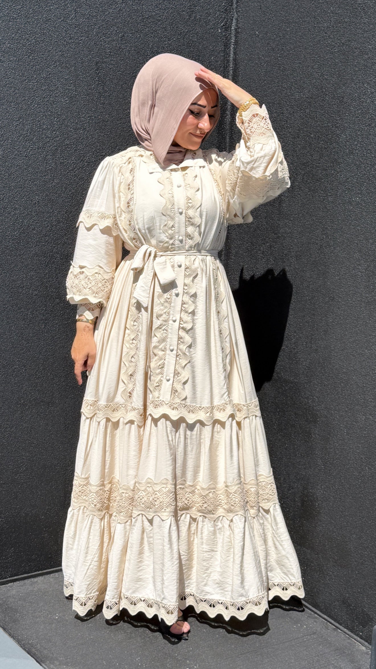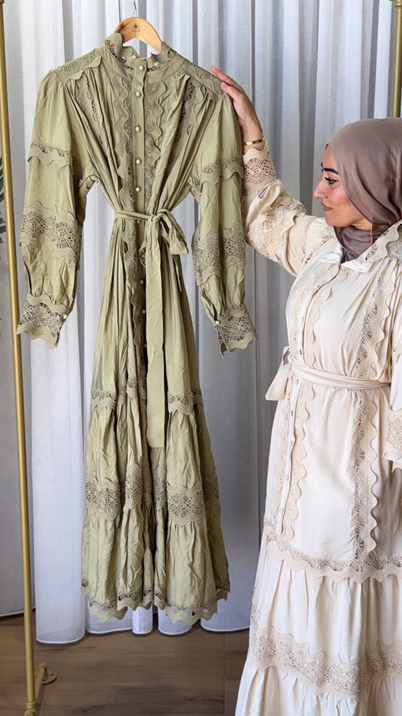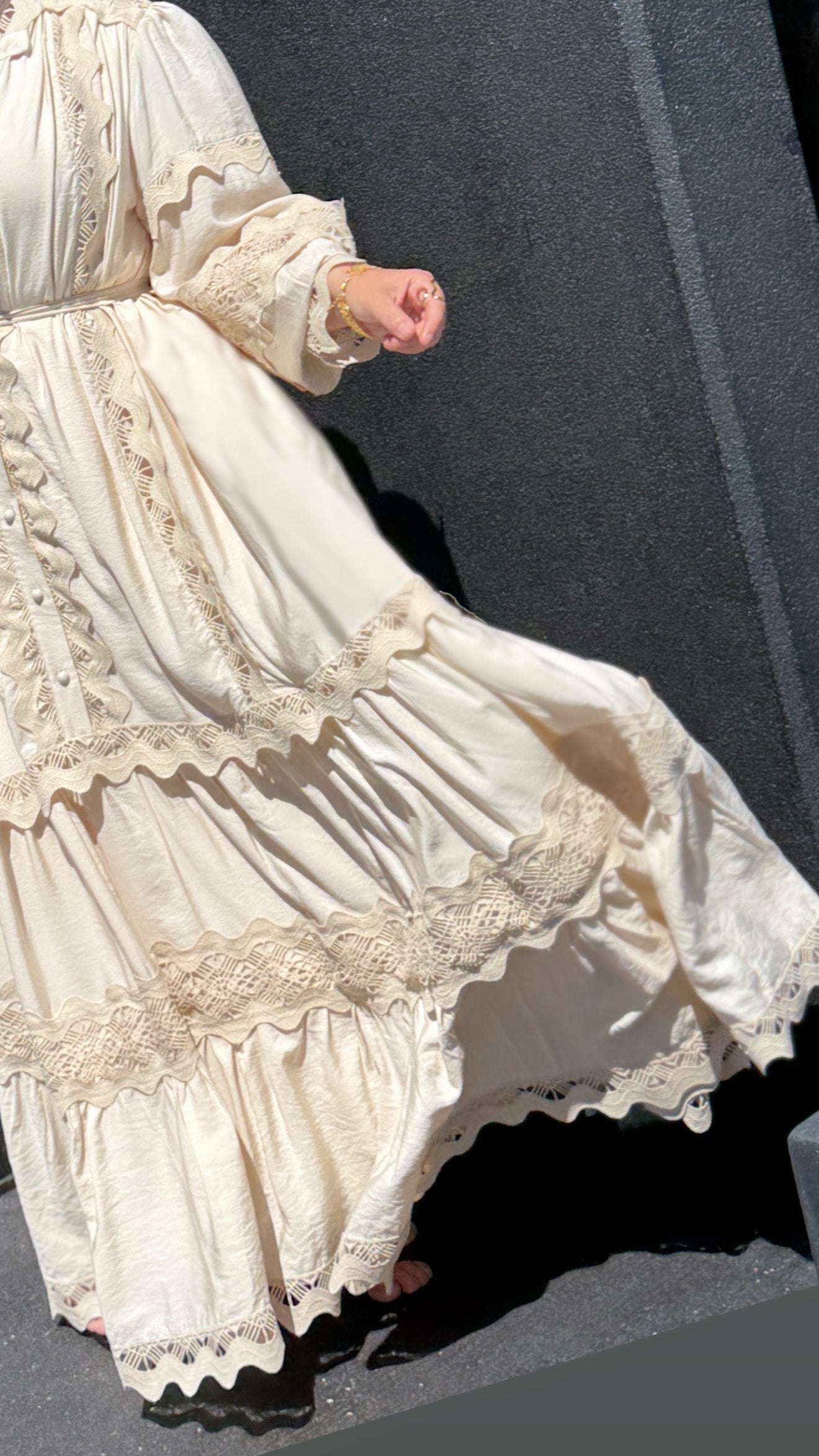 Description: The LACE DRESS epitomizes refined versatility. A high-neck button-up design with delicate lace detailing creates an elegant foundation, while the tie-up closure allows you to adjust the fit with ease. Subtle pleats add dimension and movement, making this piece ideal for layering across seasons.