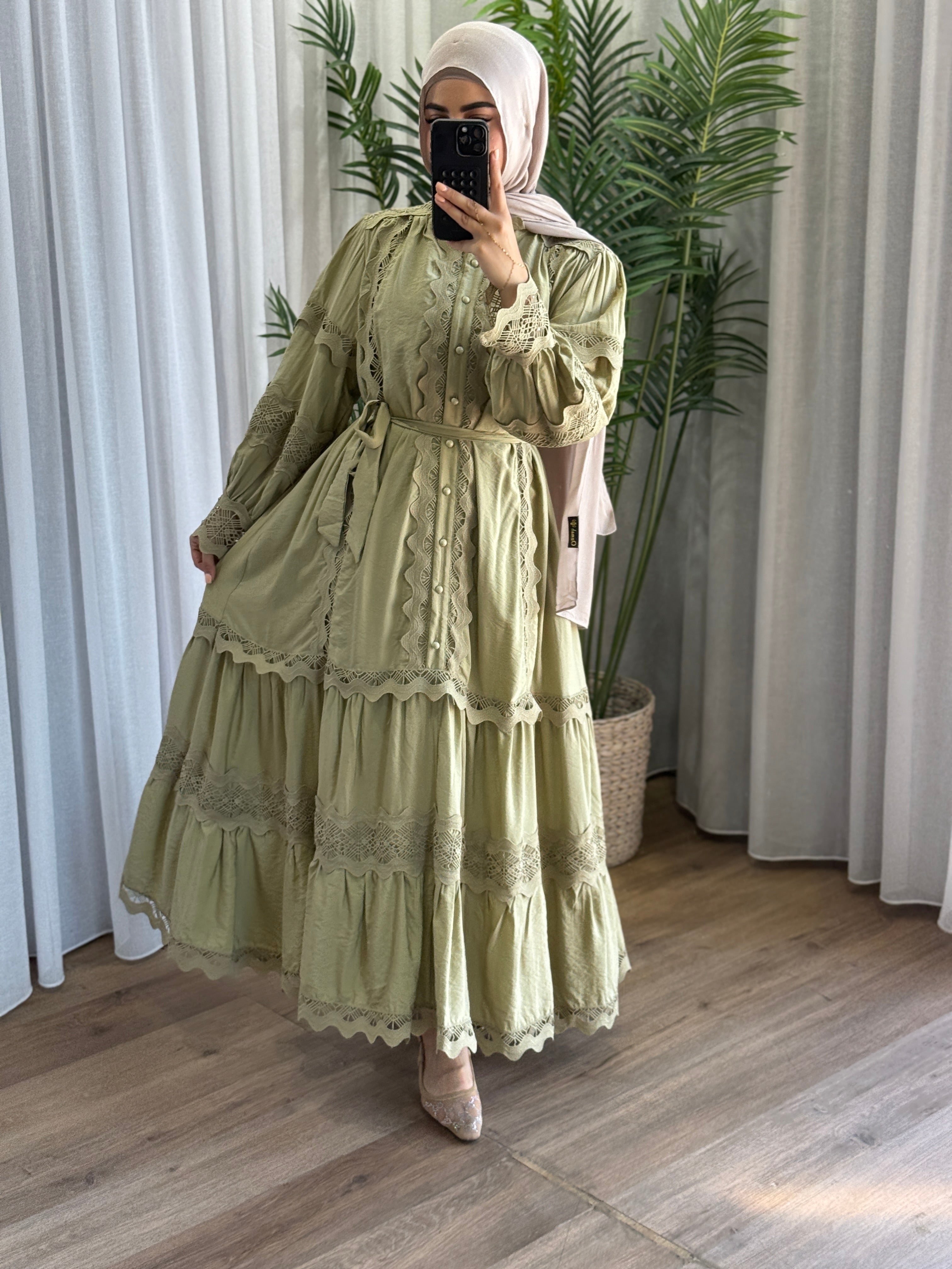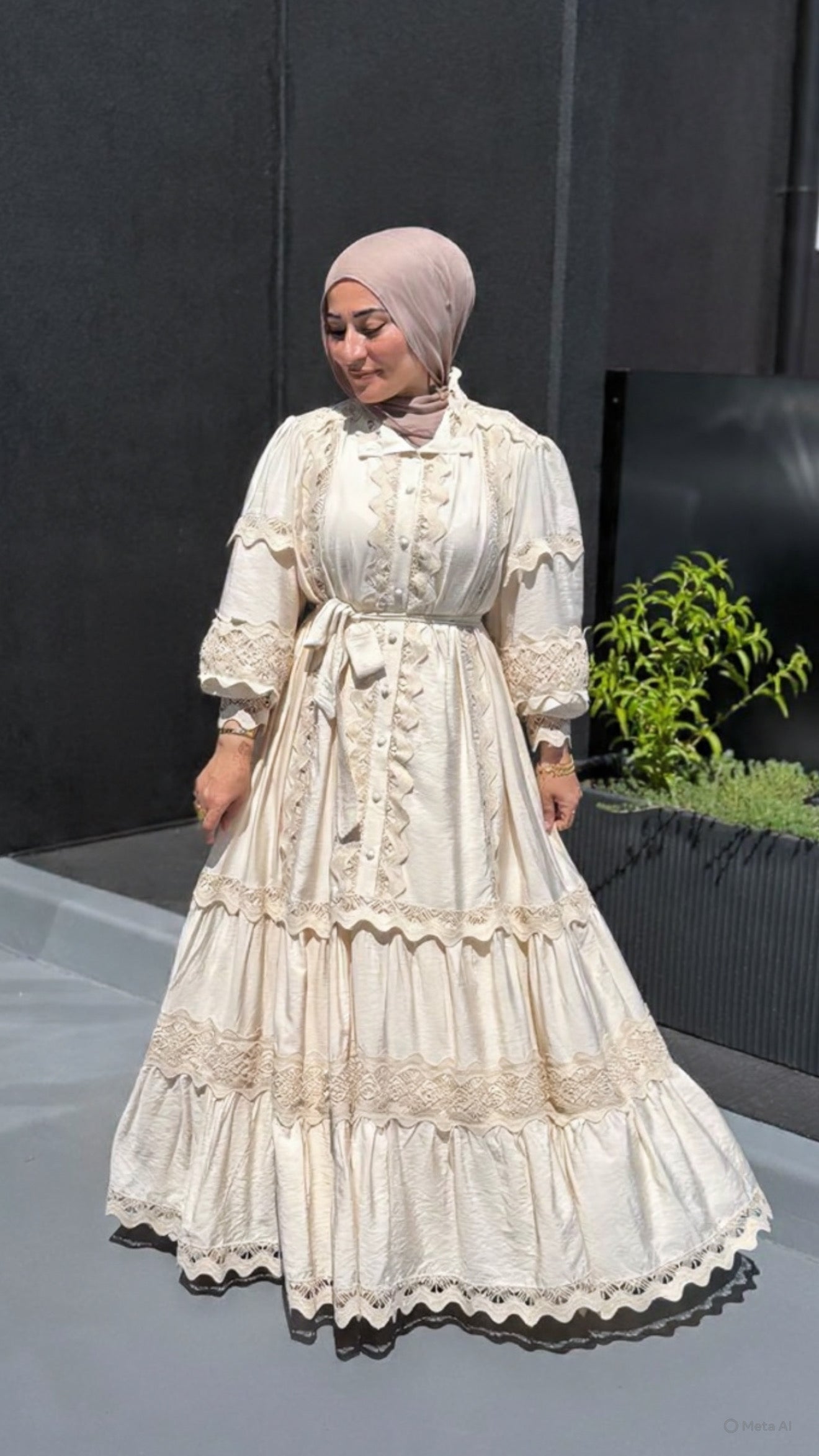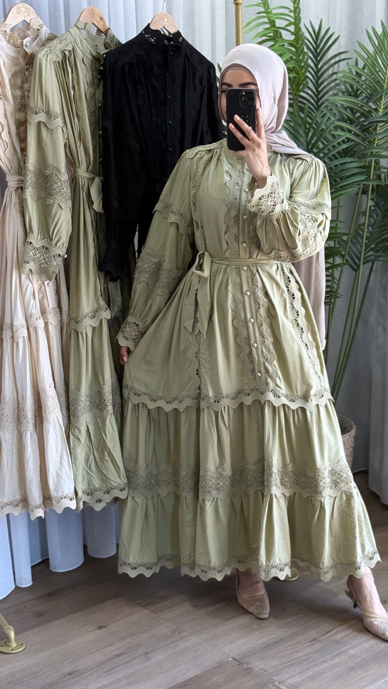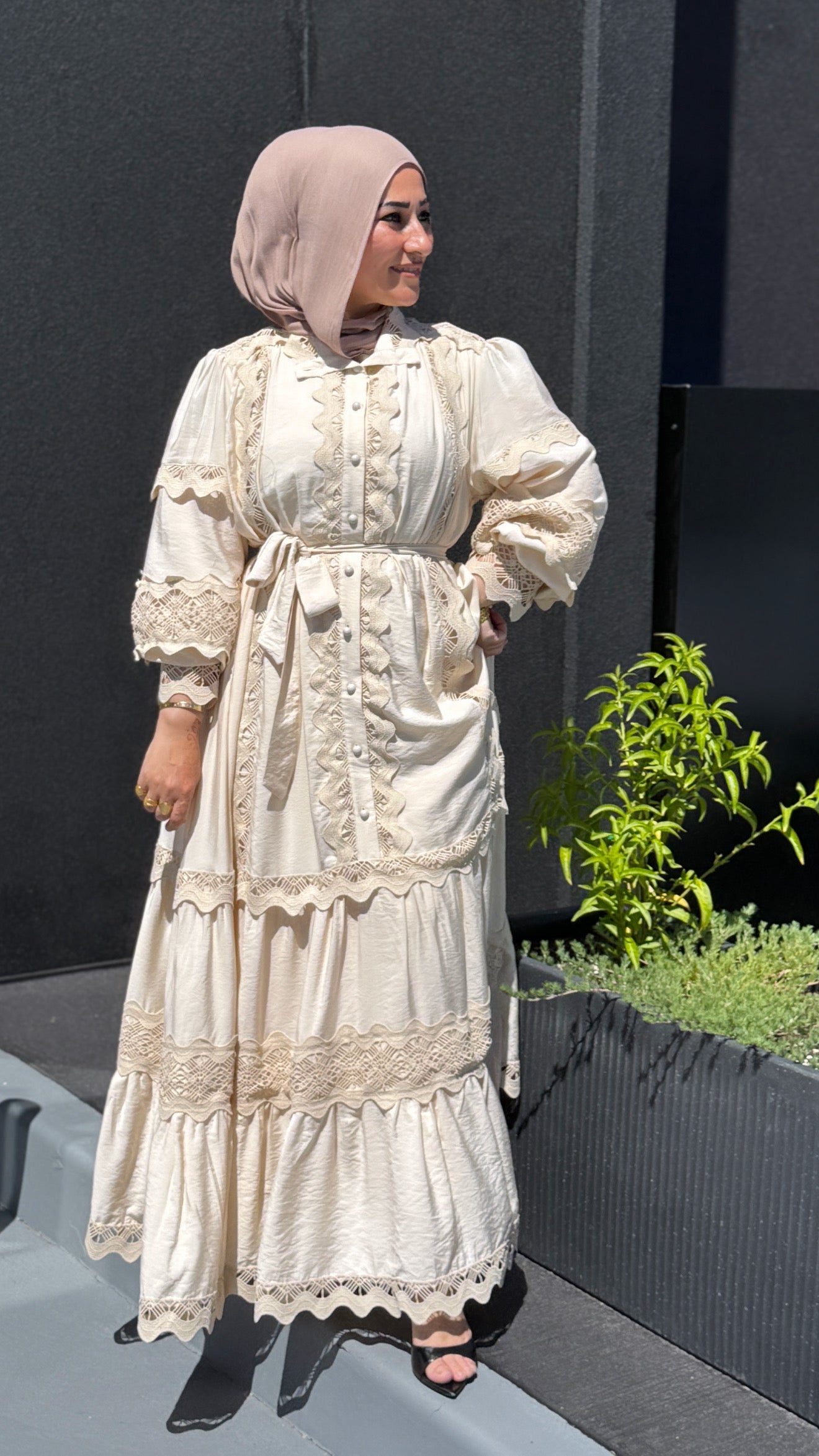 Description: The LACE DRESS epitomizes refined versatility. A high-neck button-up design with delicate lace detailing creates an elegant foundation, while the tie-up closure allows you to adjust the fit with ease. Subtle pleats add dimension and movement, making this piece ideal for layering across seasons.
