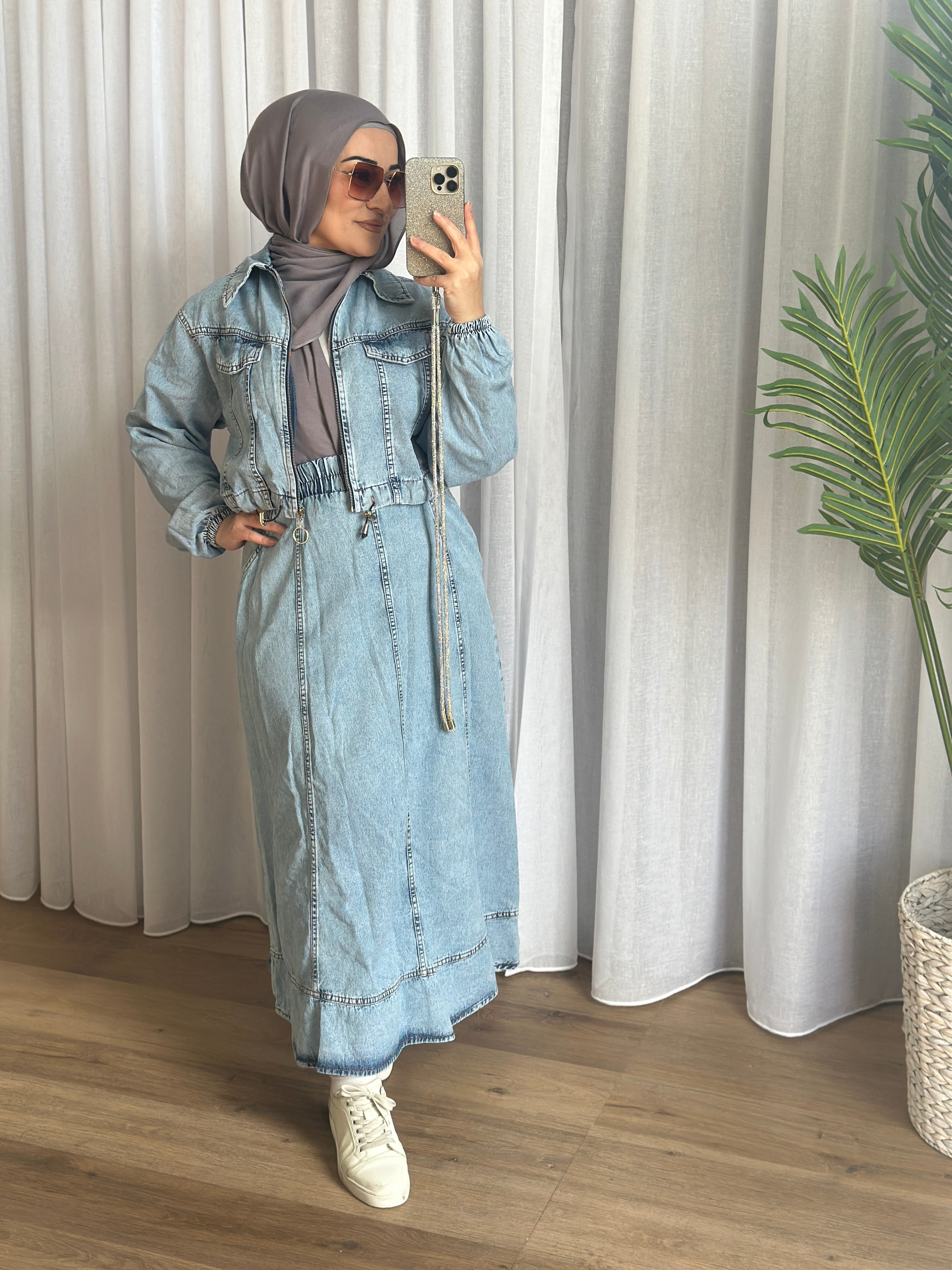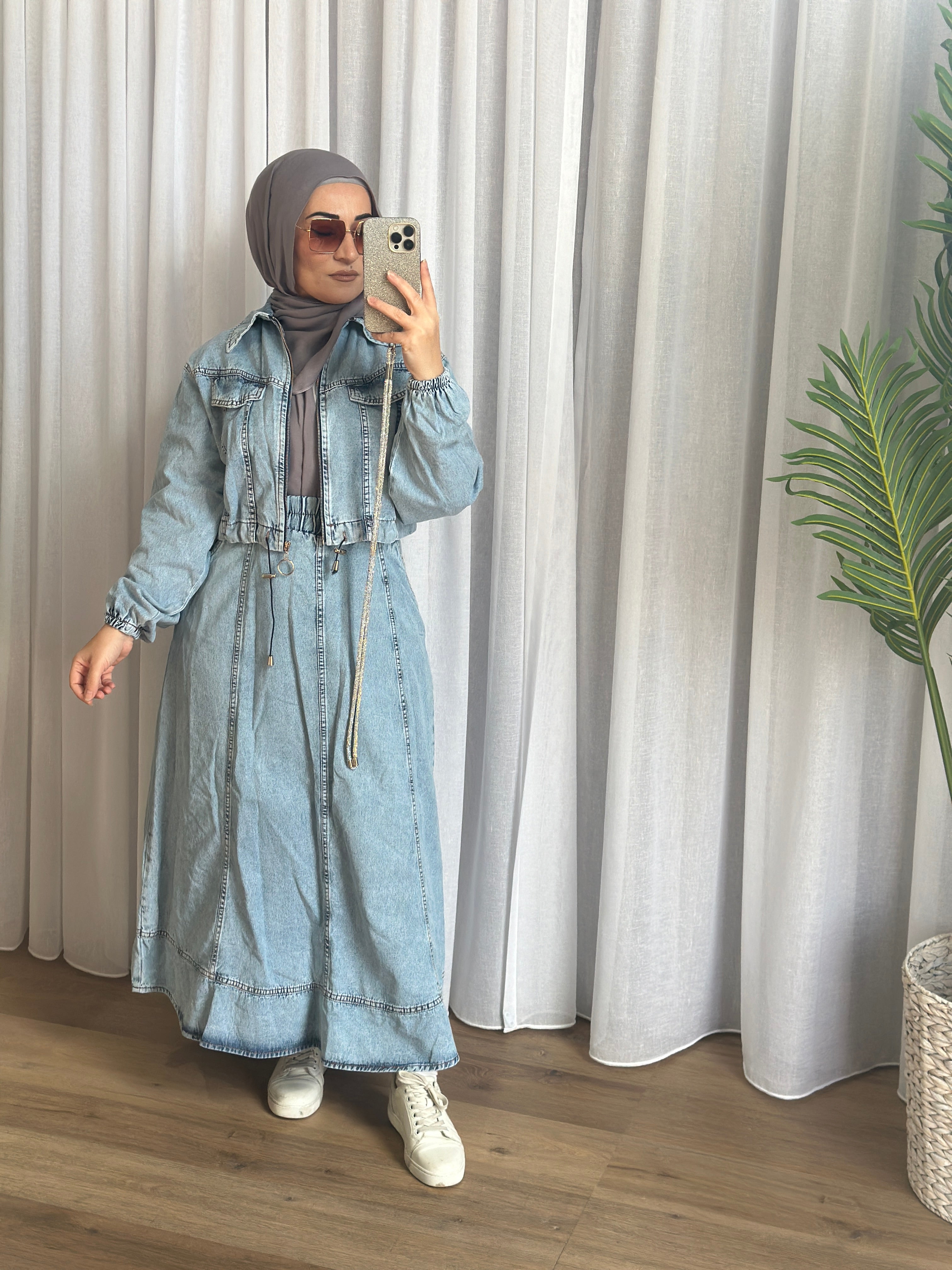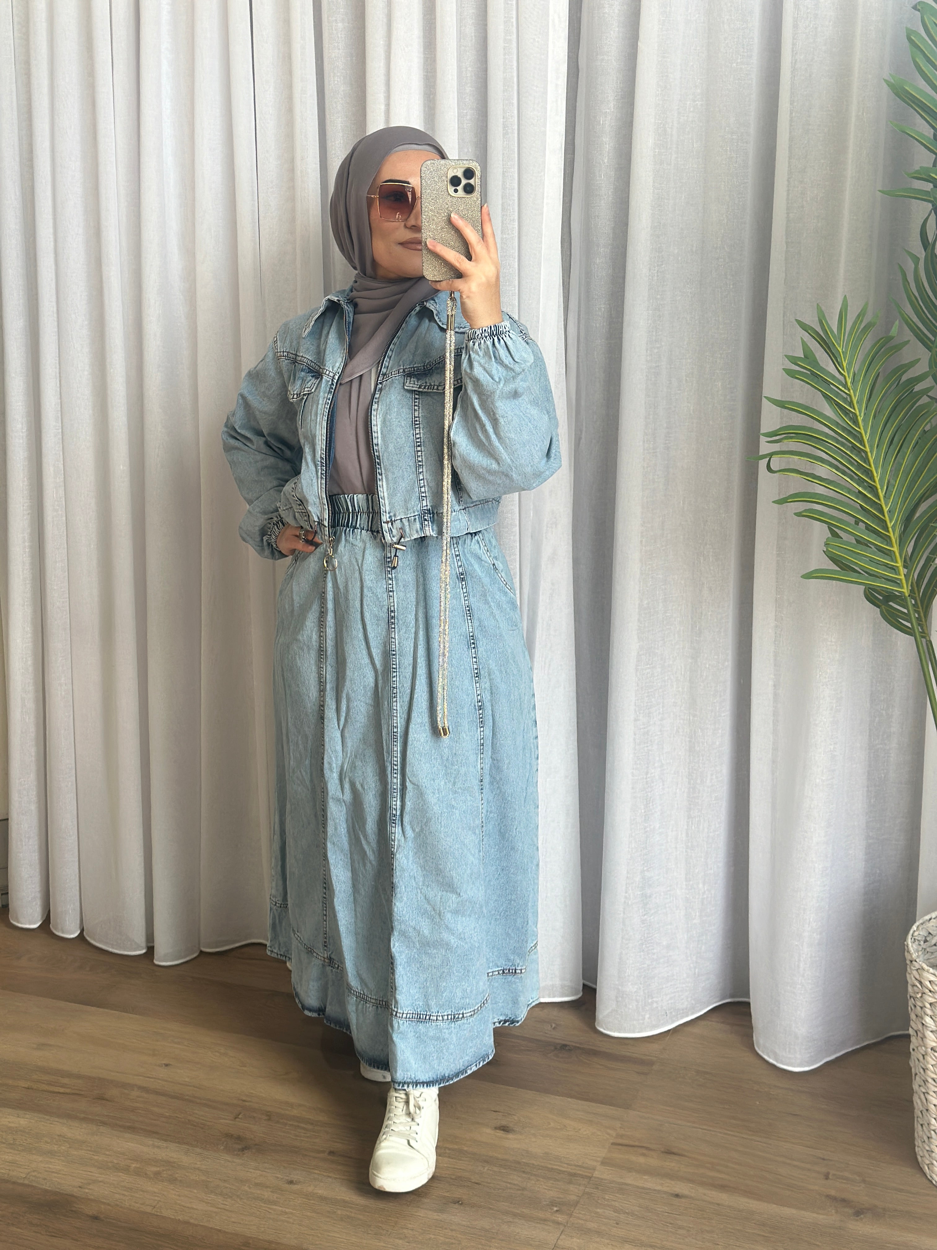 Description: The Laura set is a two-piece set. The top is a cropped denim zip jacket, it has elastic cuff wrists and drawstrings on the waist.