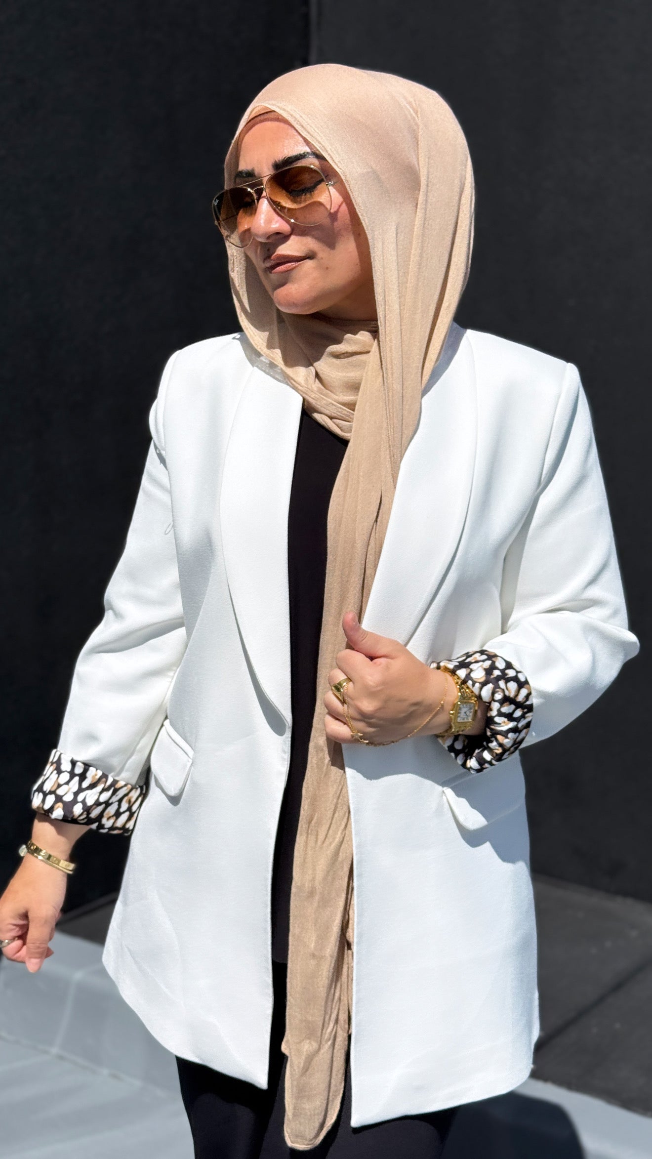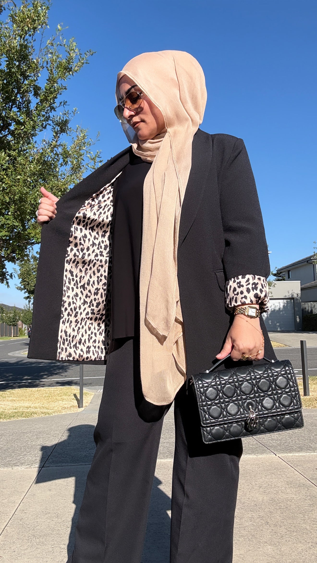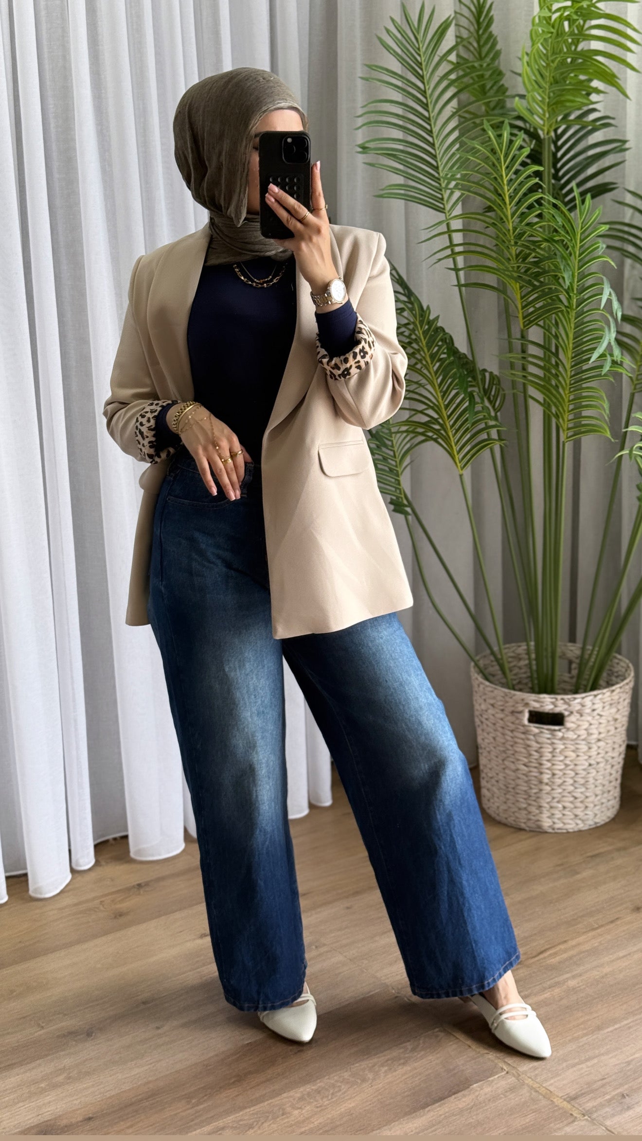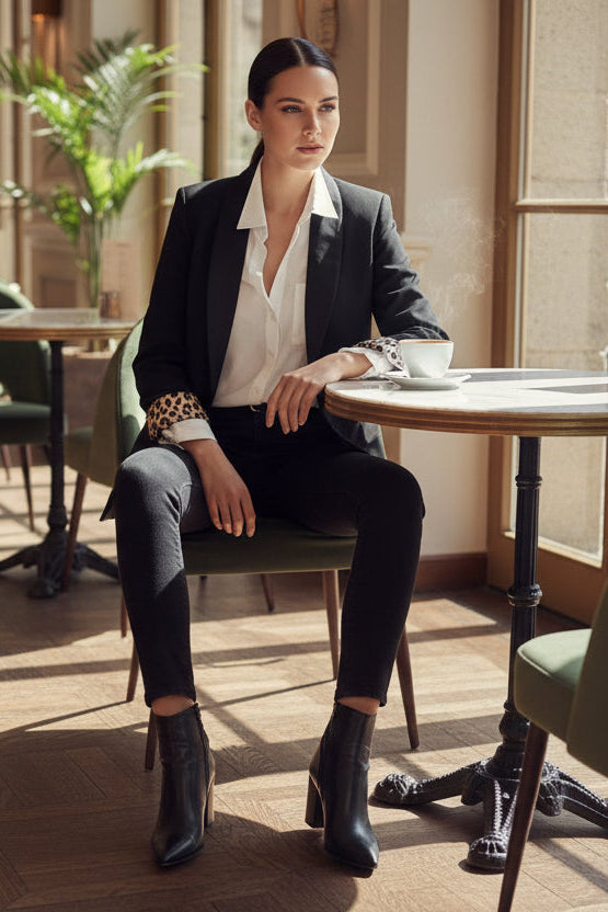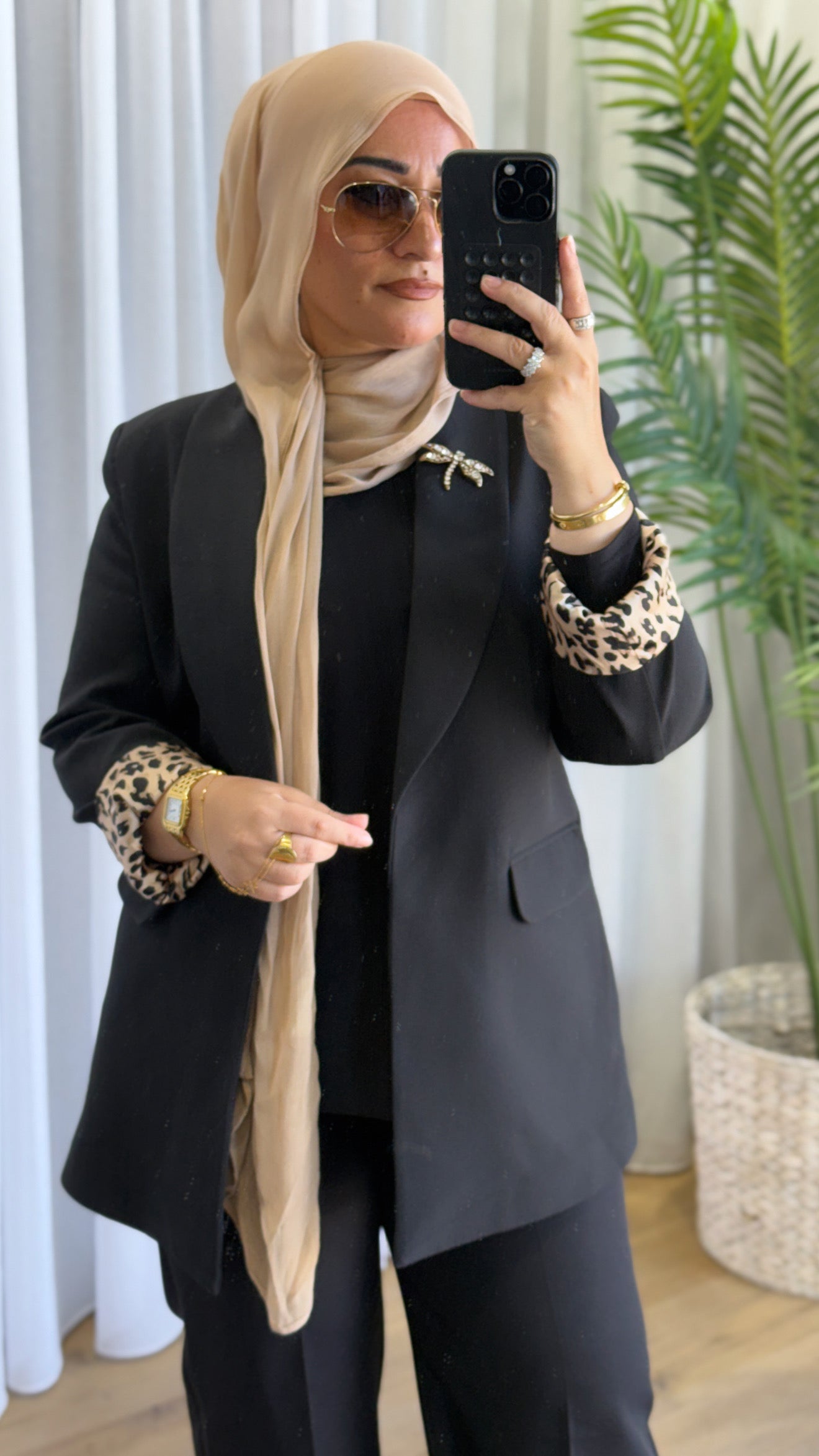 Description: The leopard blazer is stunning. It features an open front design. The sleeves are designed to be rolled up, revealing a striking leopard print lining that adds a pop of bold contrast. The blazer also has two flap pockets at the hip, giving it a classic tailored look.