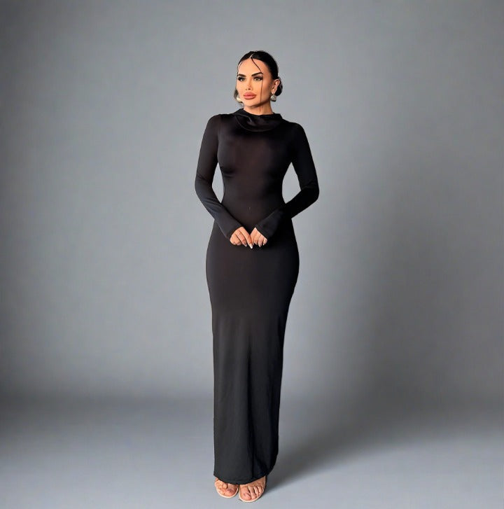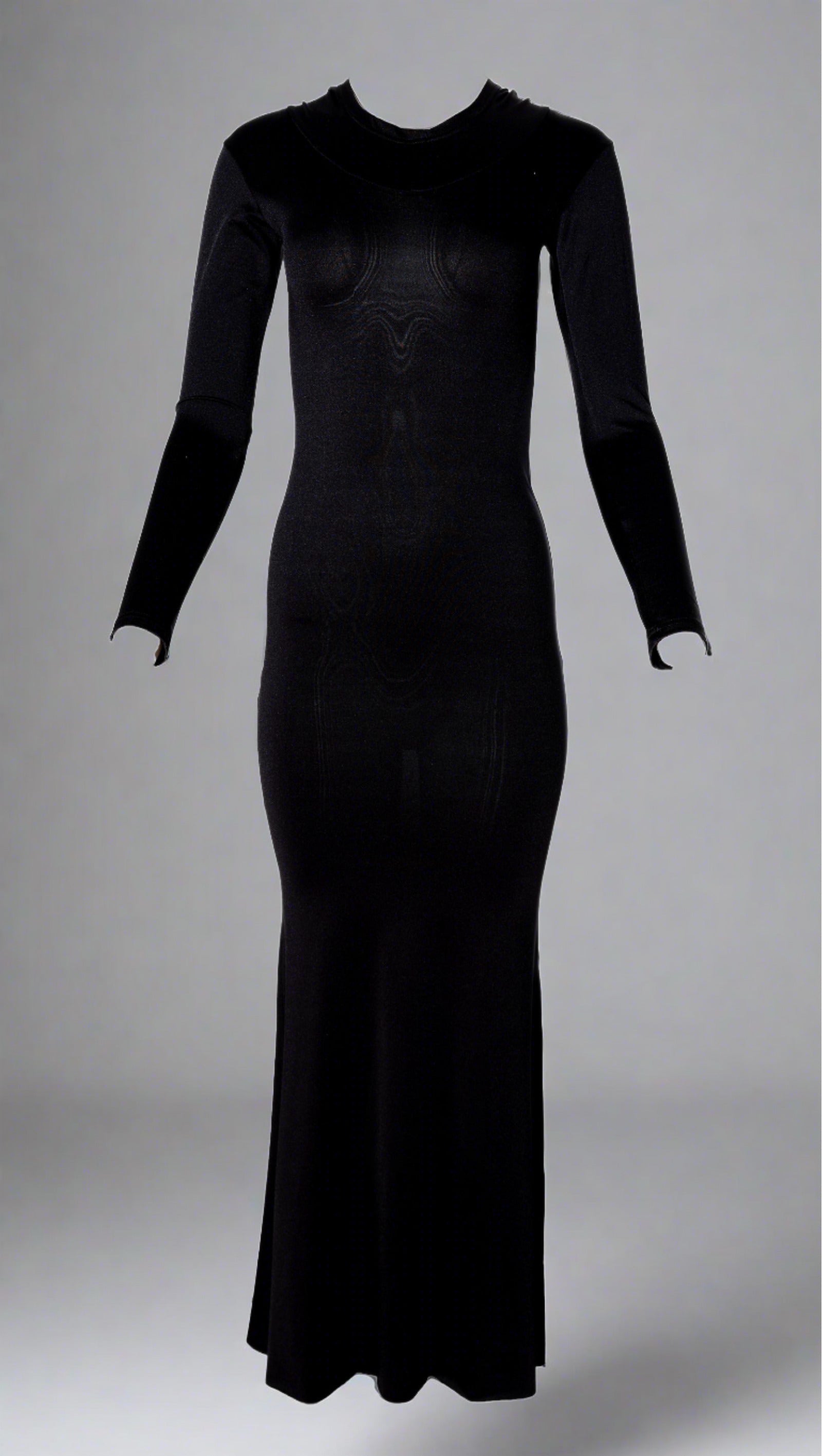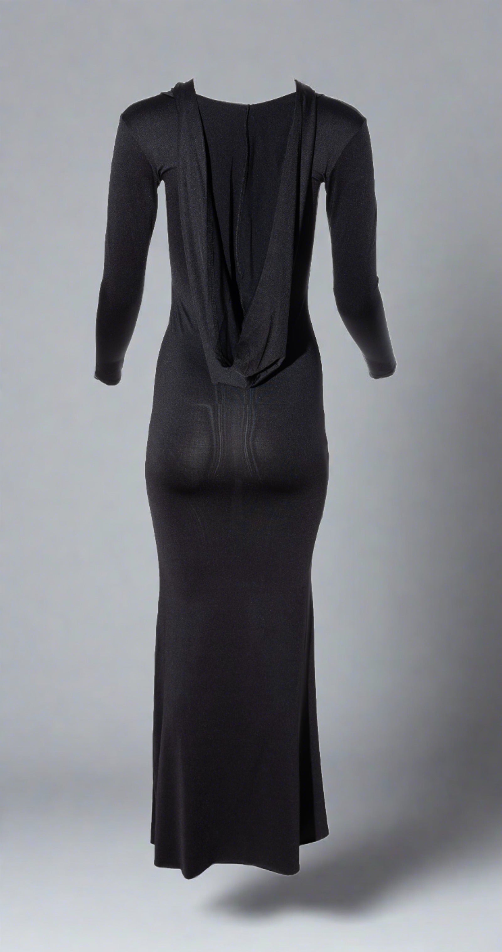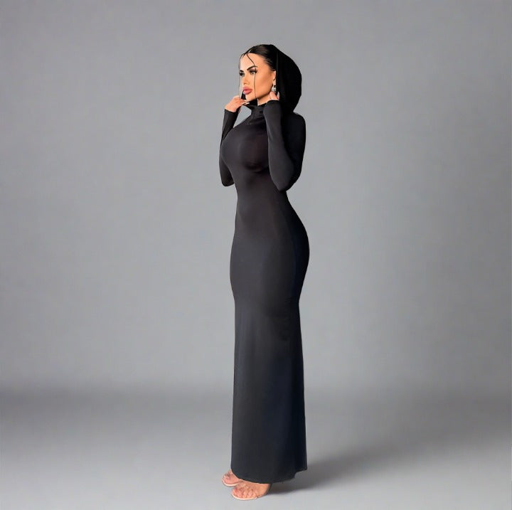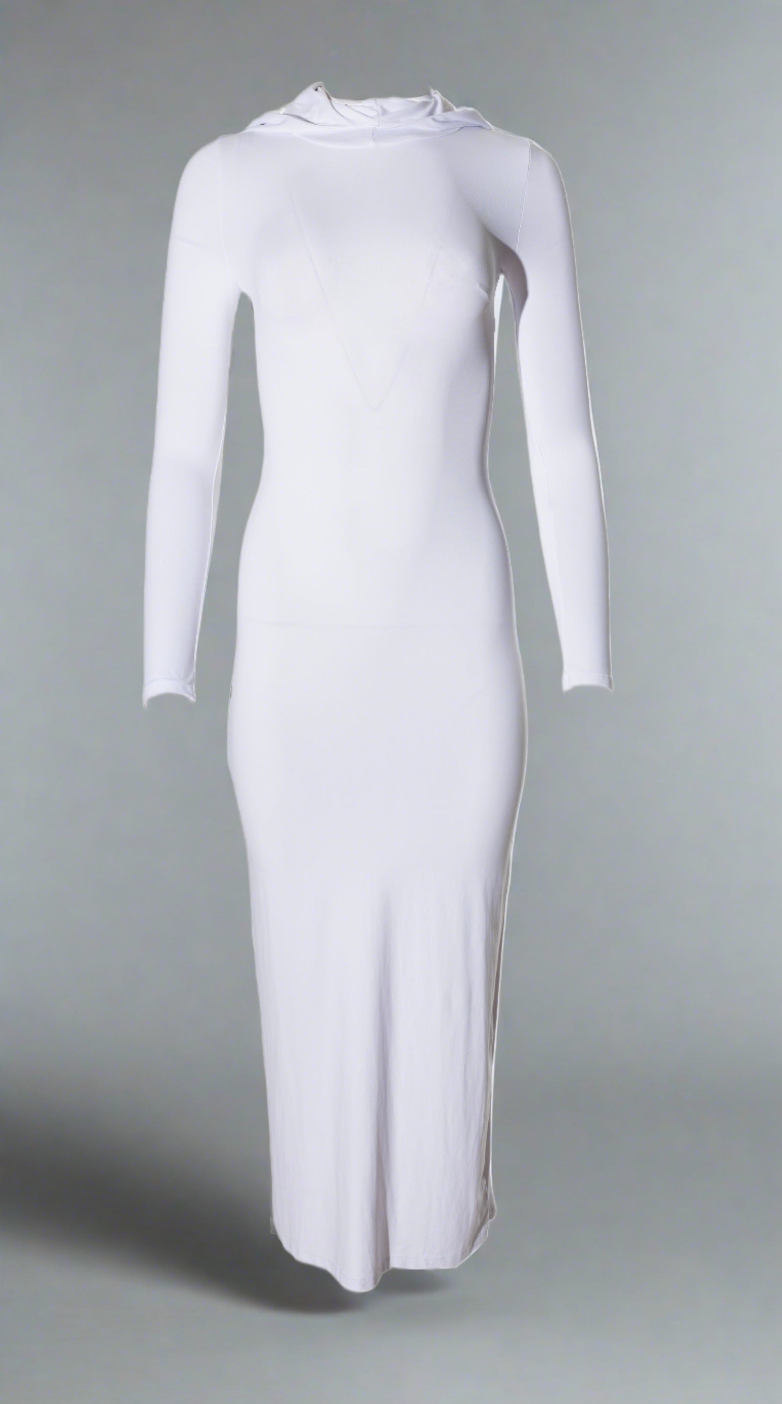 Description: The Lola Dress is a stunning tight fit body dress with a hoodie. It comes in black and white. The white one does have a split at the back, however, the black one does not.