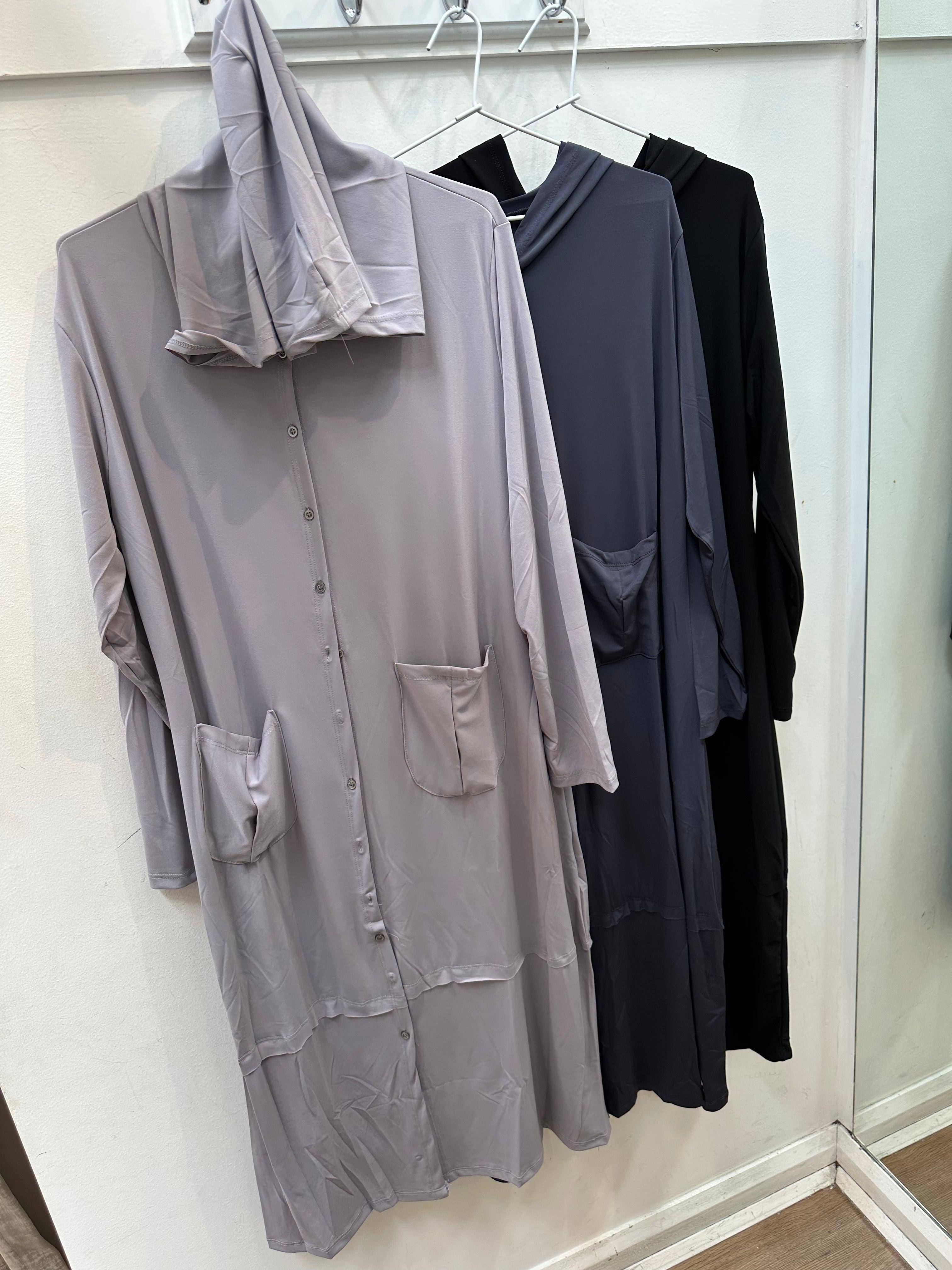 Description: Loose Fitting With Extra Flex And Coverage. Full Button Up Tunic With Hoodie.