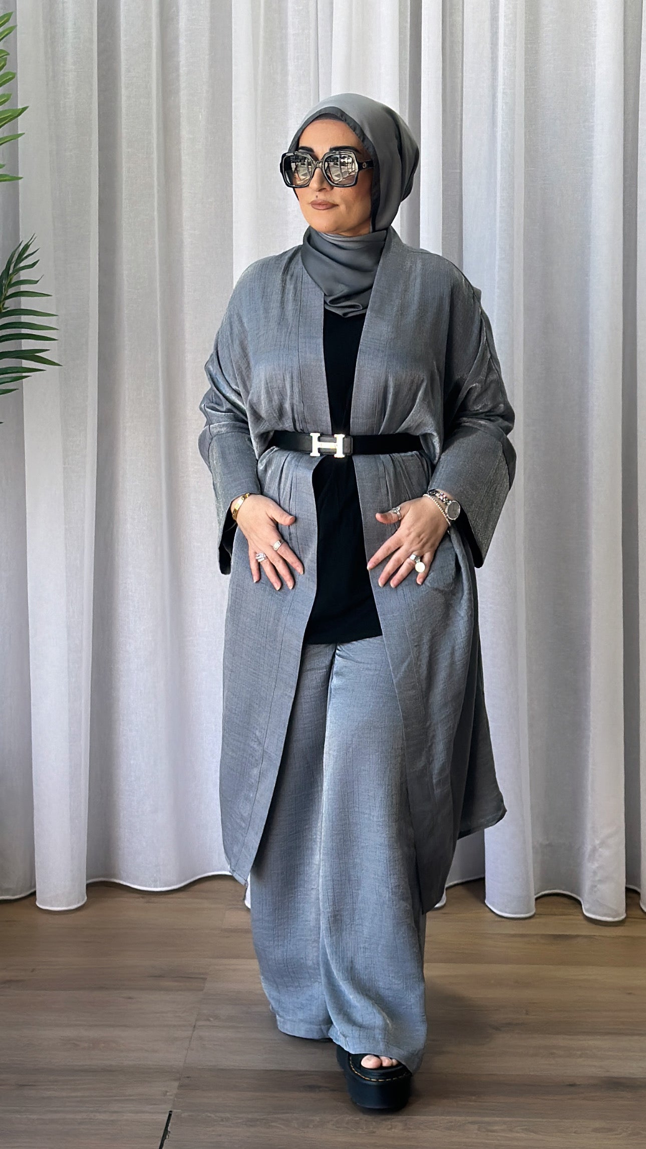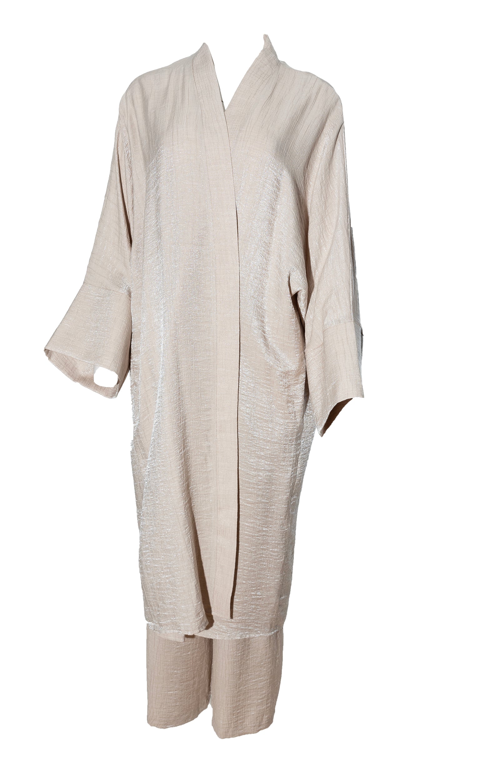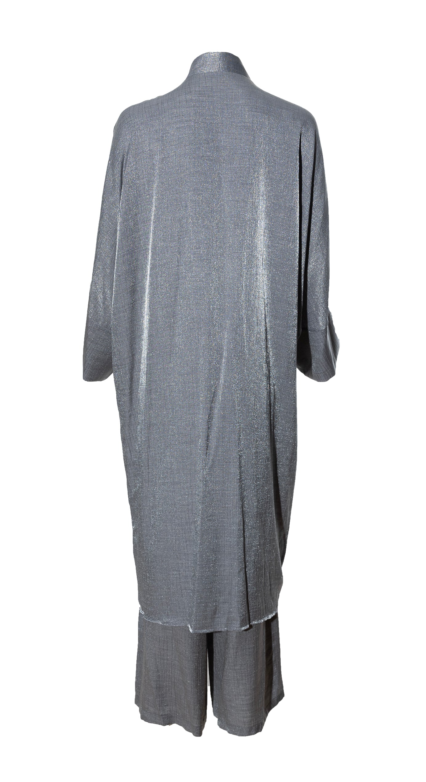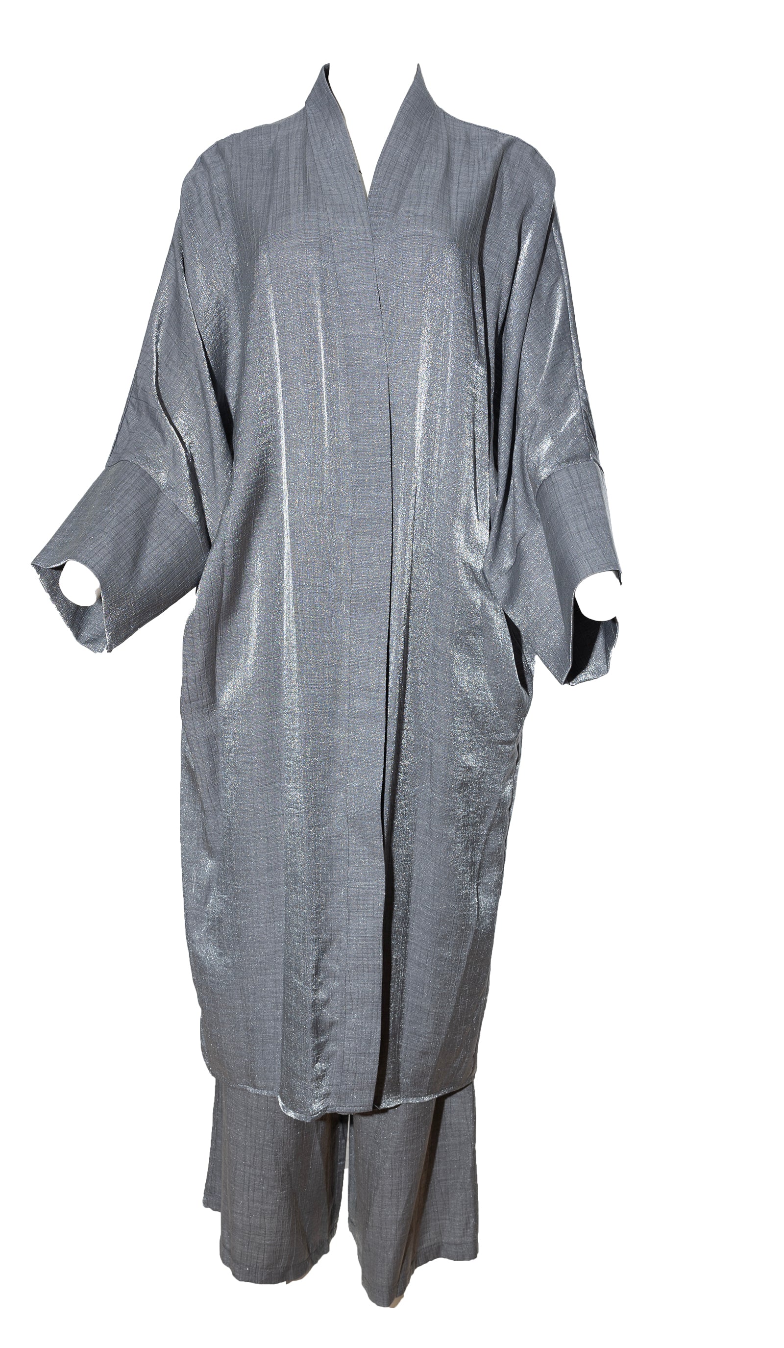 Description: The Melike Set is a two-piece set. It has a batwing cardi which is flowy, and the pants have a drawstring waist and flowy. The Set has a shimmery look to it and is breathable.