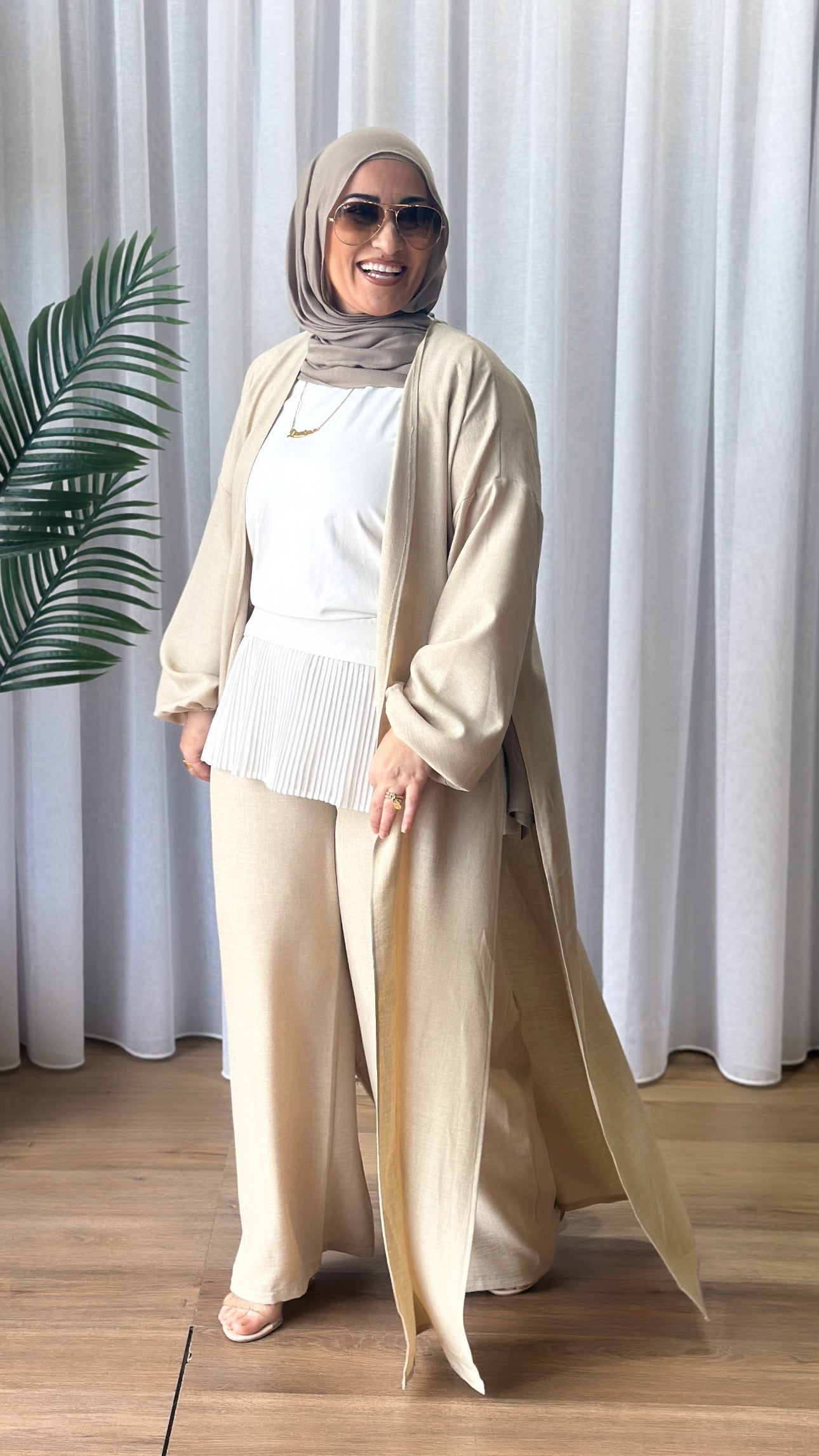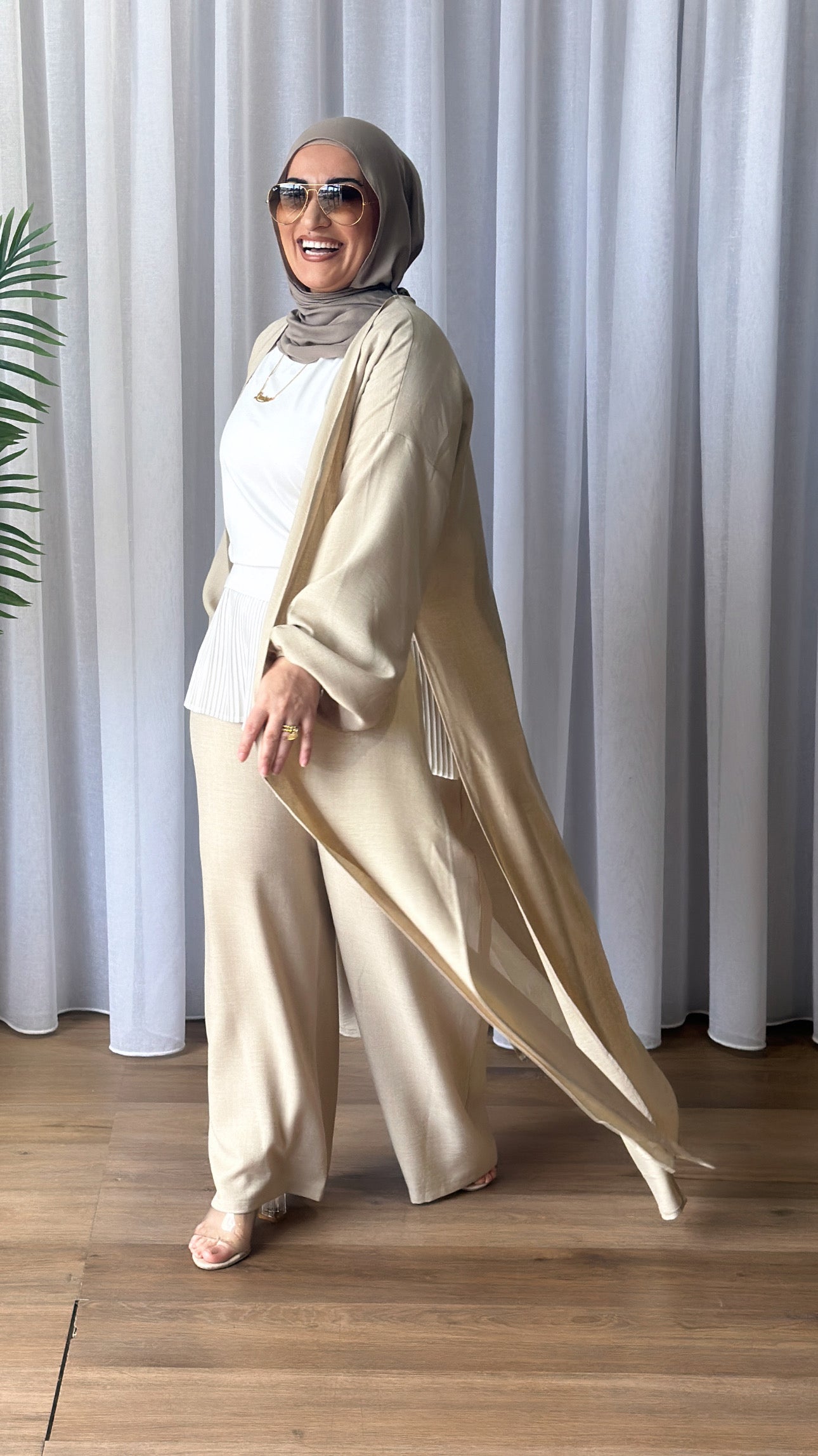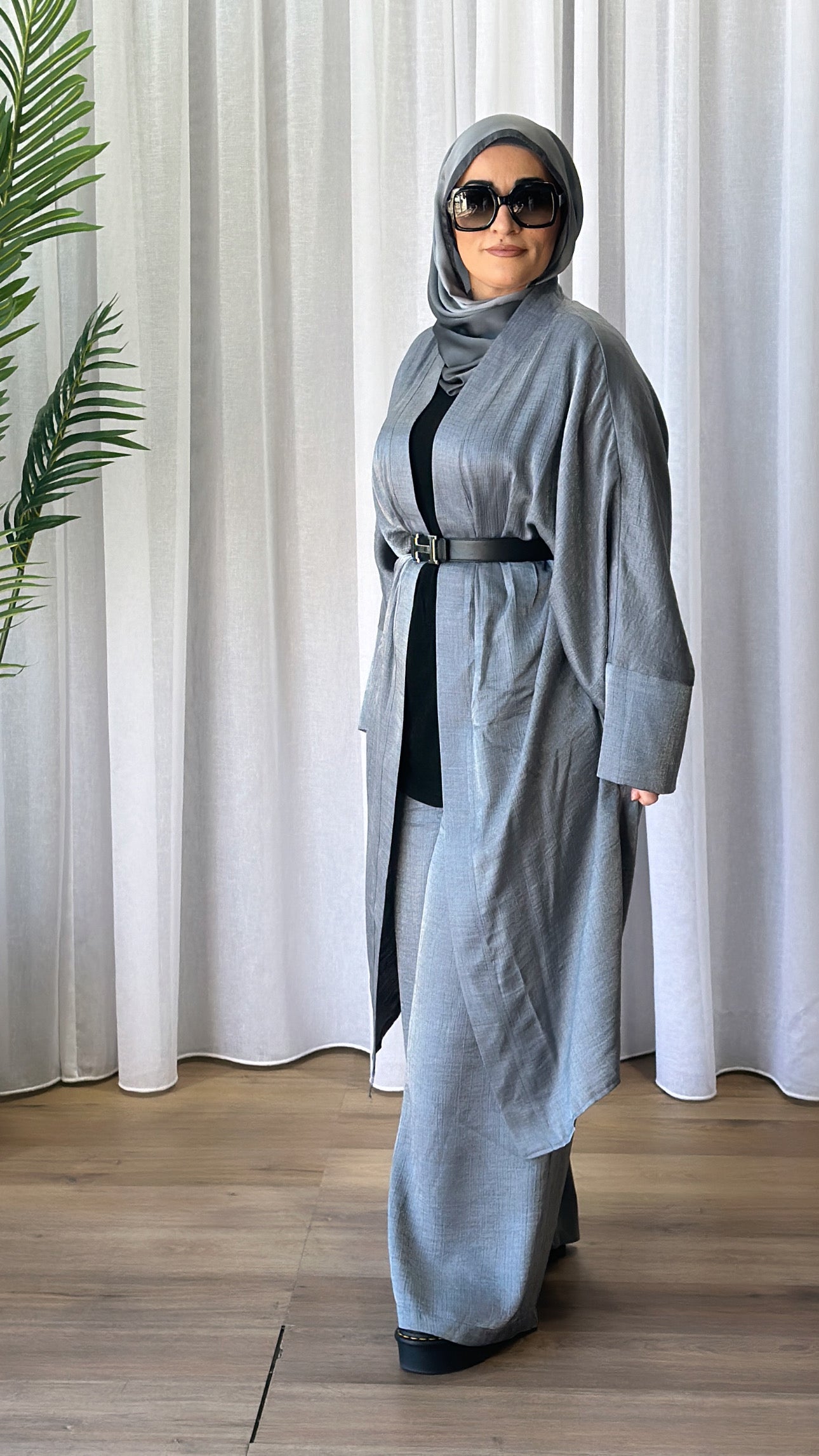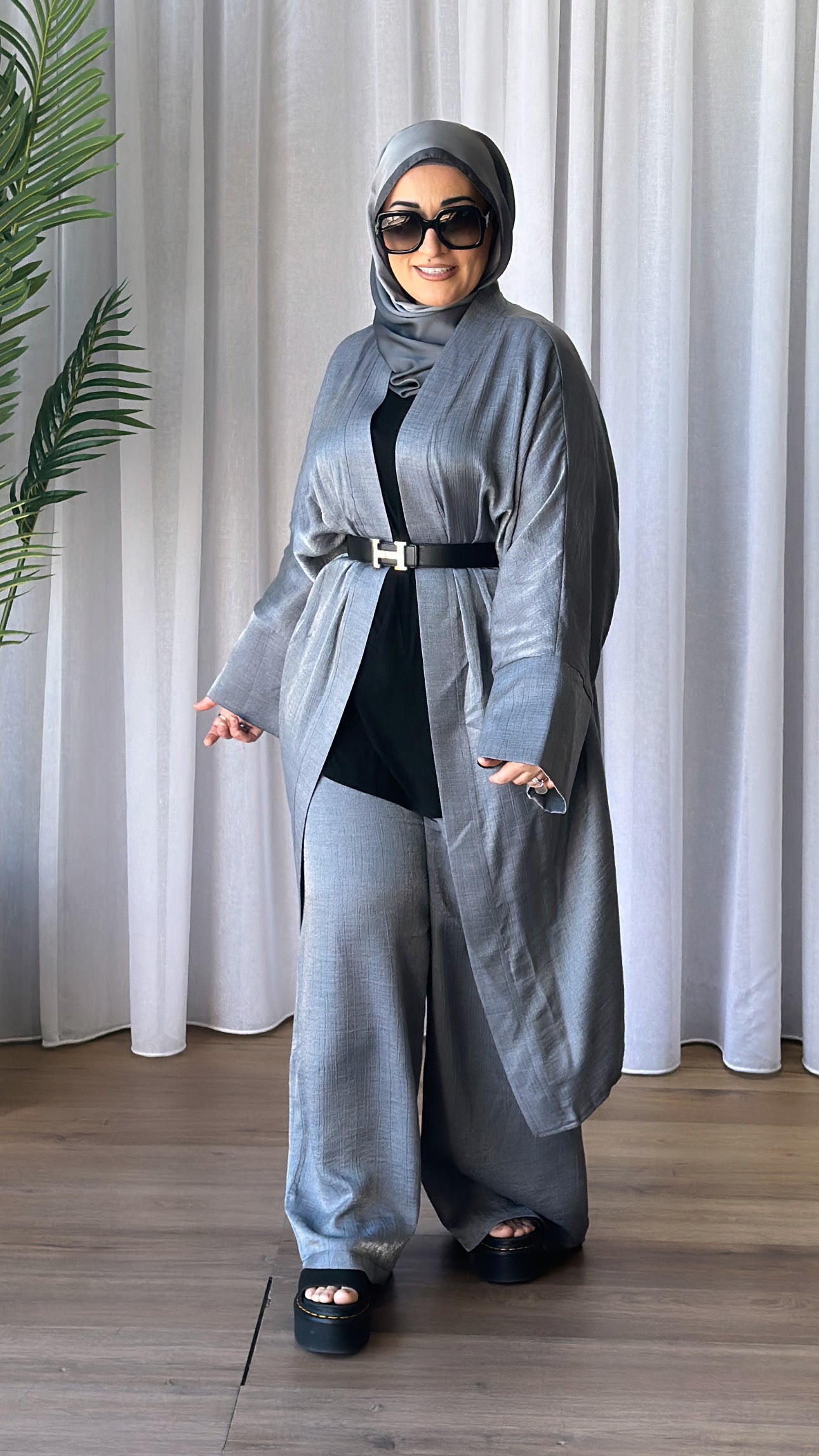 Description: The Melike Set is a two-piece set. It has a batwing cardi which is flowy, and the pants have a drawstring waist and flowy. The Set has a shimmery look to it and is breathable.