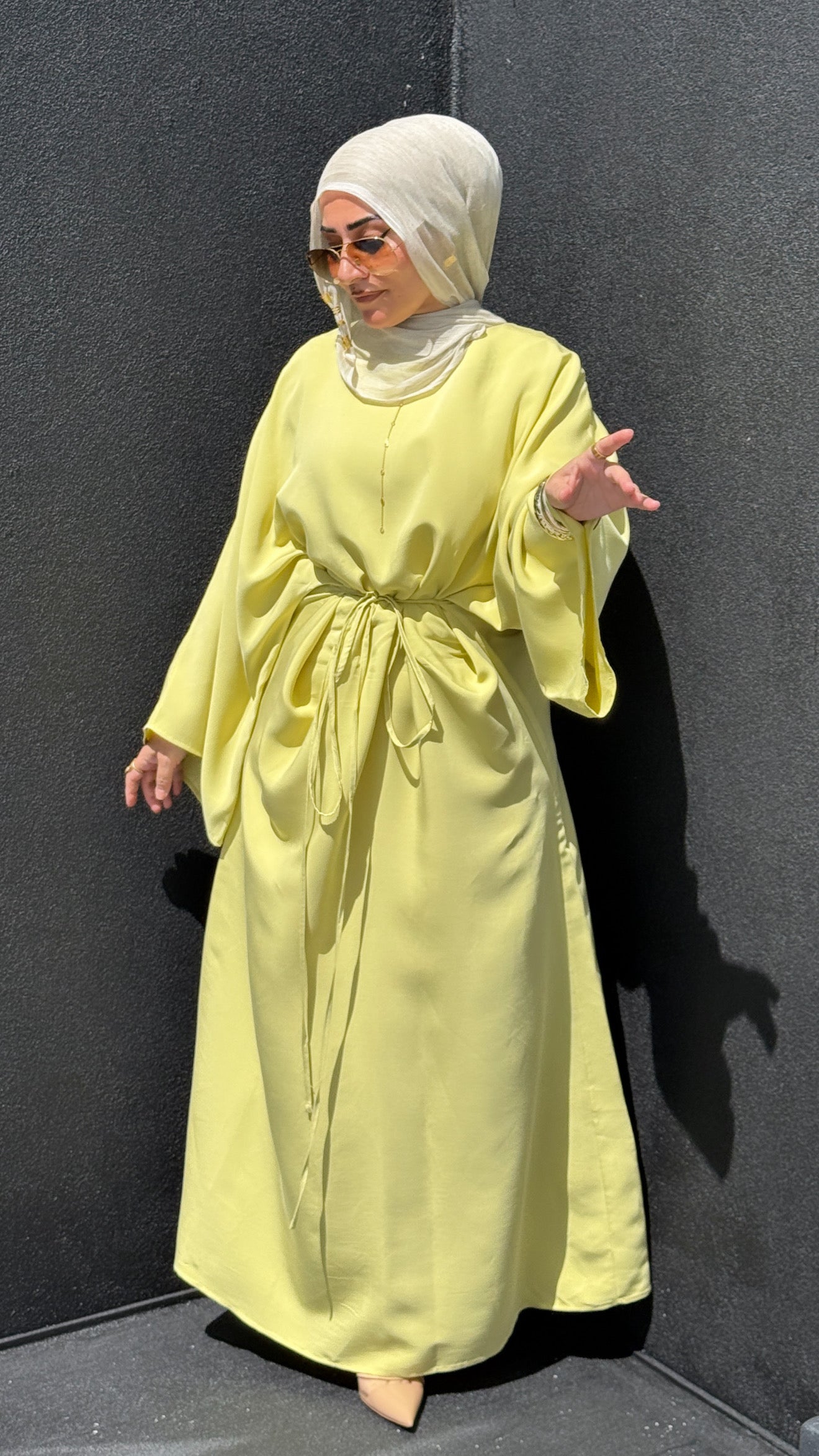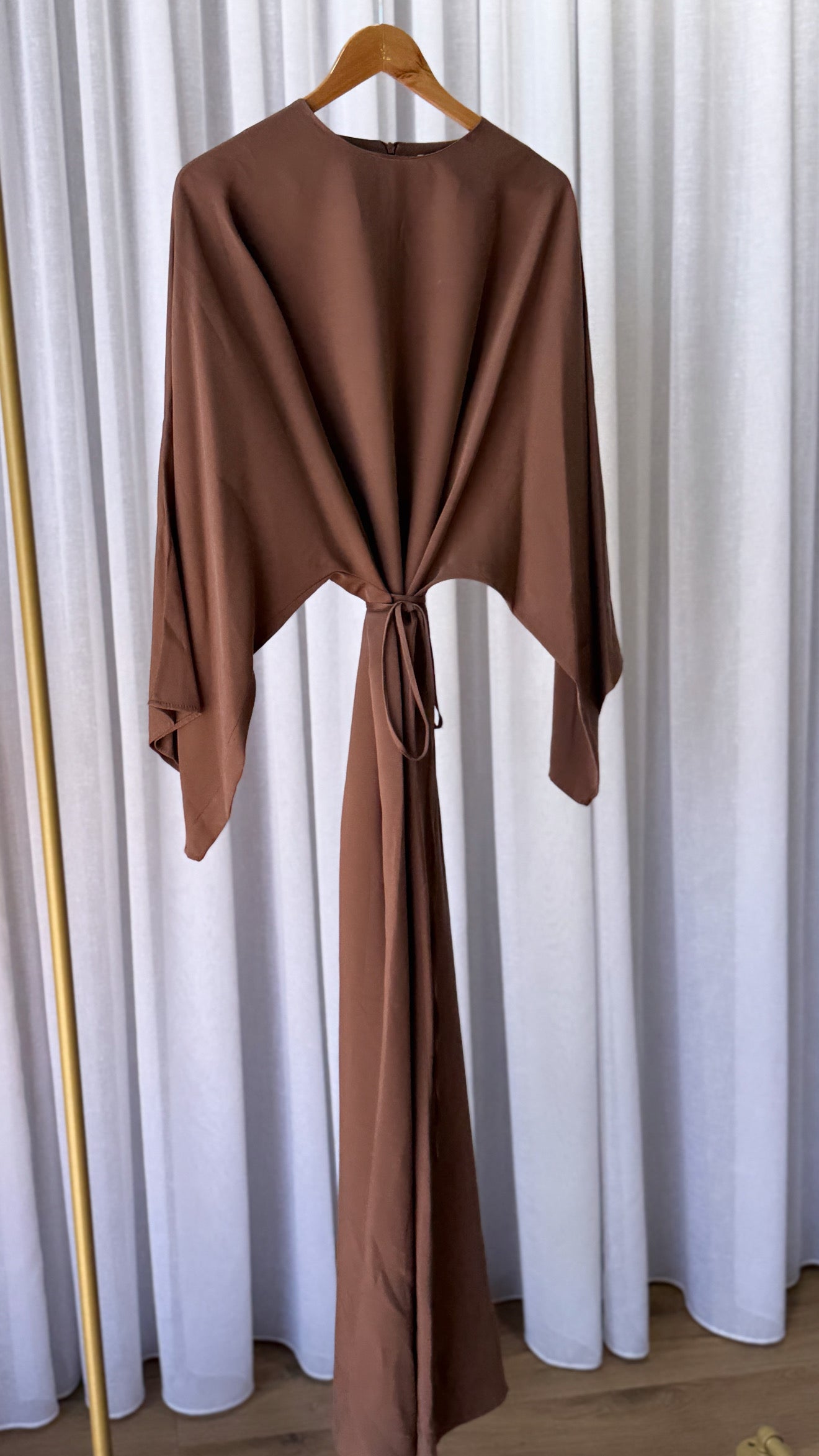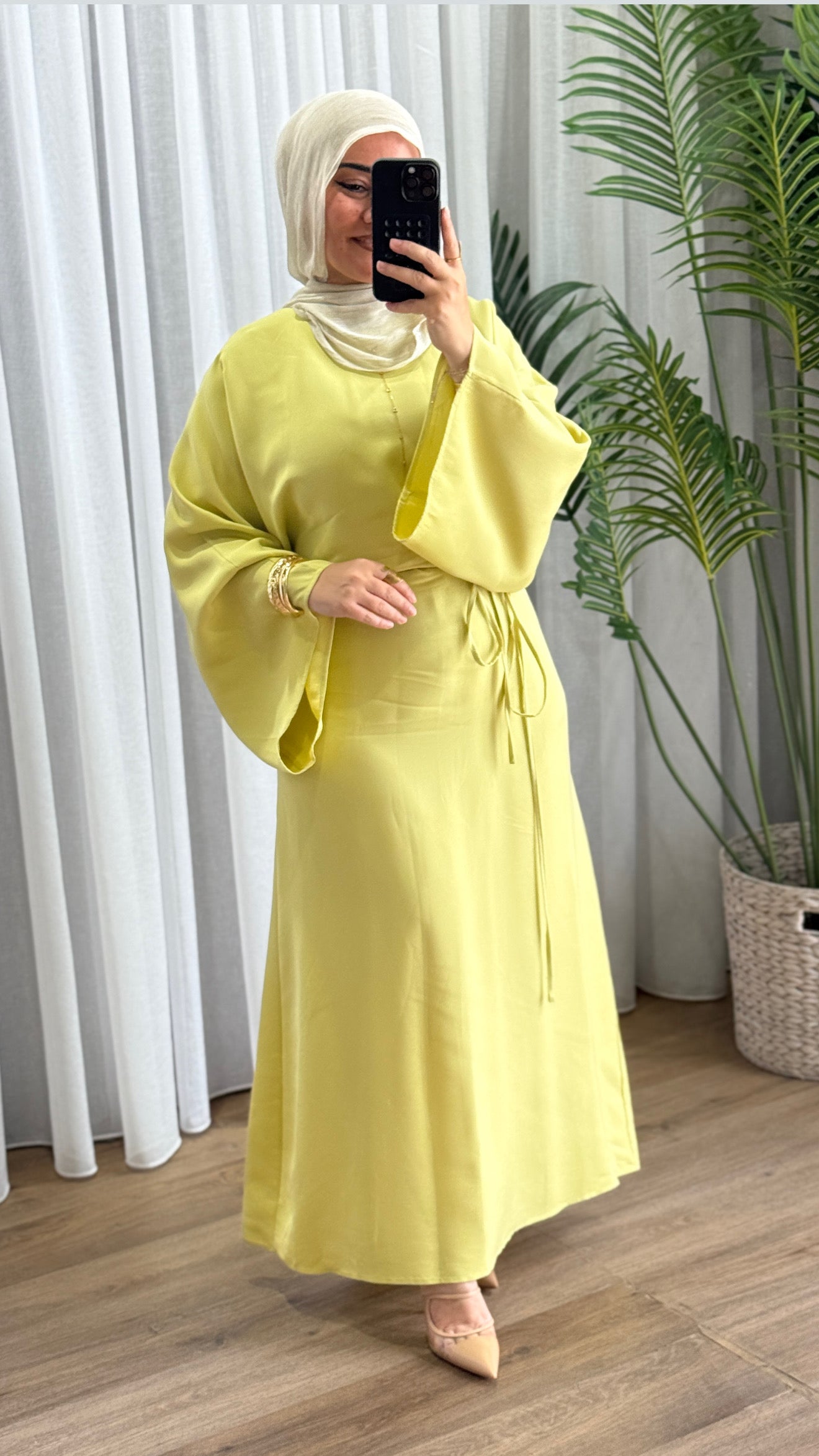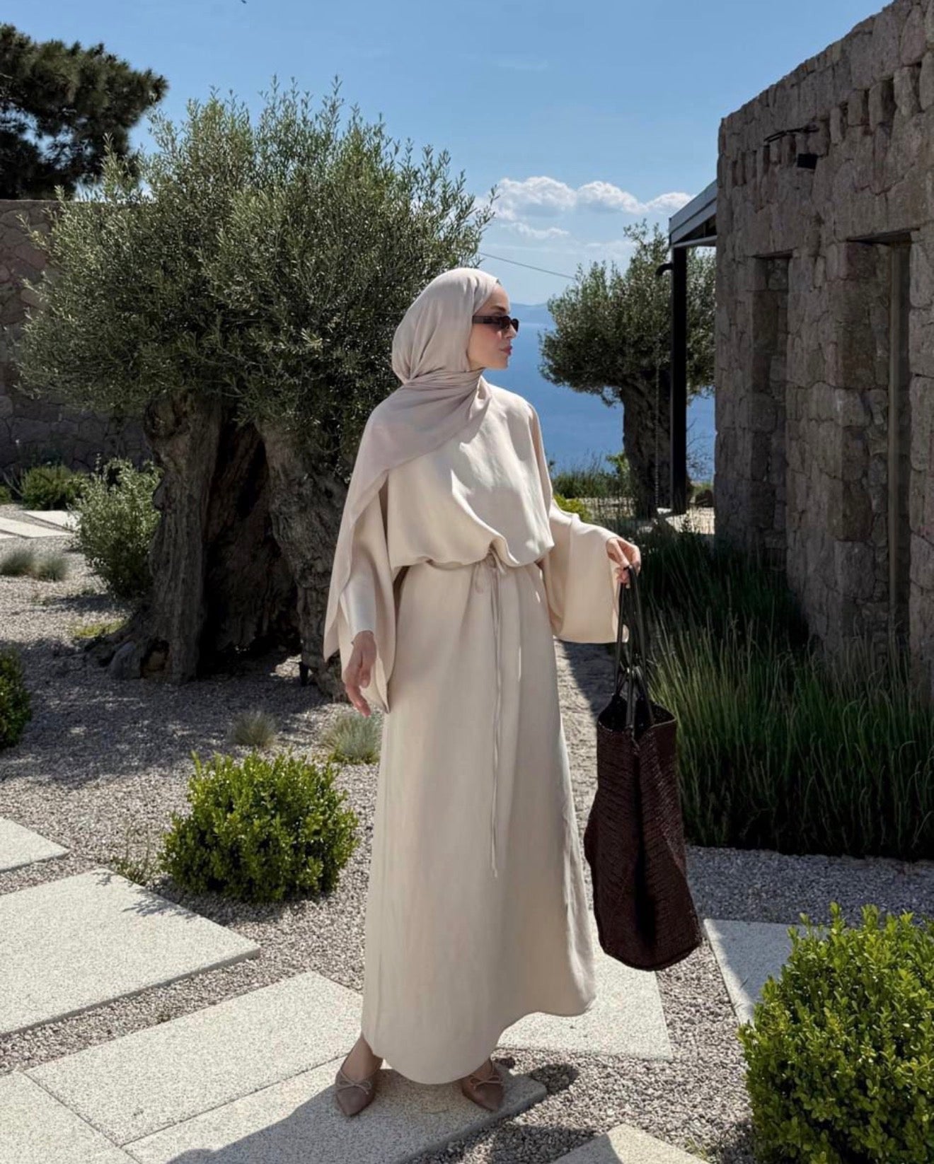 Description: The dress is beautiful. It's made of a lightweight fabric with a subtle texture, giving it a relaxed feel. It features long sleeves that are slightly angled. It has a modest neckline. It has a zipper closure at the back, as well as two strings to tie that is adjustable to personal preference.