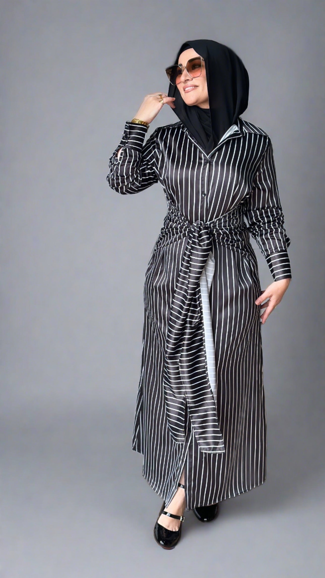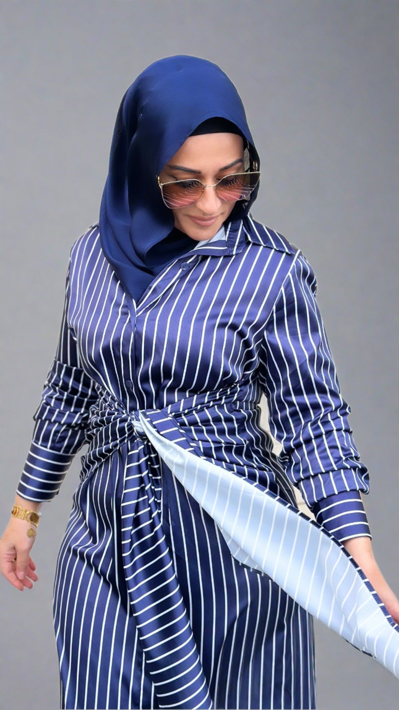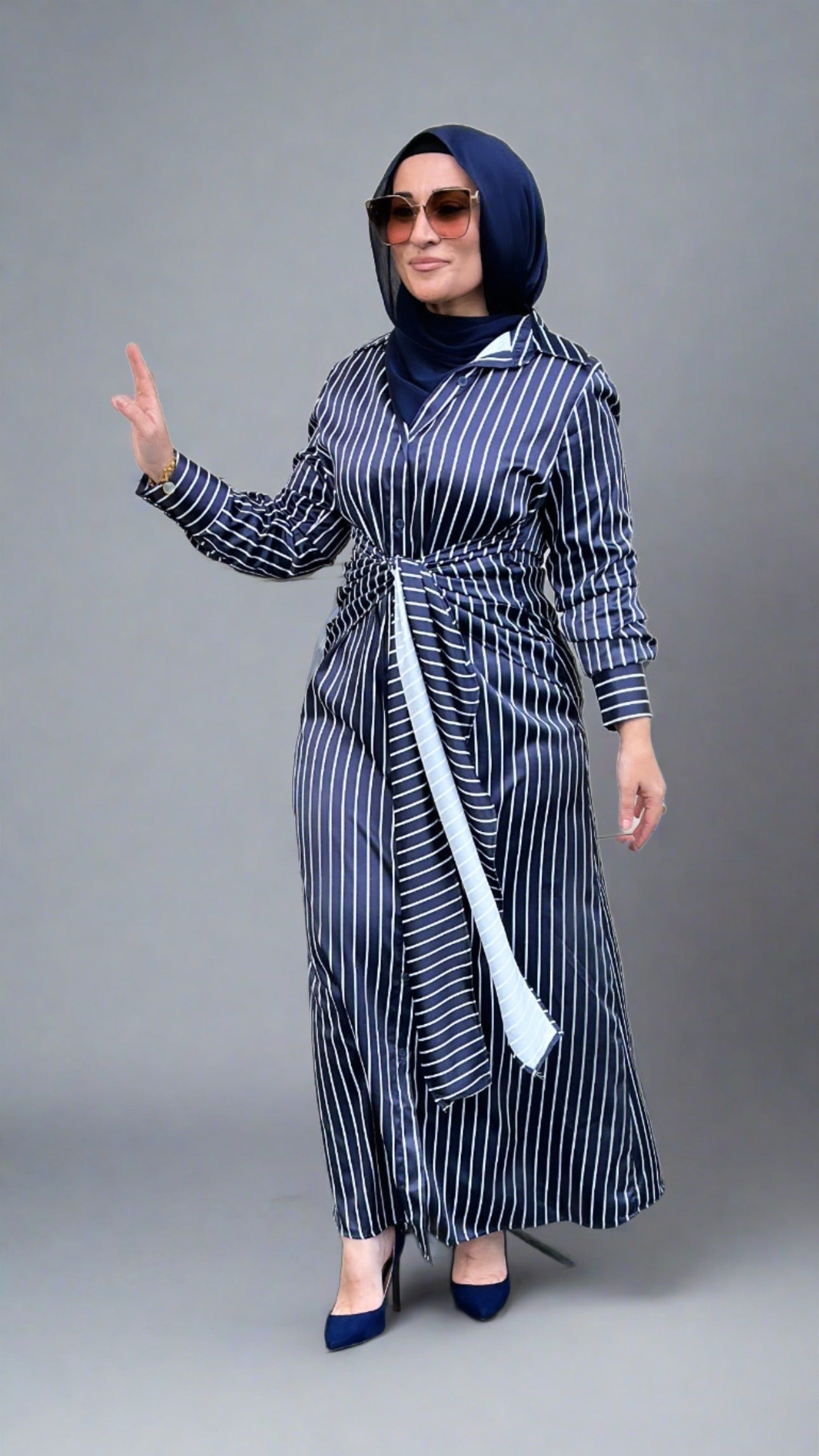 Description: The Muge Dress is a stunning dress designed to be lightweight and stylish. Can be dressed up or down. It is collared with full length buttons, has button cuff wrists, an attached belt for waist tie and striped design.