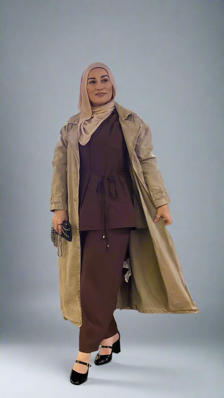 Description: The Nihan Set is a two-piece set. The top is a double side tie button up with button cuff wrists and the bottoms are a half elastic waist with a zip on the front and slim fitting.