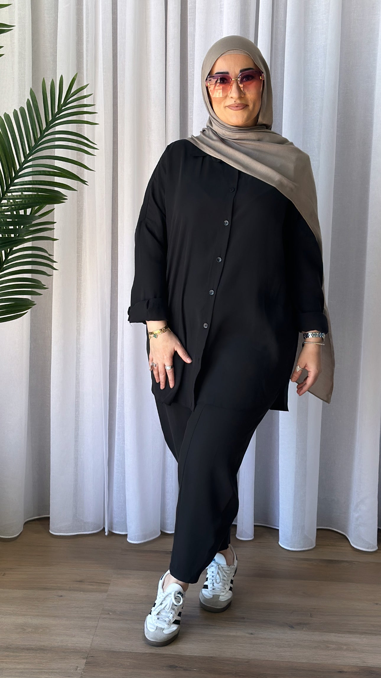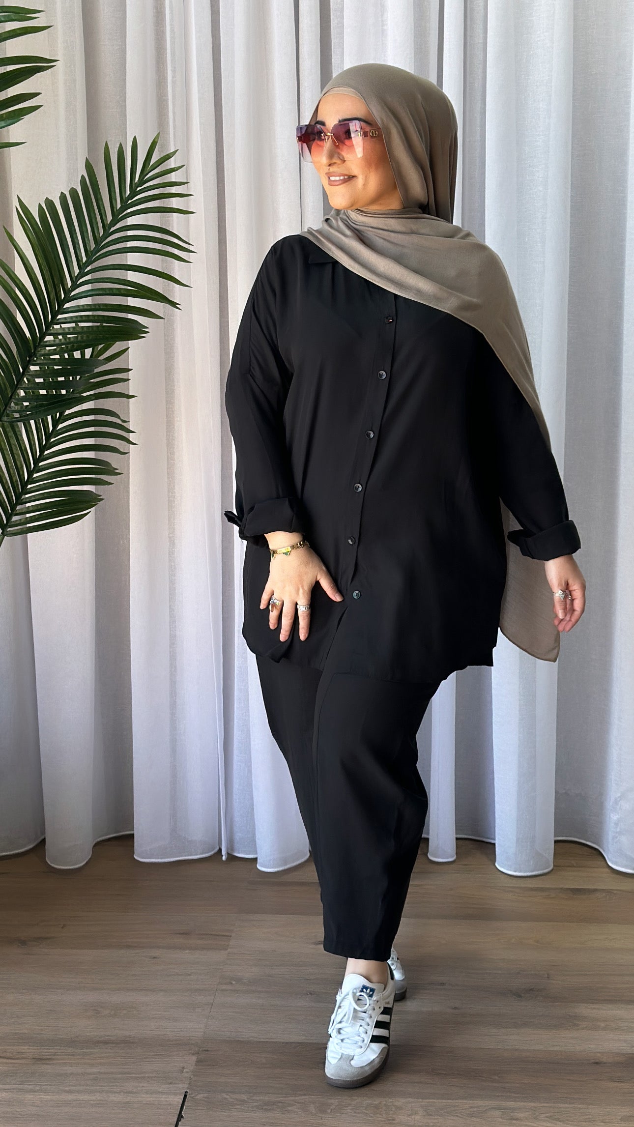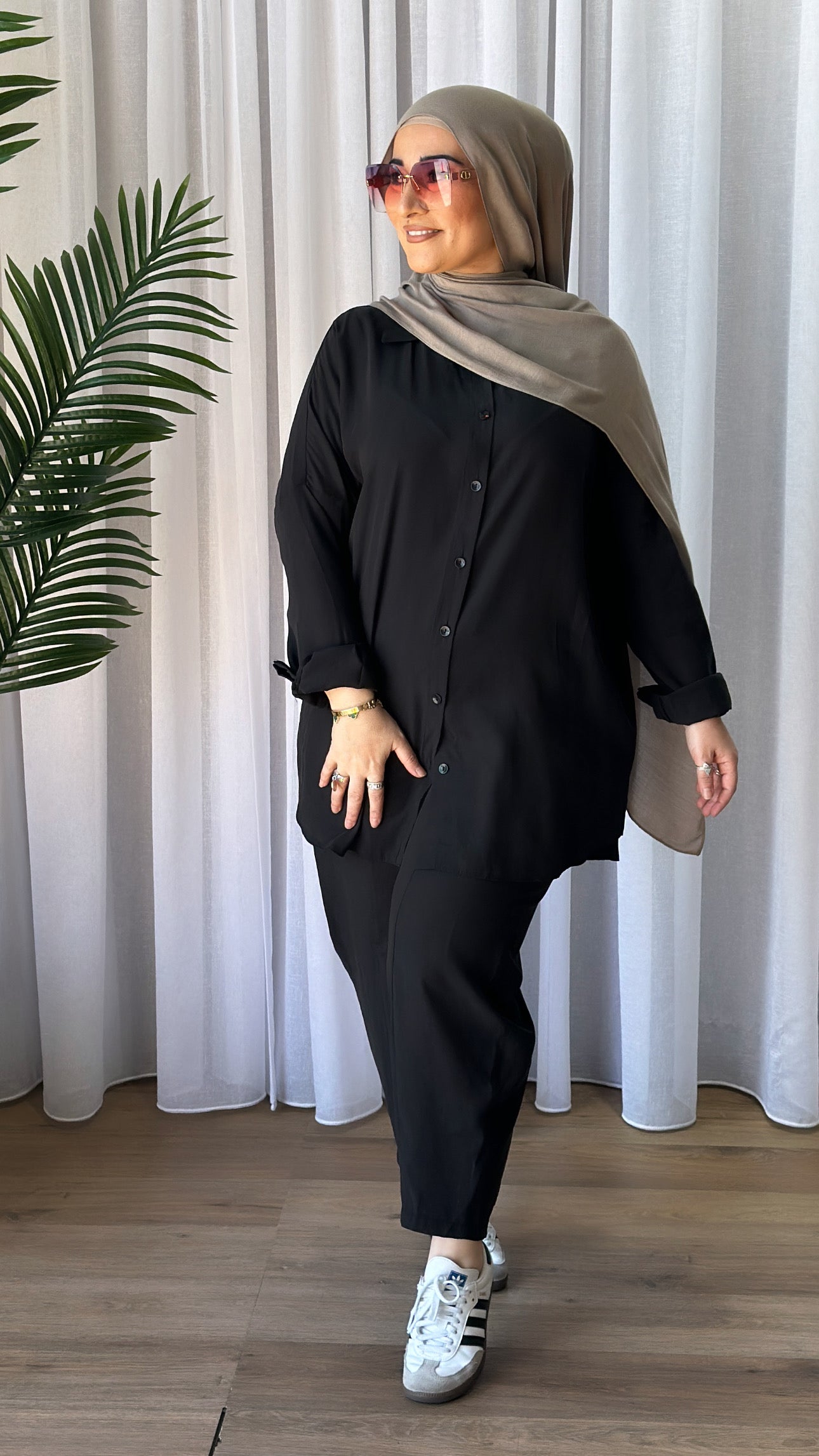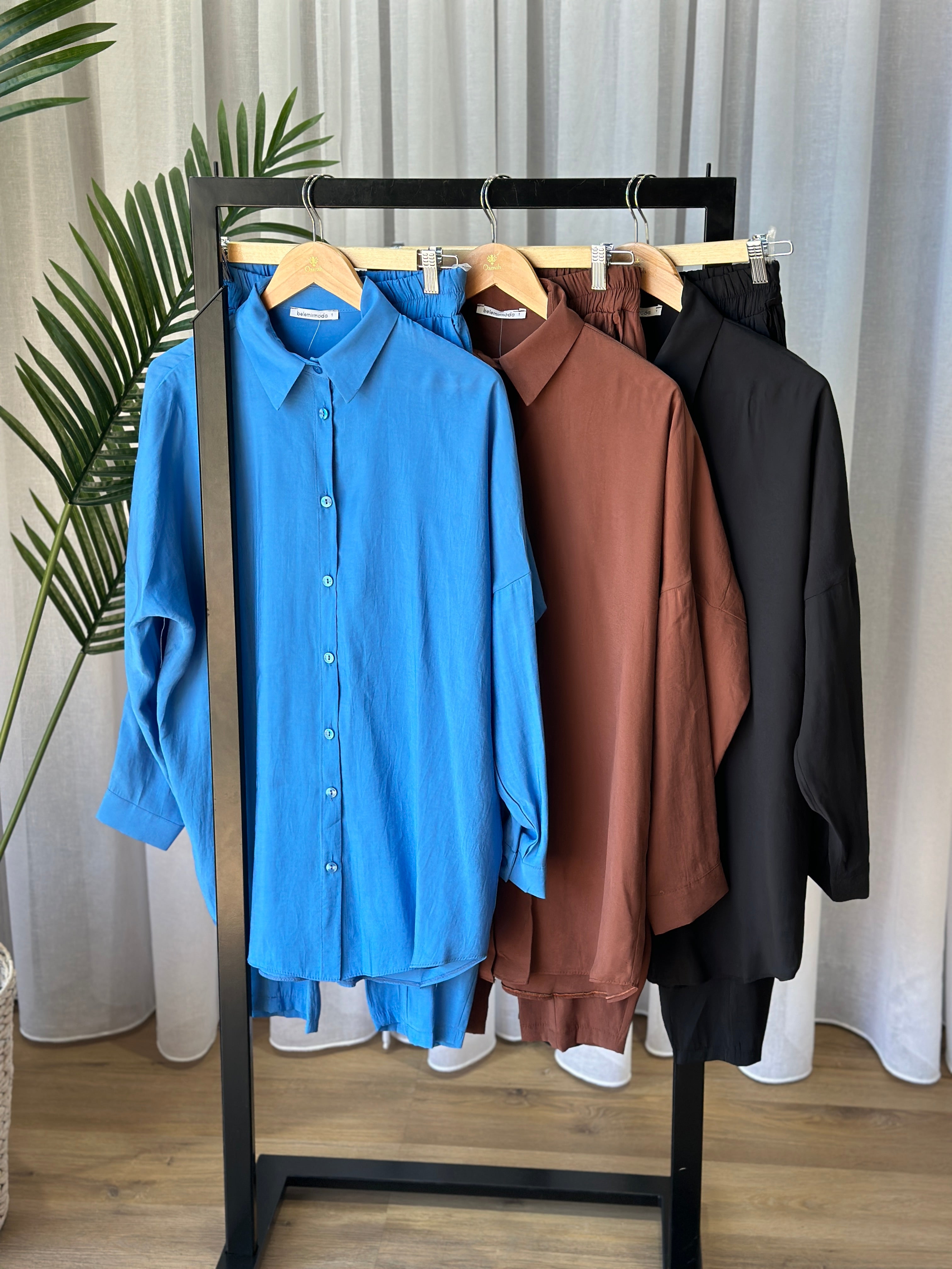 Description: The Nurel Set is a must have essential set. It is a standard button up with pants that have side pockets, elastic waist and a fitted cut.