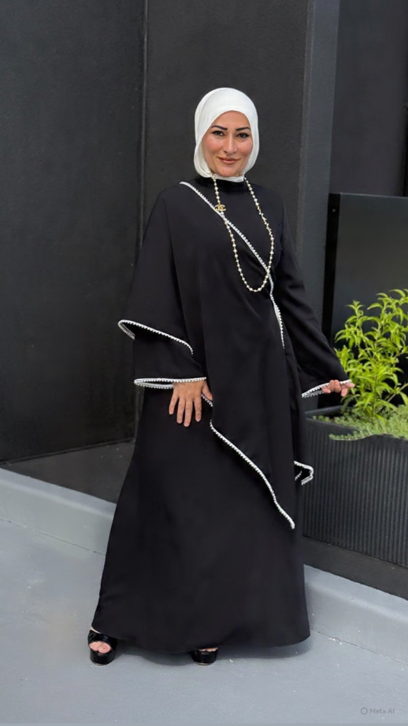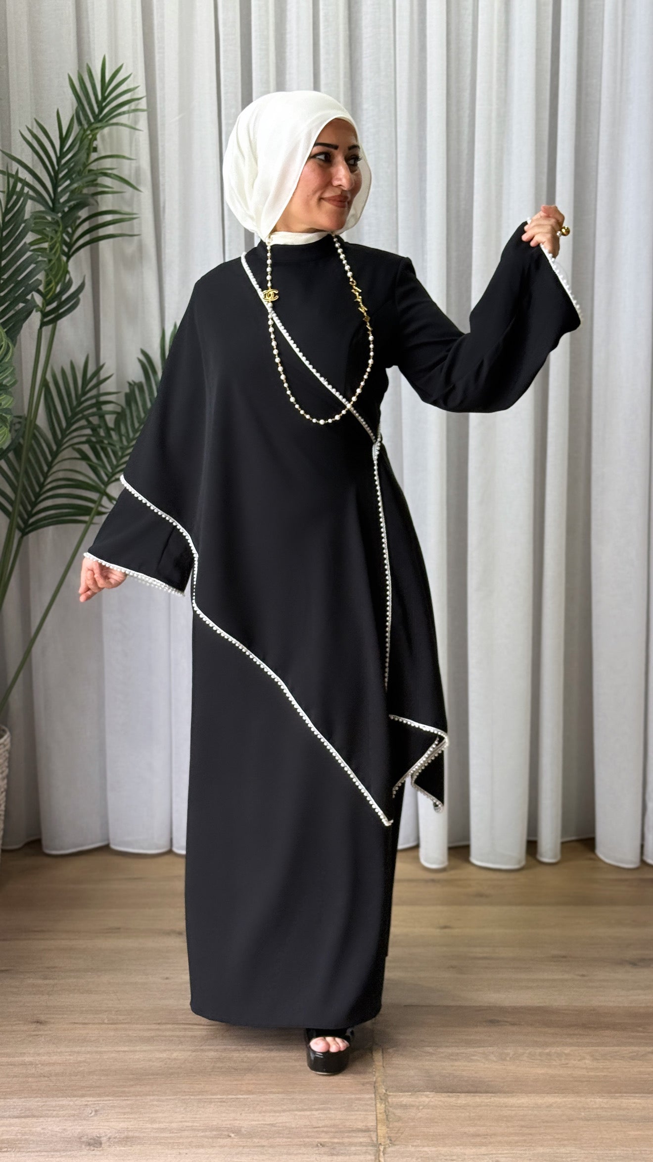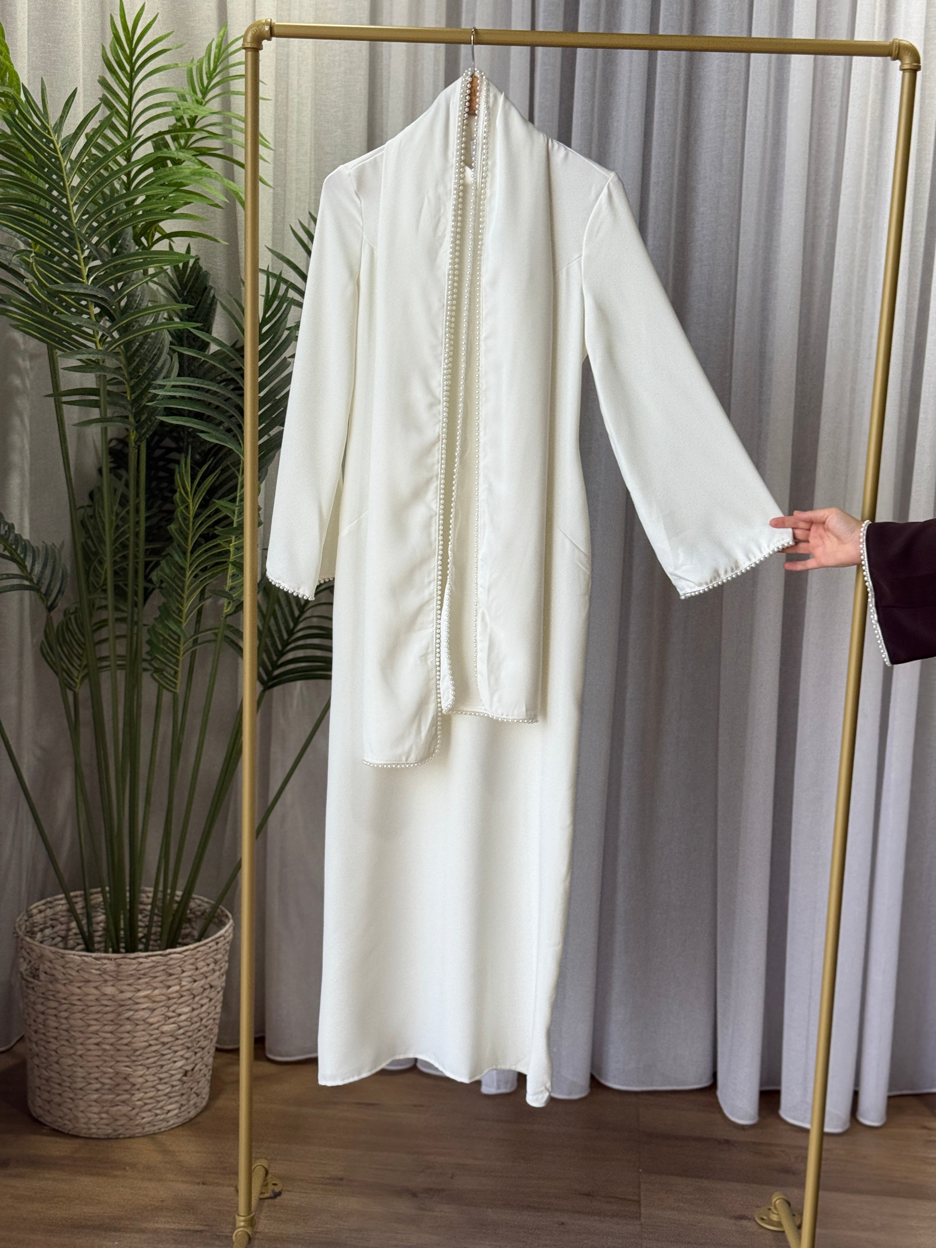 Description: Elegant straight full-length dress featuring delicate pearl embellishments at the sleeve cuffs, paired with a coordinating scarf adorned with pearls along both hem edges. A refined ensemble perfect for special occasions and formal gatherings.