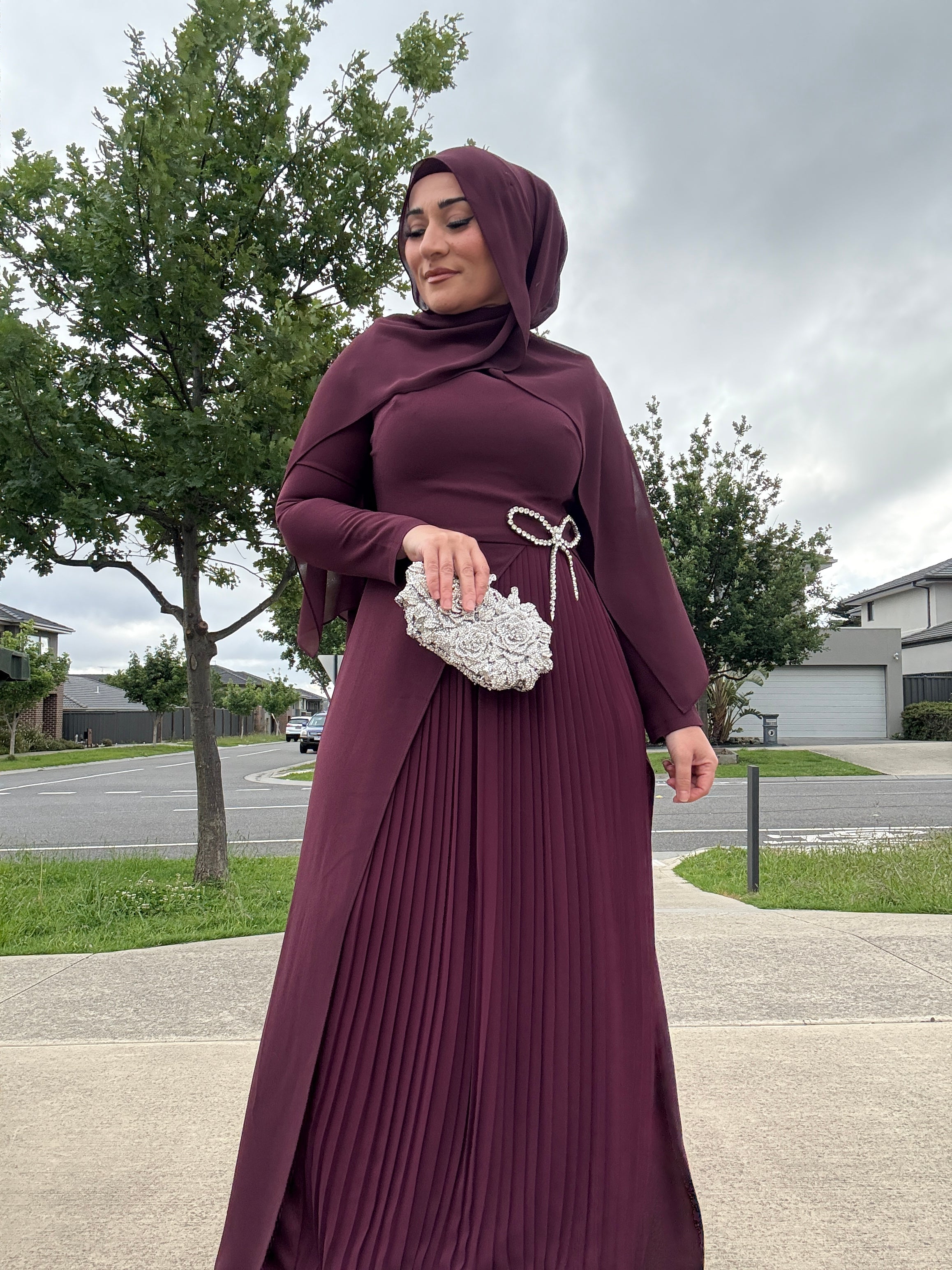 Description: The Q Dress exemplifies refined tailoring with architectural design elements that elevate any occasion. This sophisticated piece features a gracefully pleated skirt that creates fluid movement and visual interest, paired with elegant cape sleeves that frame the shoulders with understated drama. A jeweled bow accent at the waist provides a focal point of luxury, defining the silhouette while adding a distinctive touch of glamour. The thoughtful construction balances structure with fluidity, allowing the dress to transition seamlessly from daytime events to evening occasions. Crafted for those who appreciate quality craftsmanship and timeless elegance, the Q Dress is a versatile investment piece that commands attention through its refined proportions and carefully considered details rather than excessive embellishment.