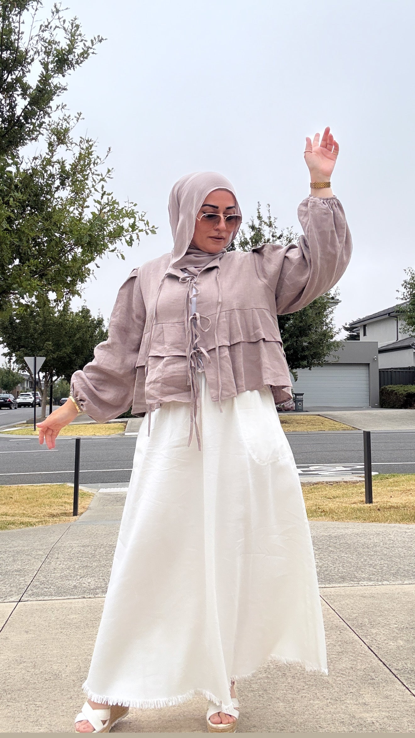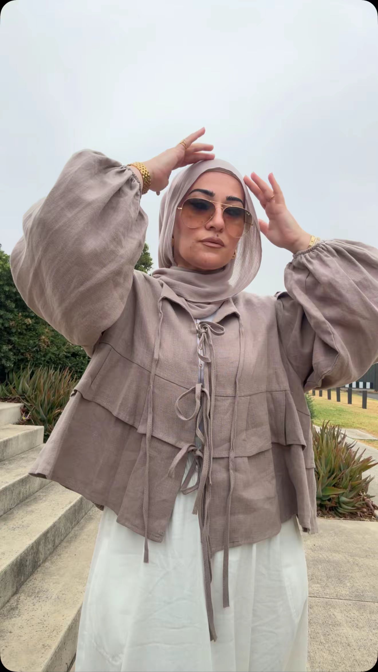 Description: The Ruffle Cardi is stunning. It features a relaxed fit with long sleeves gathered at the cuffs with a slight puff at the sleeves. The neckline is round. The front of the cardi has a multiple tie up closure. The cardi has layered ruffles. The cardi is breathable, comfortable and perfect for layering.