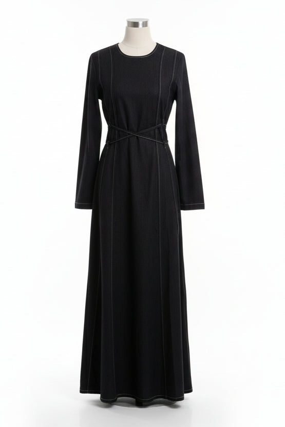 Description: The Ruqaya Dress is a stunning dress. The tailored silhouette, combined with its unique fabric, creates a look both sophisticated and comfortable. Featuring elegant detailing and a flattering fit.