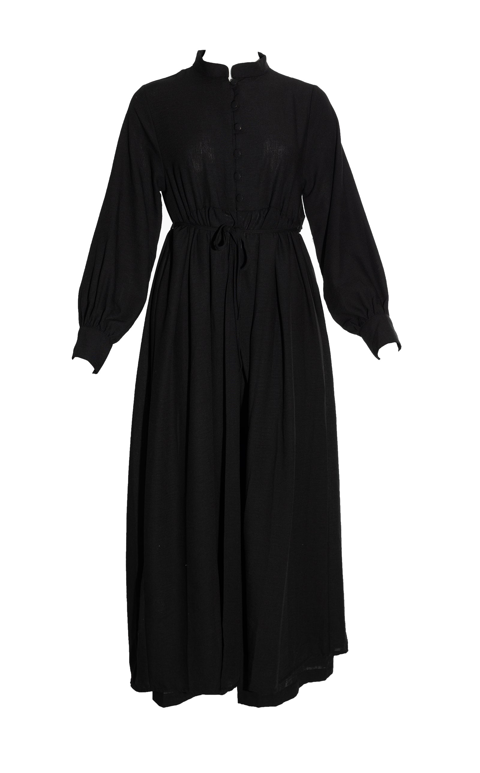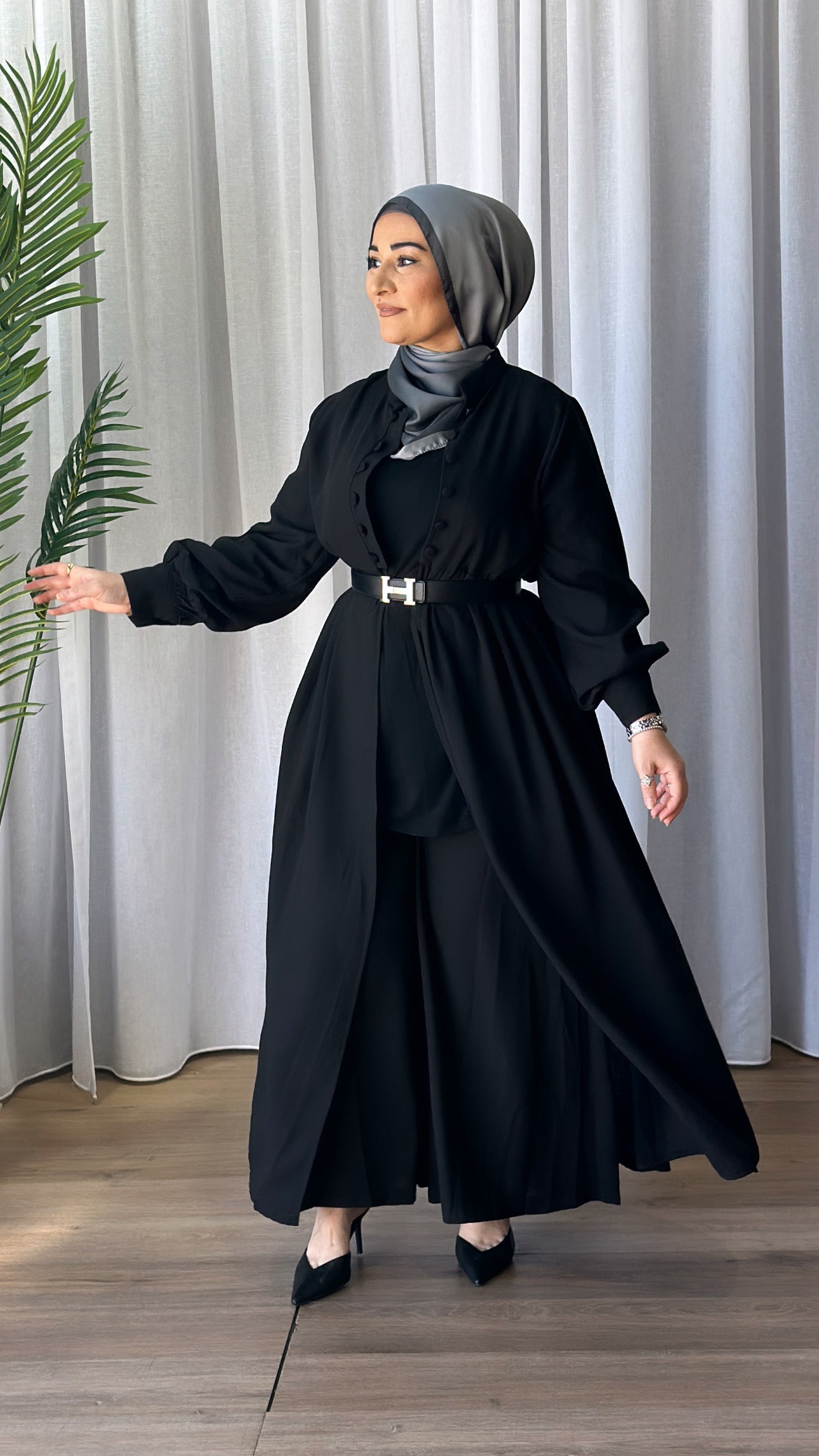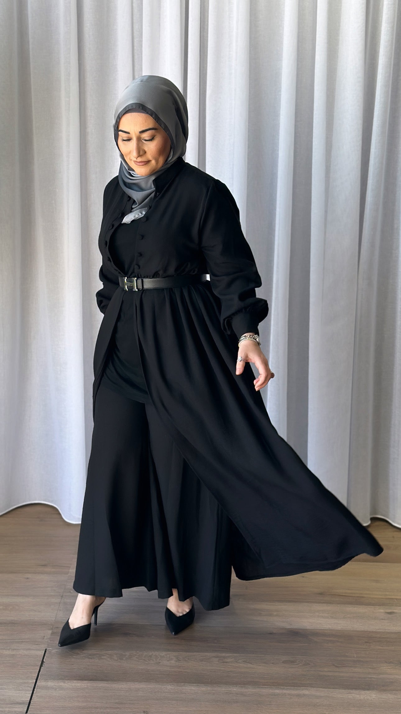 Description: The Safiye Set is a two-piece set. The top has half buttons then flows out to the floor. Comes with a belt, button cuff wrists and pockets on the sides. The Pants are loose fitting with an elastic waist and pockets on both sides.