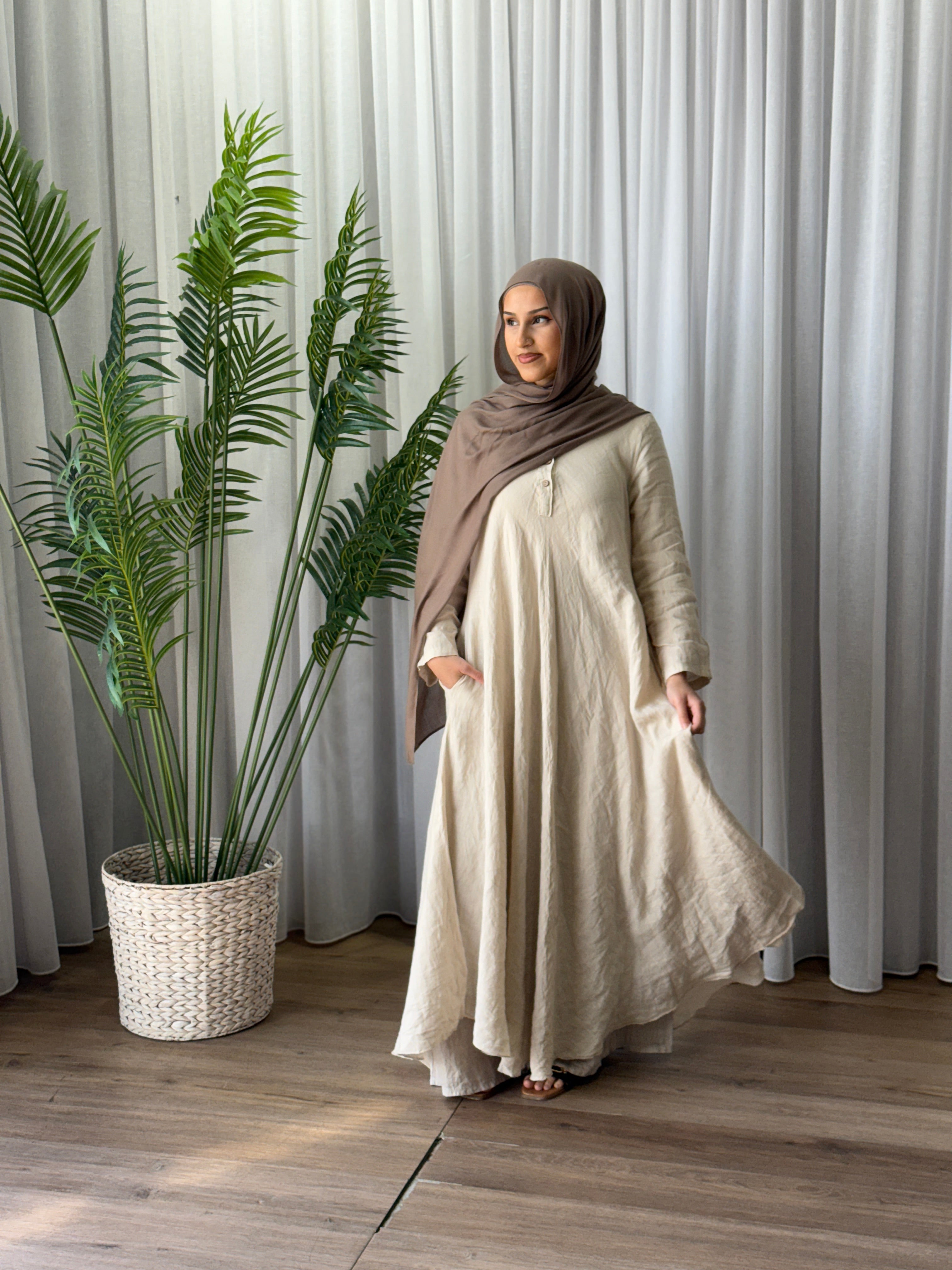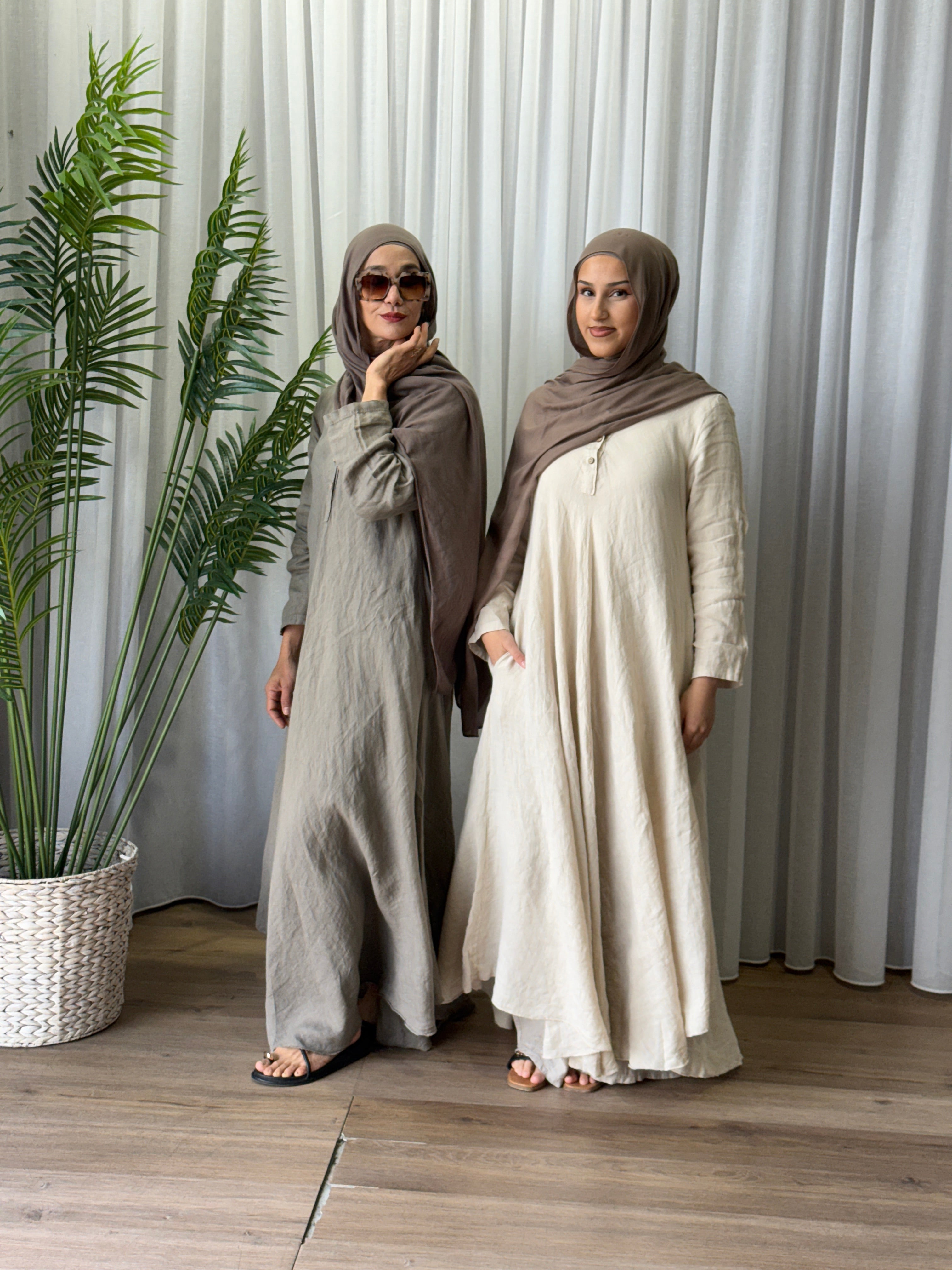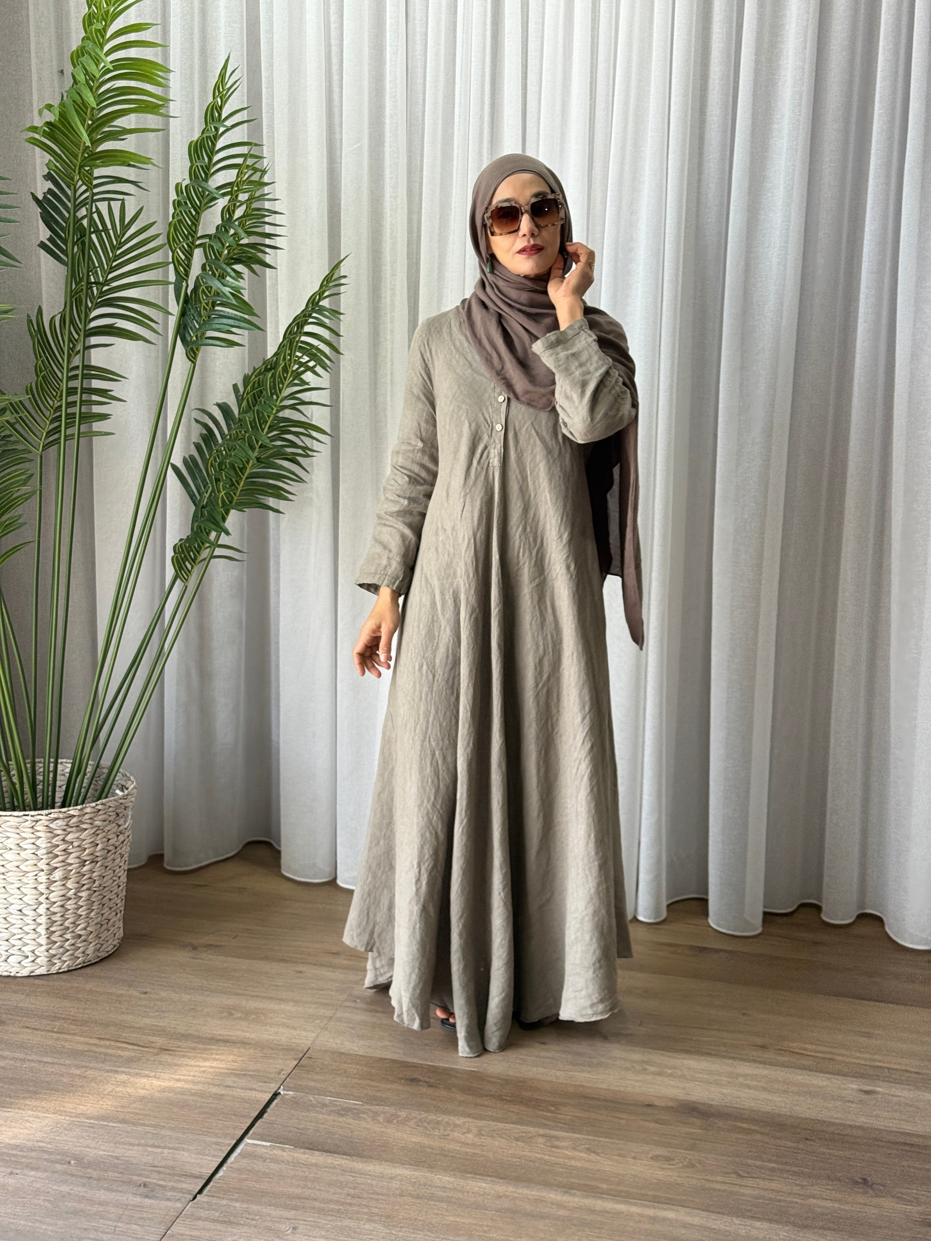 Description: The Seline Dress is a stunning dress, made in Italy with the finest Linen Material. It has a v neck collar, It has a very wide A Line cut to the lower half giving that little bit more room and breathability. Part of the Spring/Summer 25 Collection