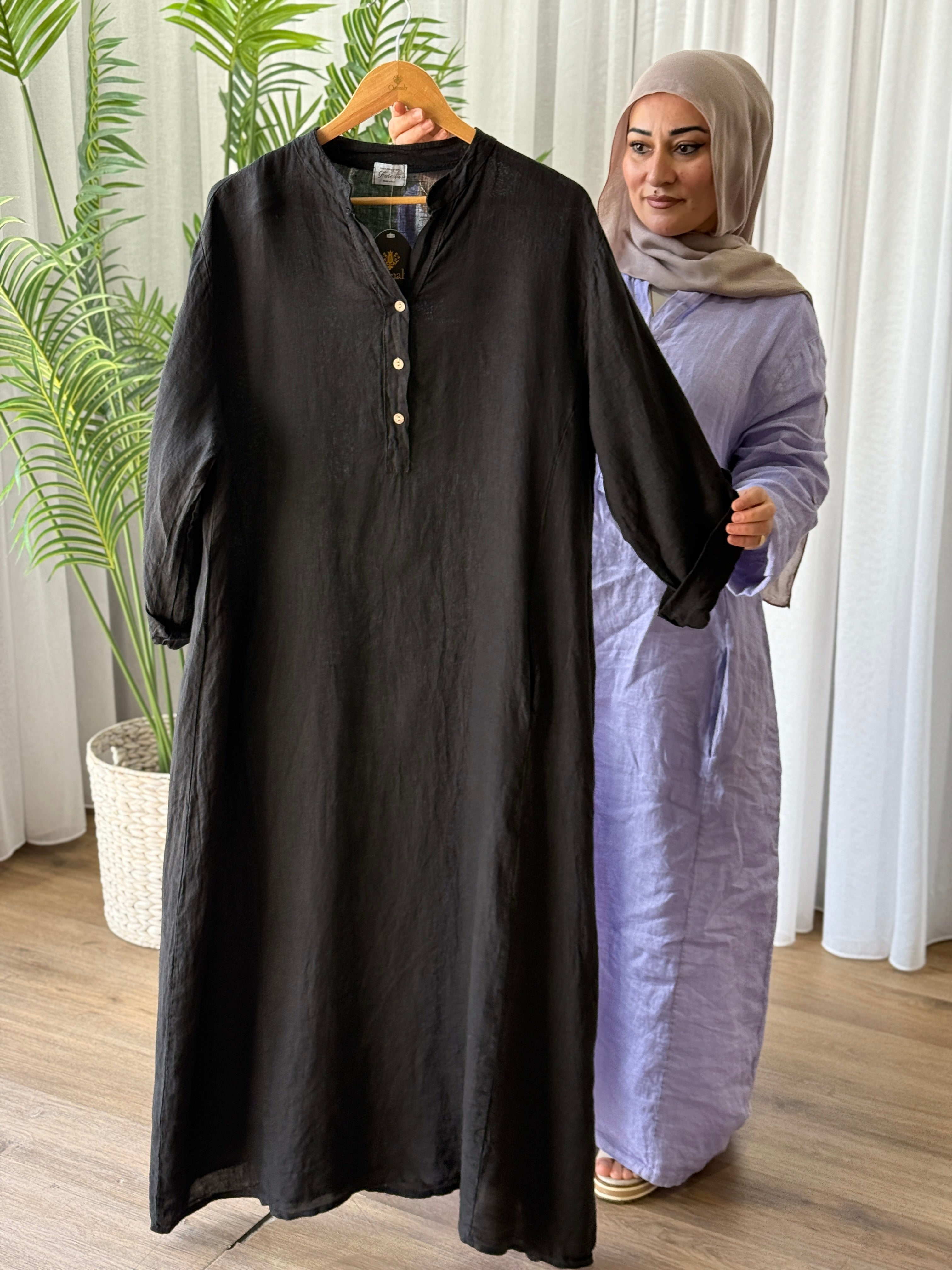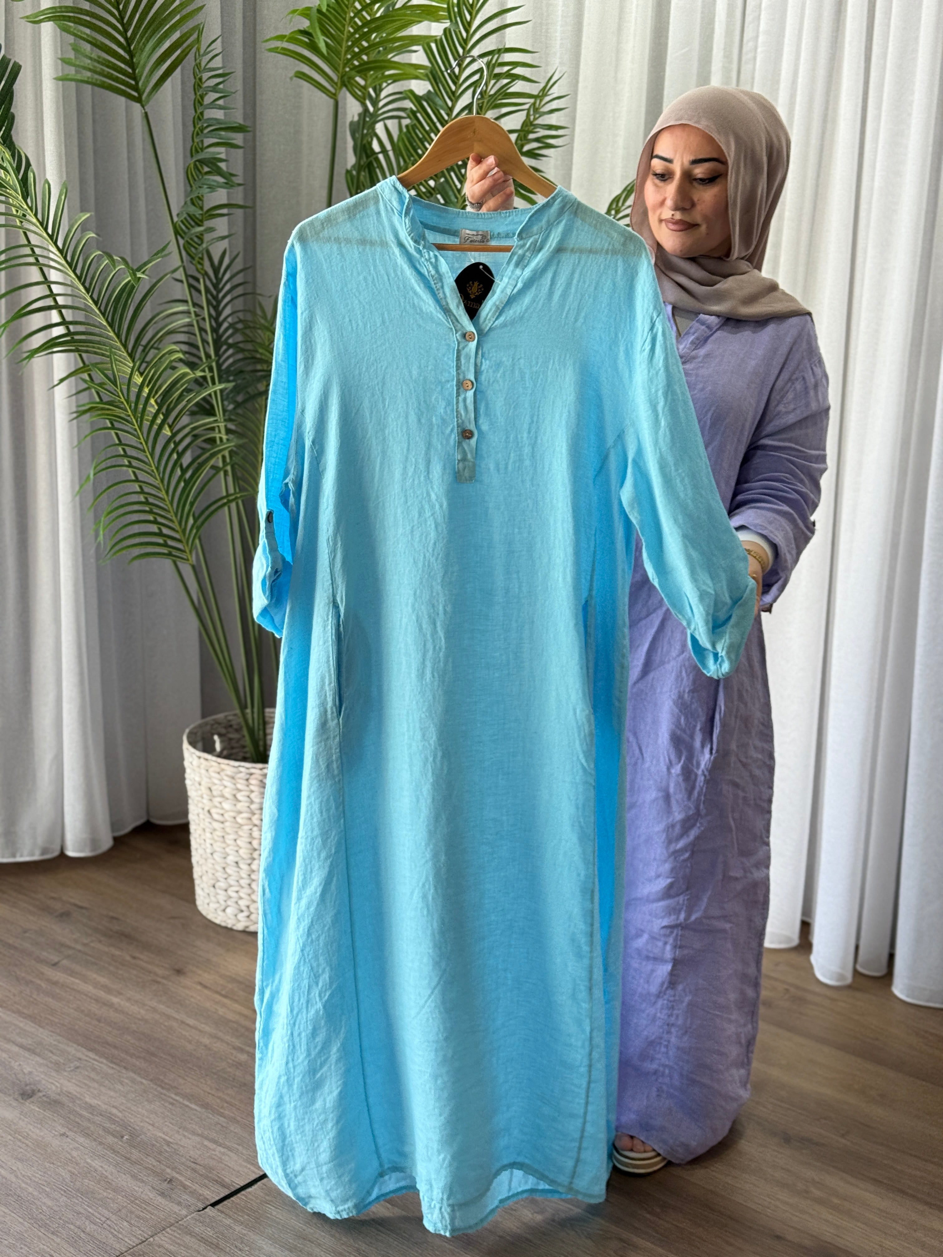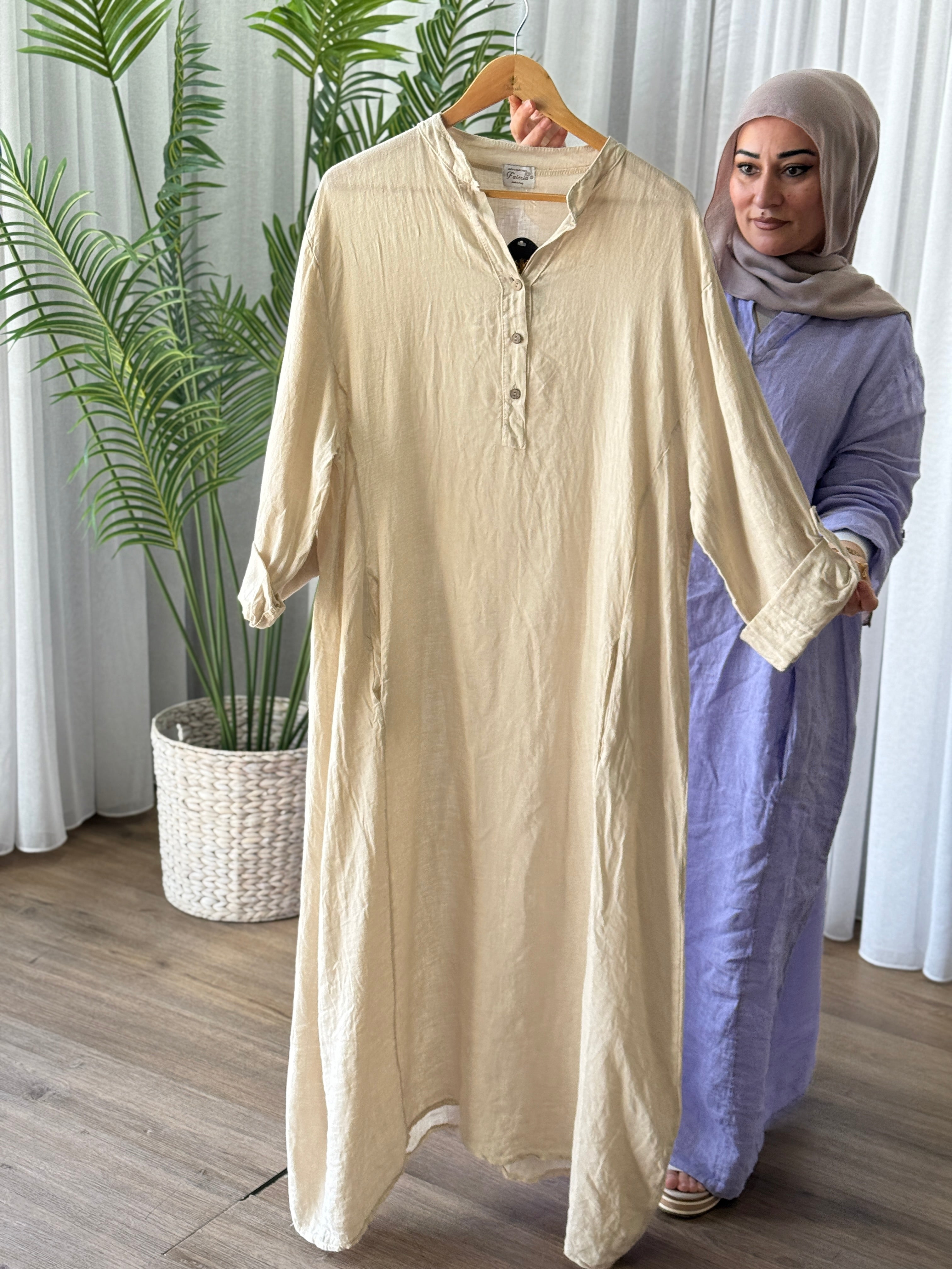 Description: The Shati Linen Dress is a must-have for anyone seeking an effortlessly loose yet stylish outfit perfect for daily wear or a beach day, especially with warmer weather on the horizon. Featuring a grandpa collar, drop shoulders for added comfort, a loose fit, and breathable fabric, it's both chic and practical.