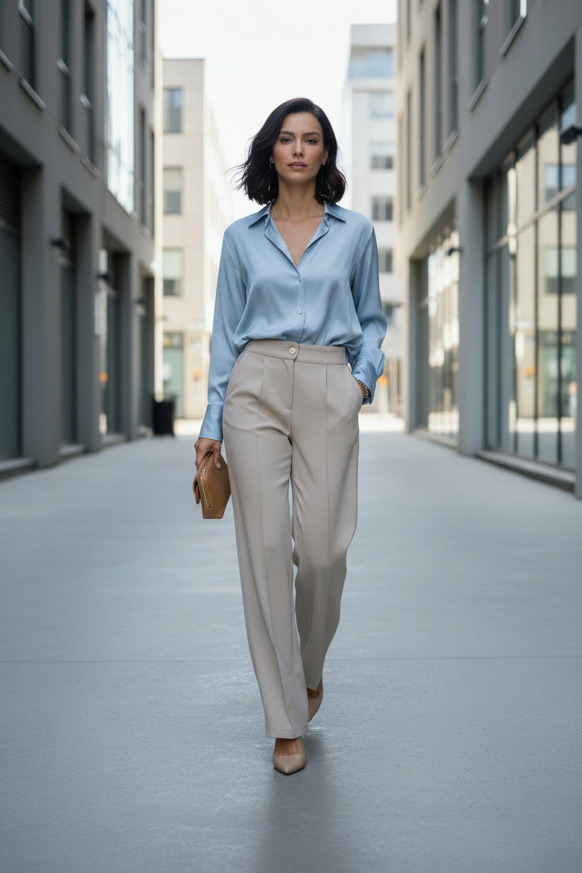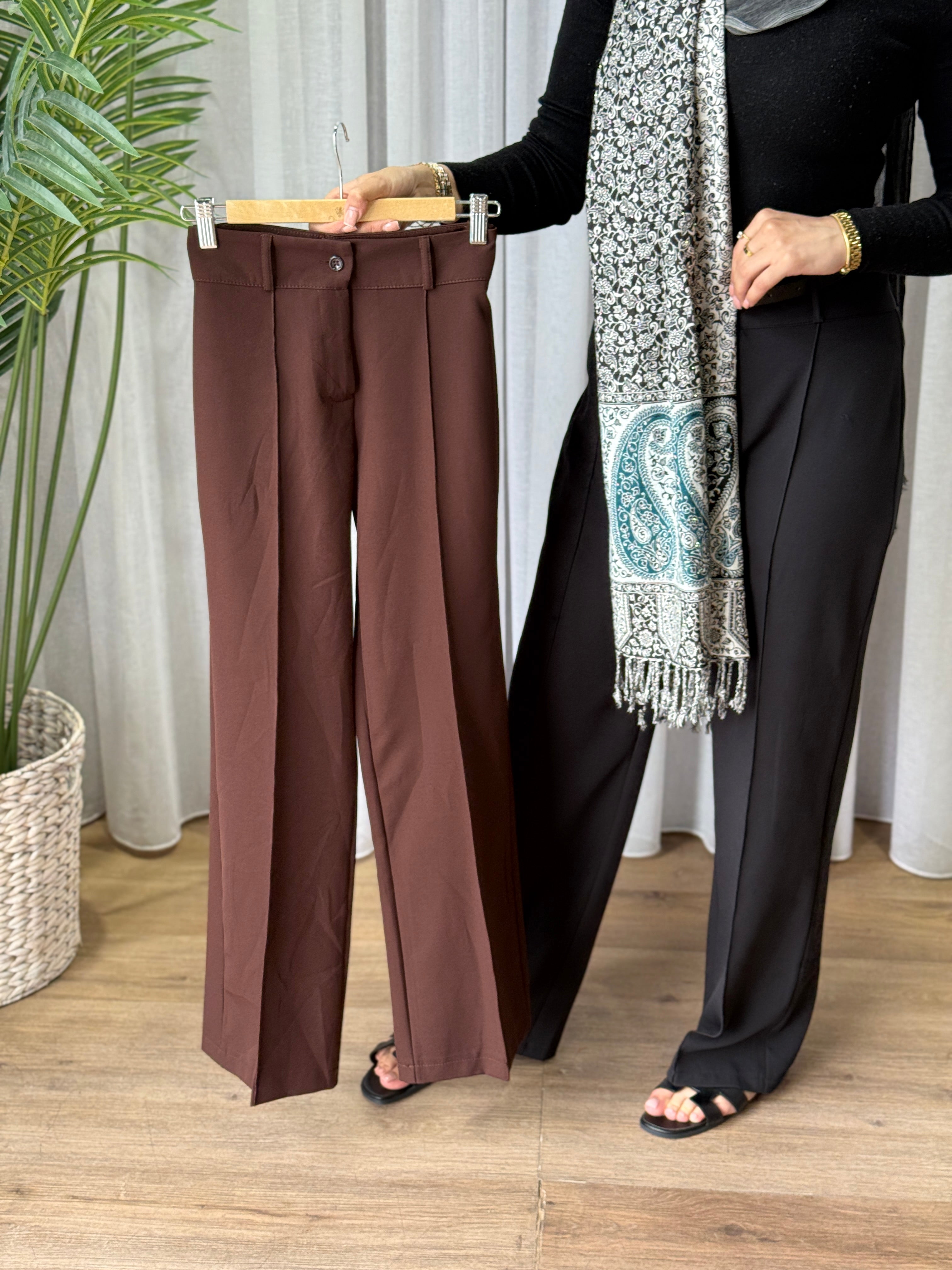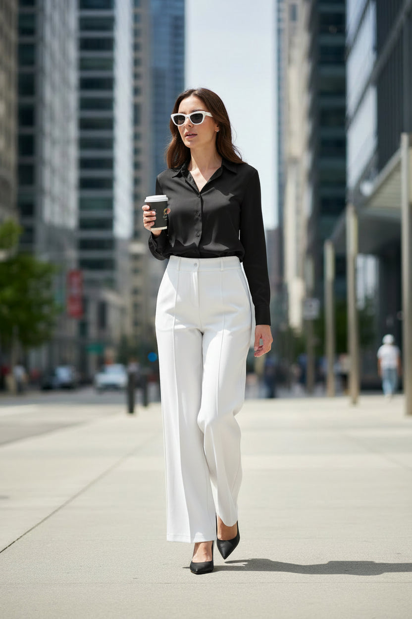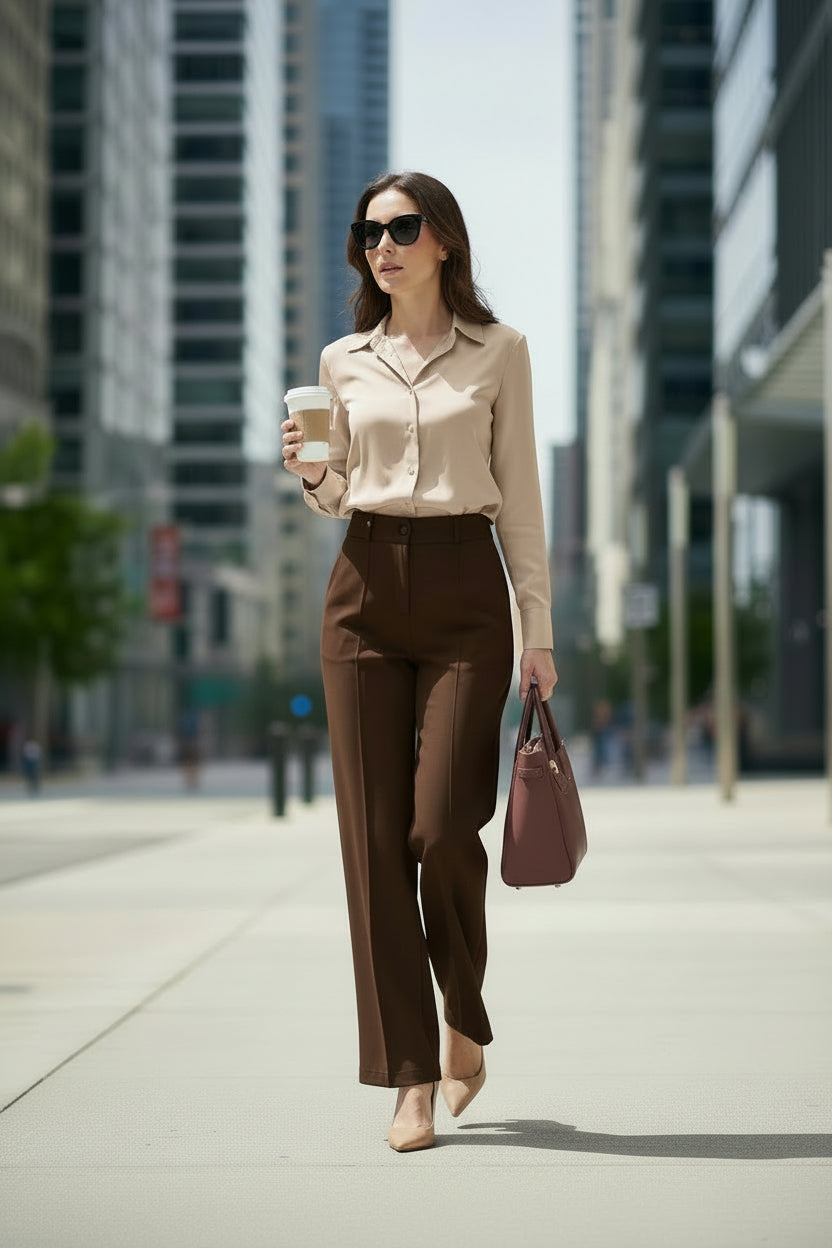 Description: The Slacks are stunning. They have a classic, tailored cut with a flat front and a button and zipper closure. There are belt loops at the waistband, and the fabric is smooth. They also feature a neatly pressed crease down the front of each leg, giving them a polished look.