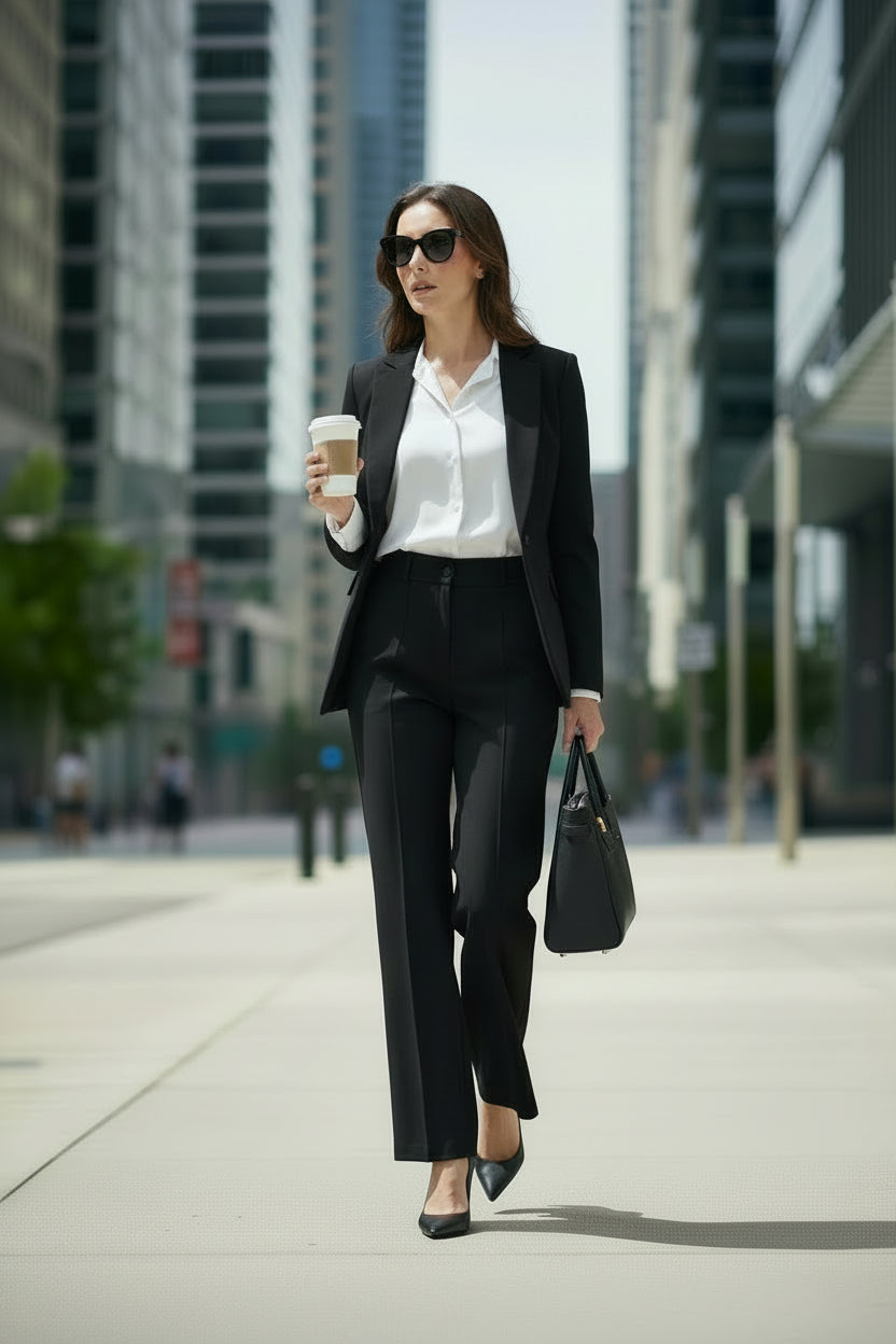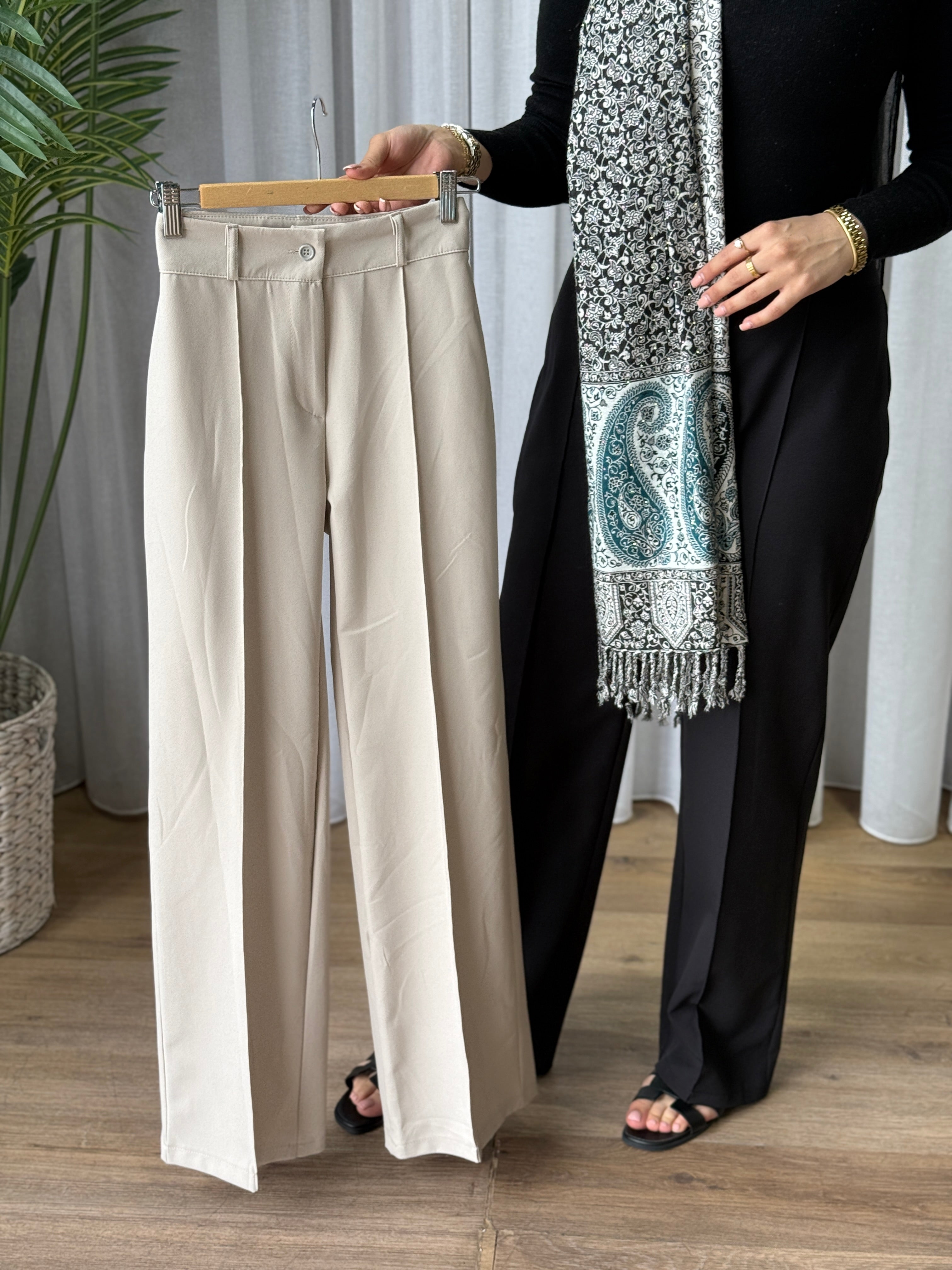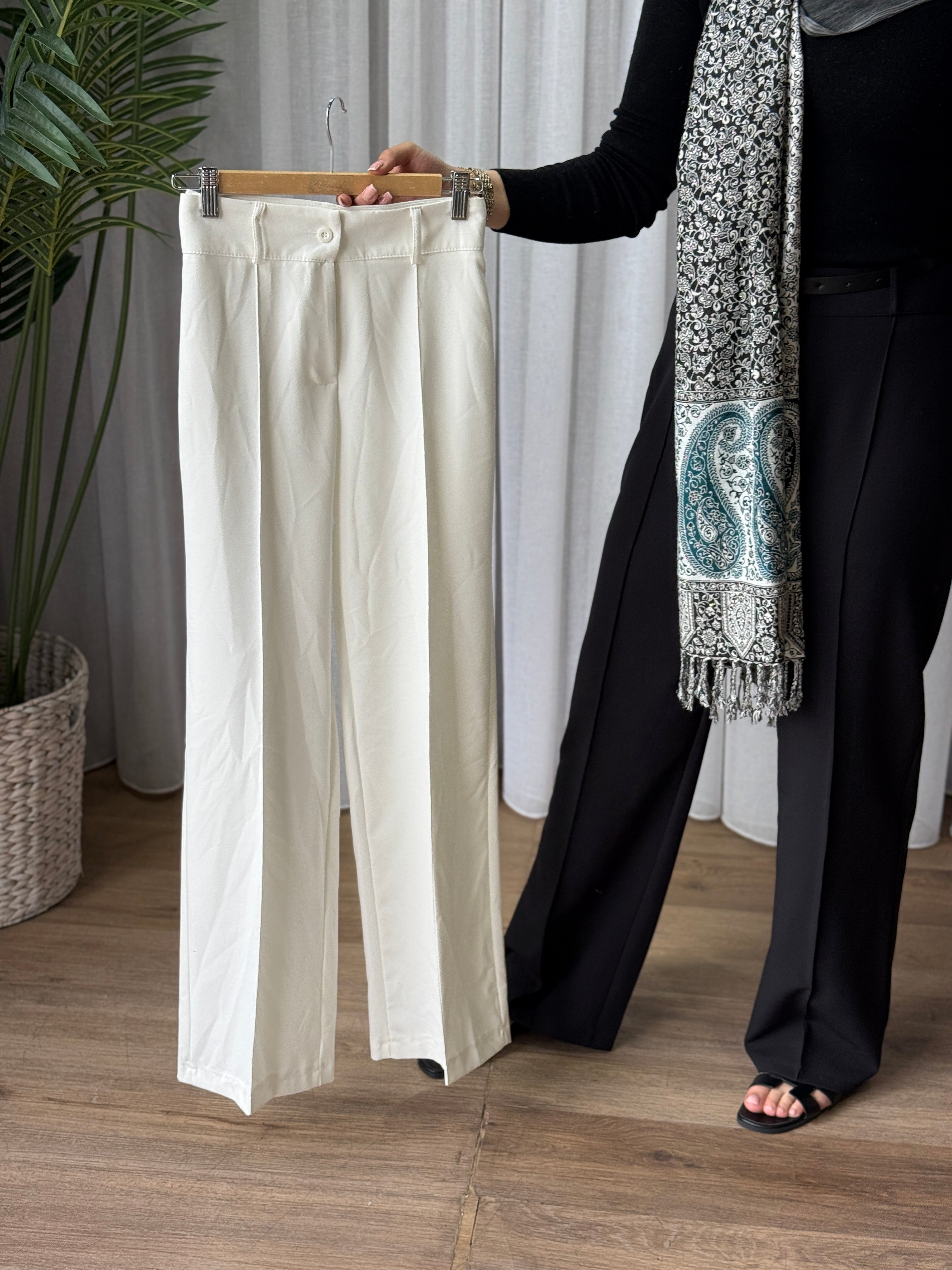 Description: The Slacks are stunning. They have a classic, tailored cut with a flat front and a button and zipper closure. There are belt loops at the waistband, and the fabric is smooth. They also feature a neatly pressed crease down the front of each leg, giving them a polished look.