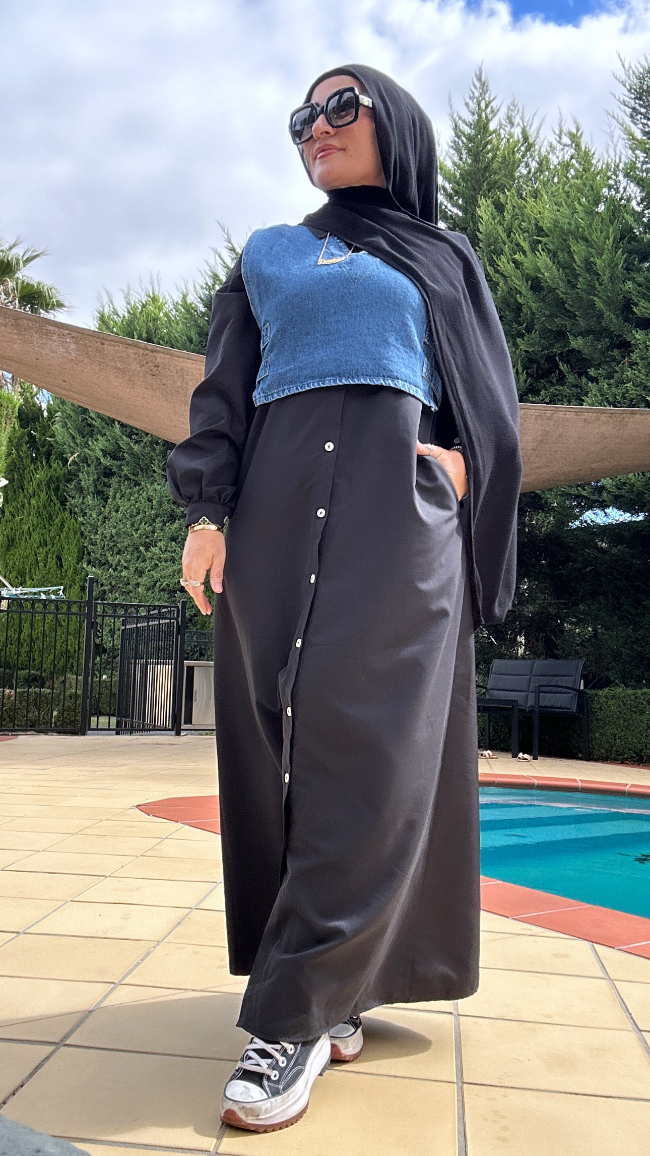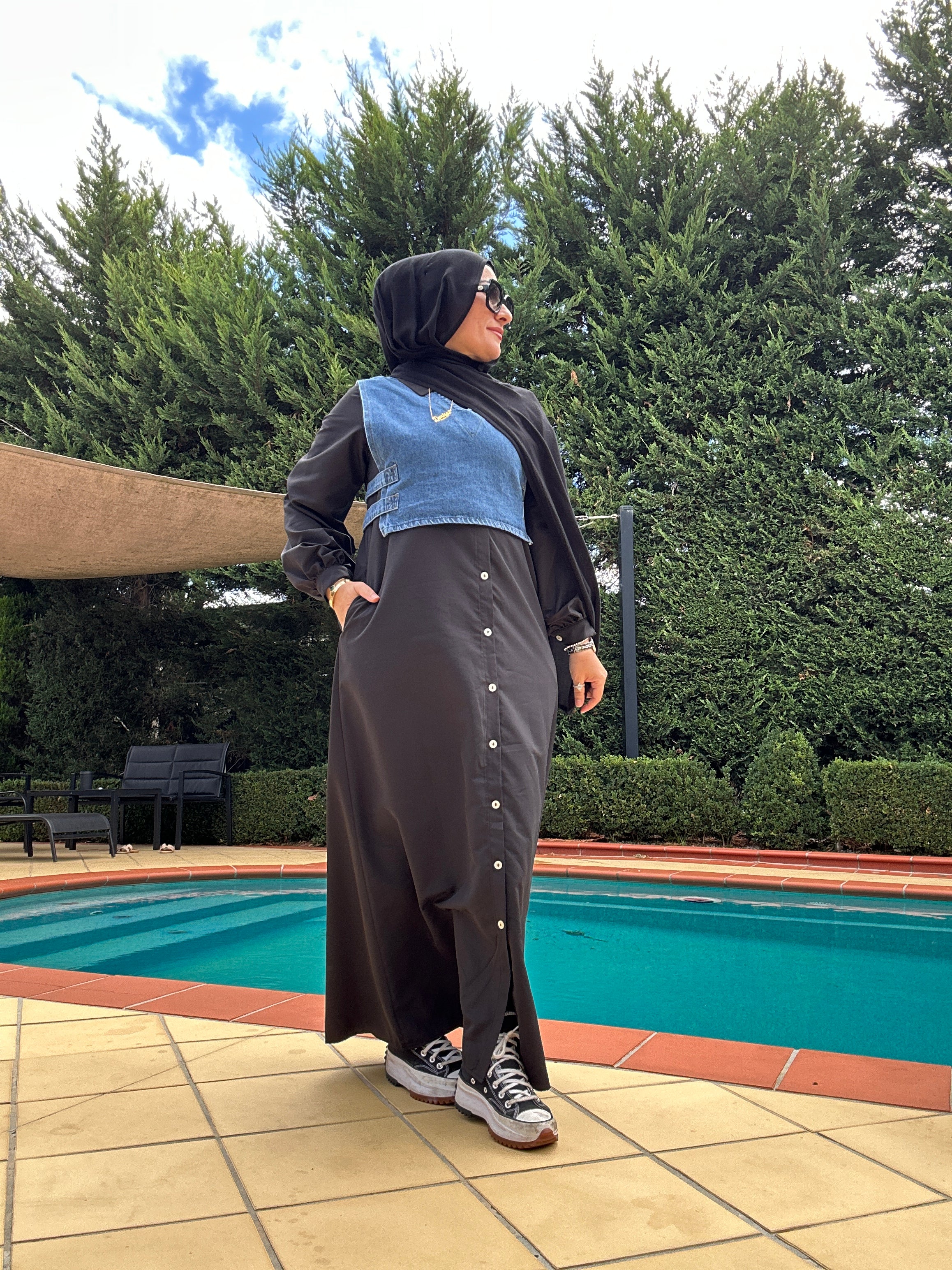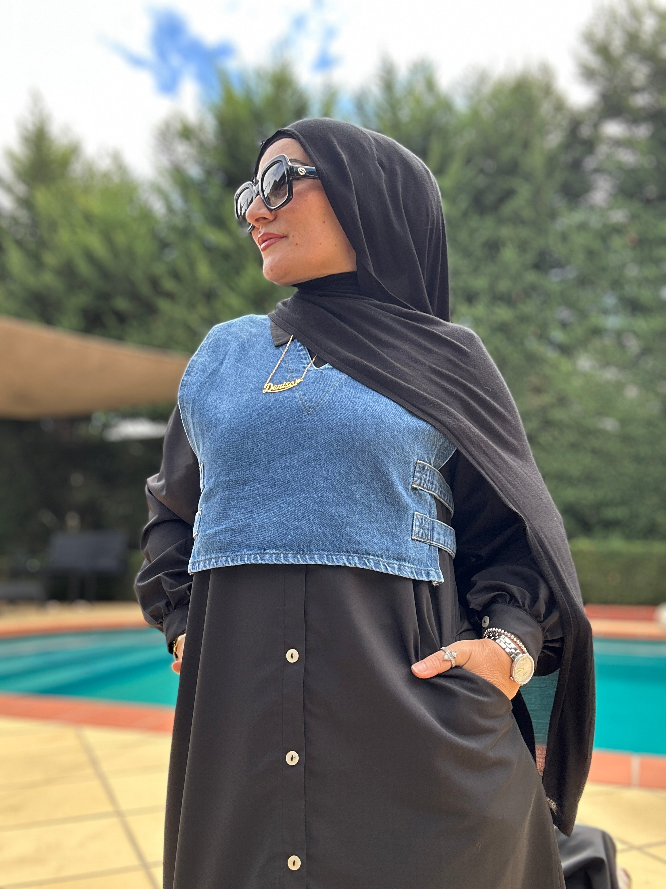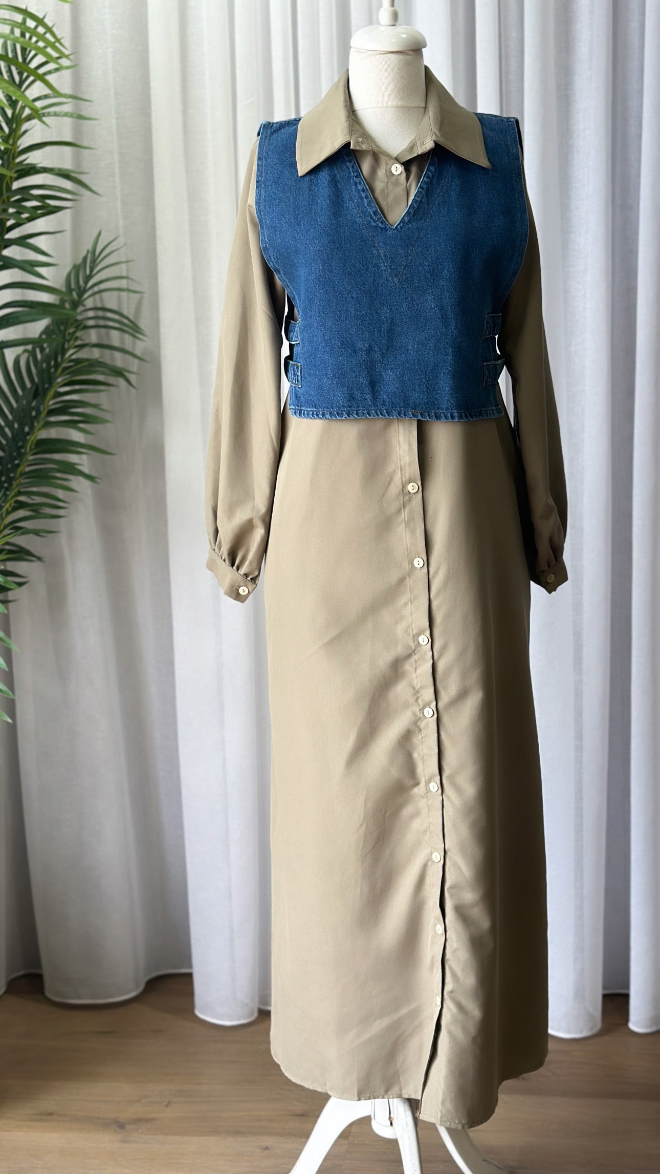 Description: The Stella Dress is a stunning dress. It has an outer denim vest; the inner dress is a long button up which has side pockets and is fully buttoned.