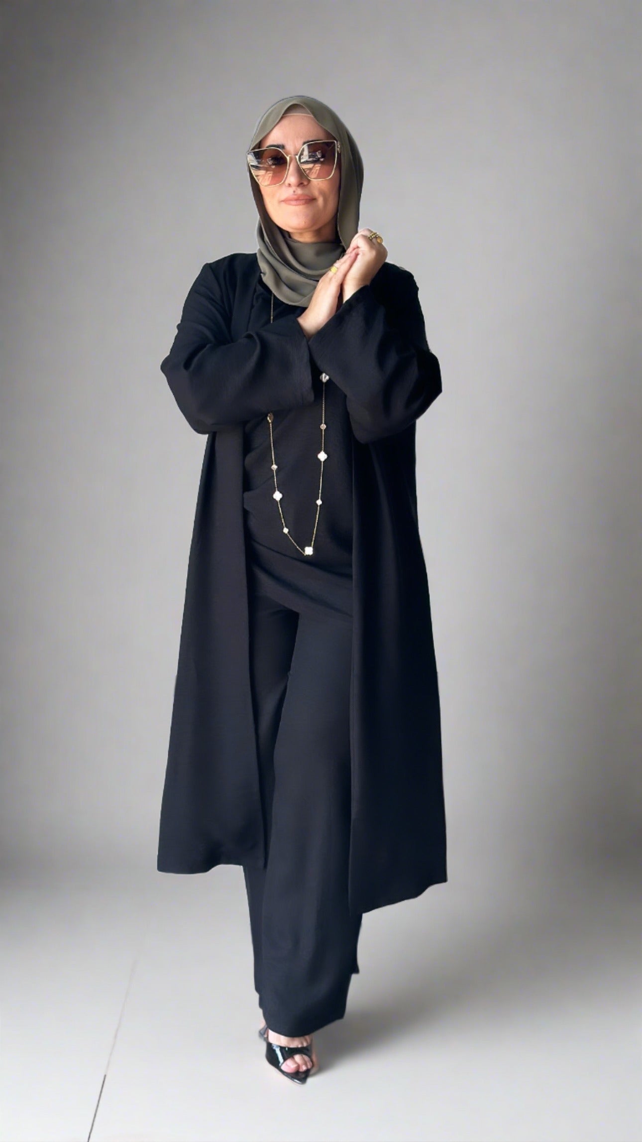 Description: The Sunduz Cardi Set is a three piece set which includes an inner top, pants and an outer flowy cardigan. The inner is sleeveless with an adjustable string design. The Cardi style is like an abaya with loose flowy sleeves. The pants have an elastic waist and it is a loose, straight cut. This can be worn casually or dressed up.