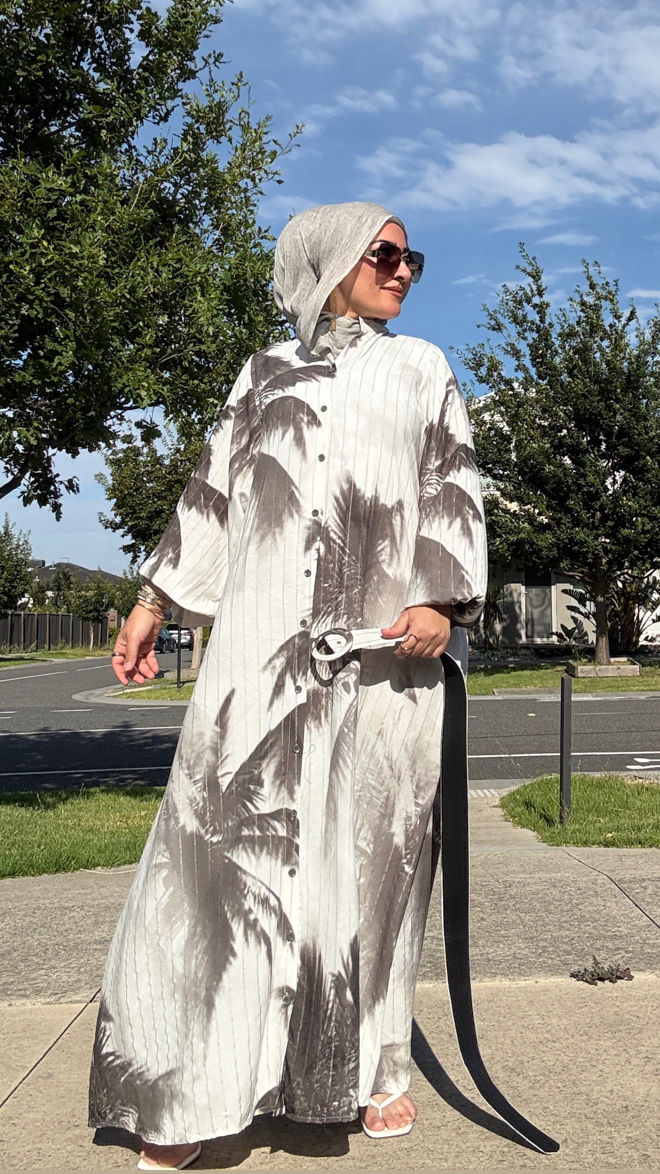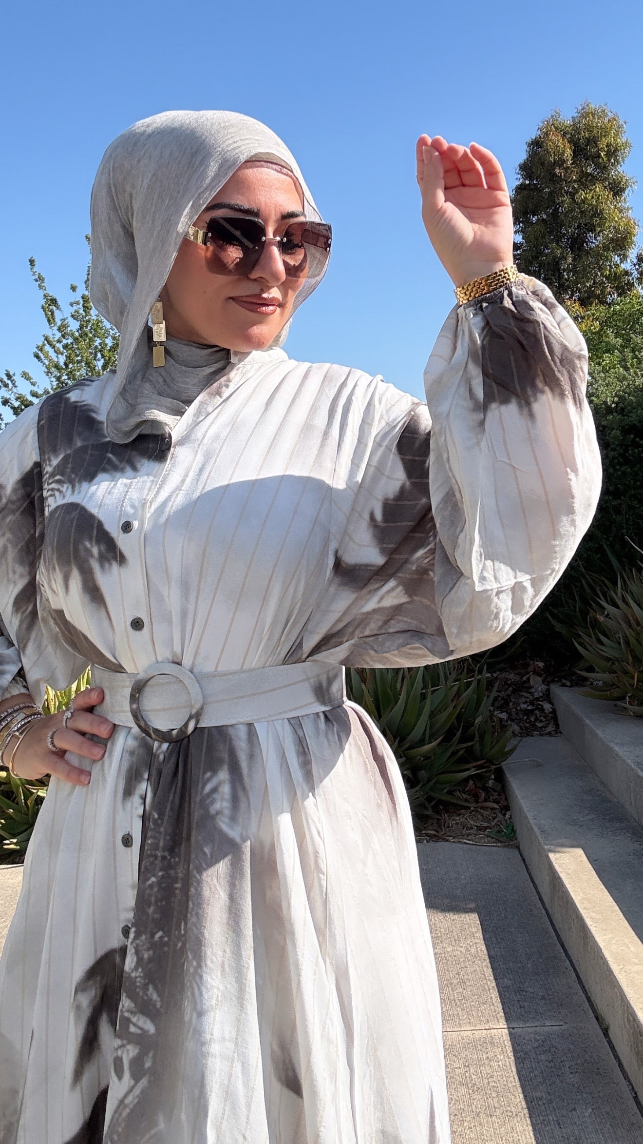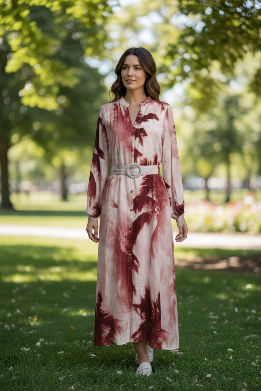 Description: The Tie Dye Dress is a stunning dress. This flowing piece features soft vertical pleats and an abstract neutral print. The lightweight fabric drapes beautifully, while the full button-down front and long balloon sleeves offer comfort and coverage. A matching wide belt with a statement circular buckle cinches the waist for a flattering silhouette. Perfect for everyday wear or dressed-up occasions, this versatile dress transitions seamlessly from day to night.