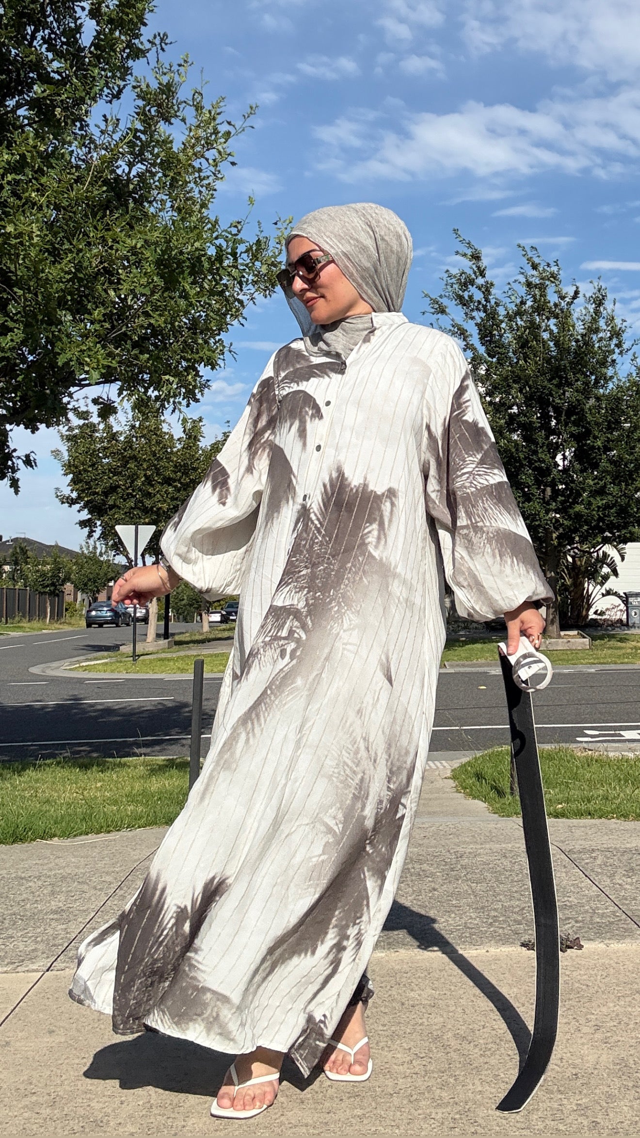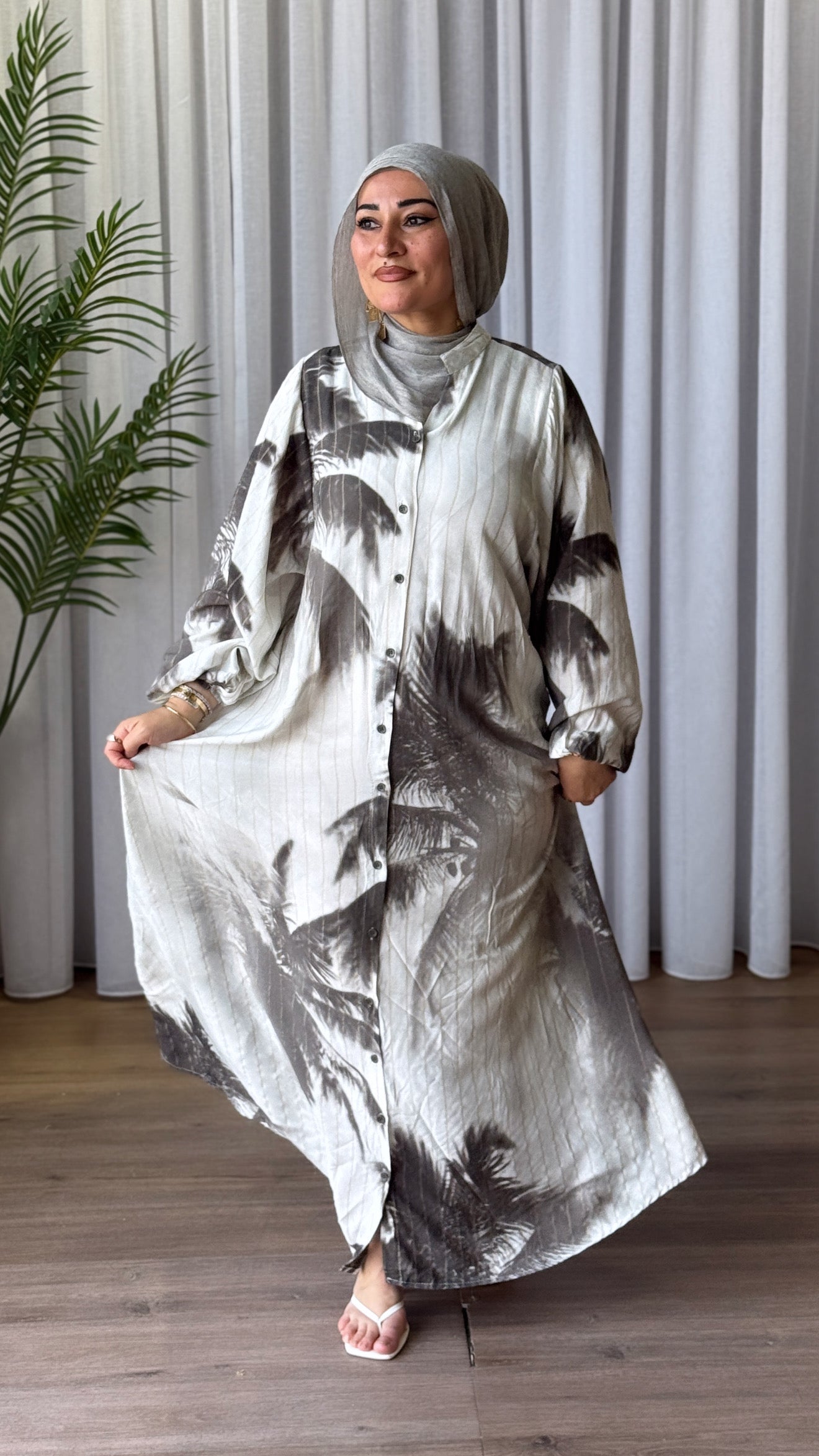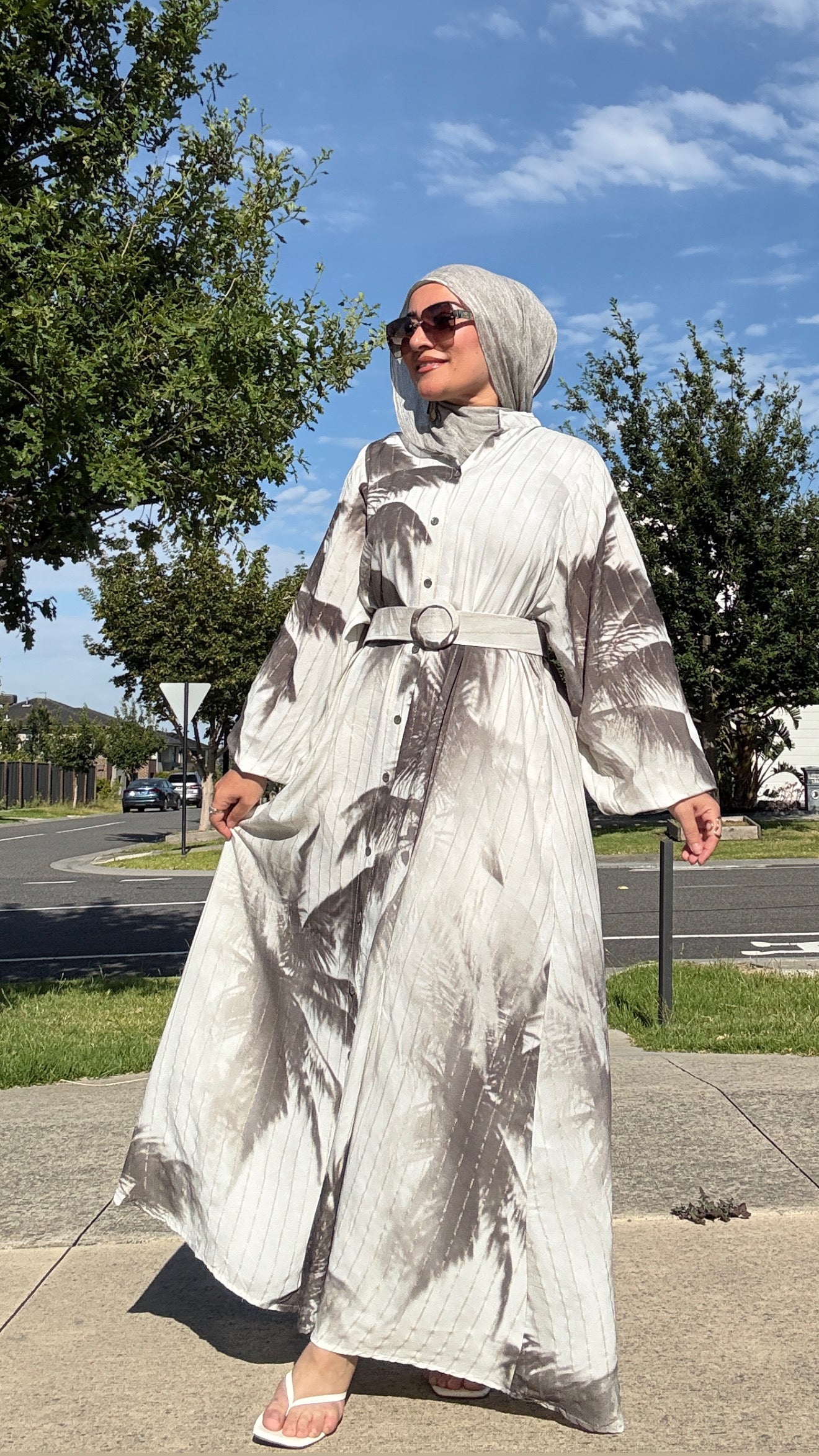 Description: The Tie Dye Dress is a stunning dress. This flowing piece features soft vertical pleats and an abstract neutral print. The lightweight fabric drapes beautifully, while the full button-down front and long balloon sleeves offer comfort and coverage. A matching wide belt with a statement circular buckle cinches the waist for a flattering silhouette. Perfect for everyday wear or dressed-up occasions, this versatile dress transitions seamlessly from day to night.