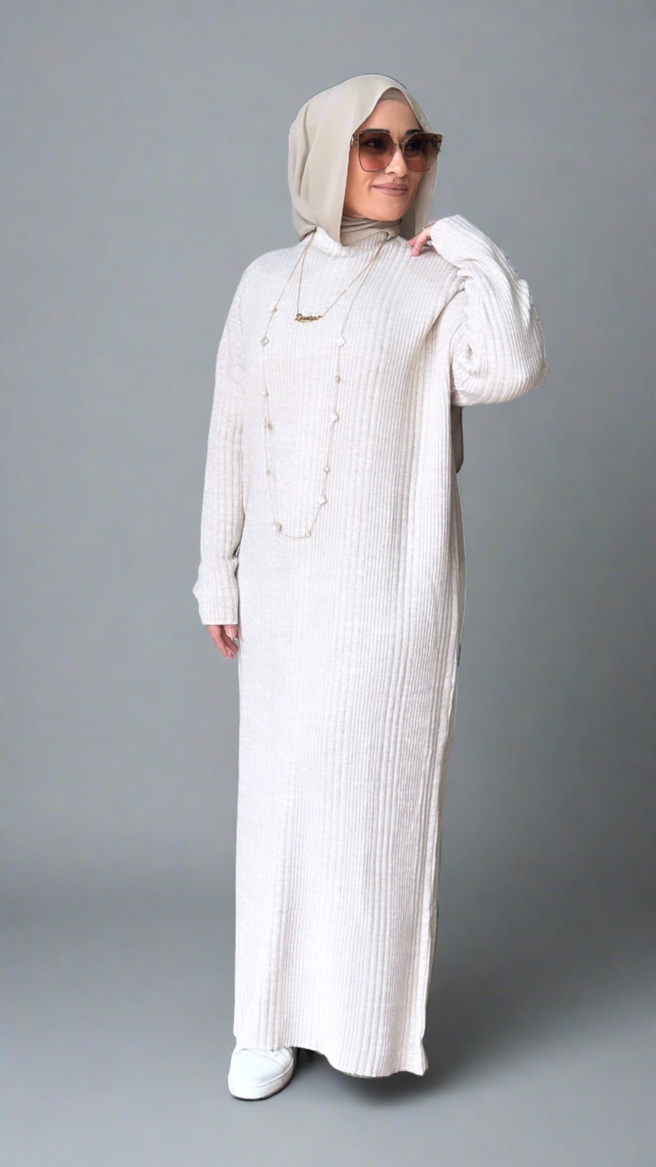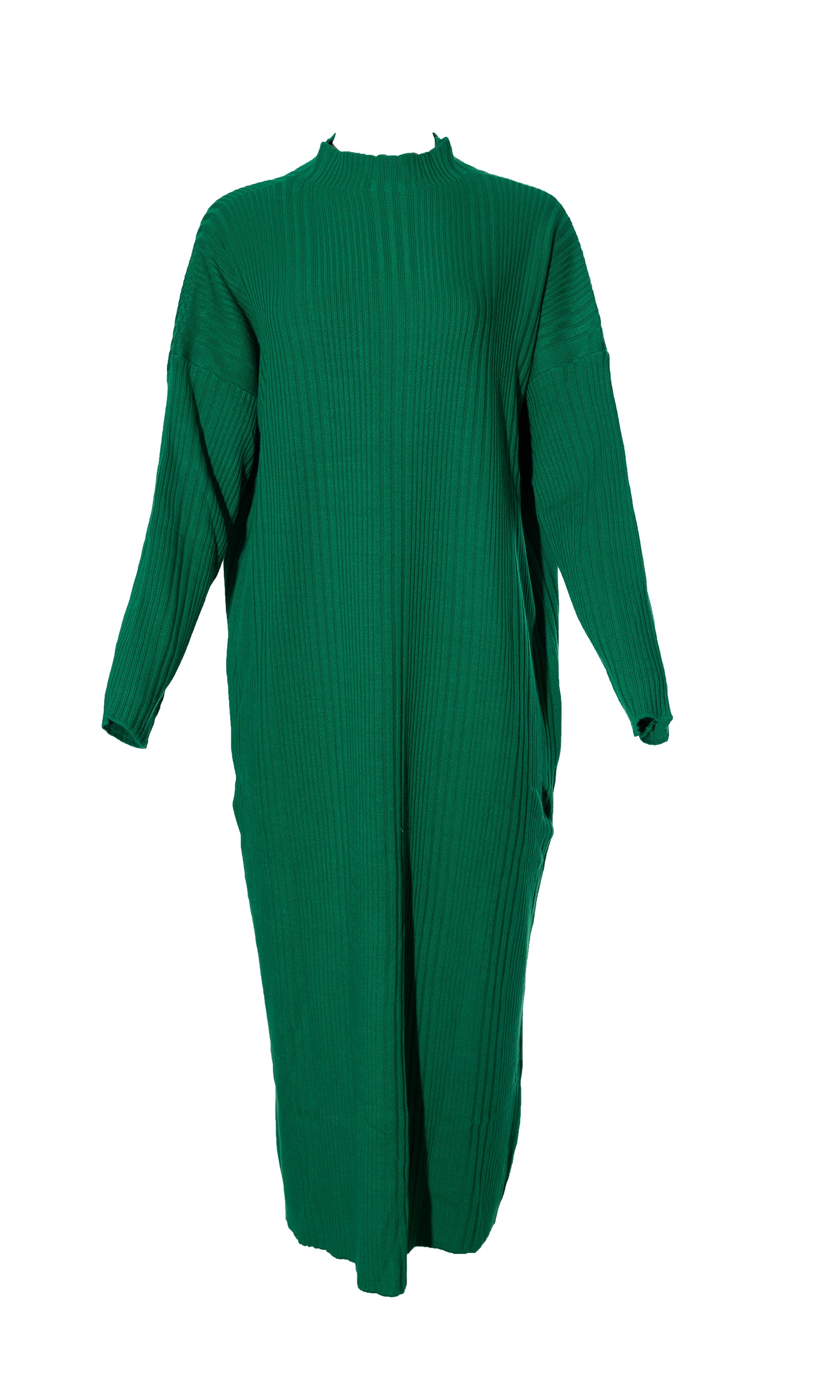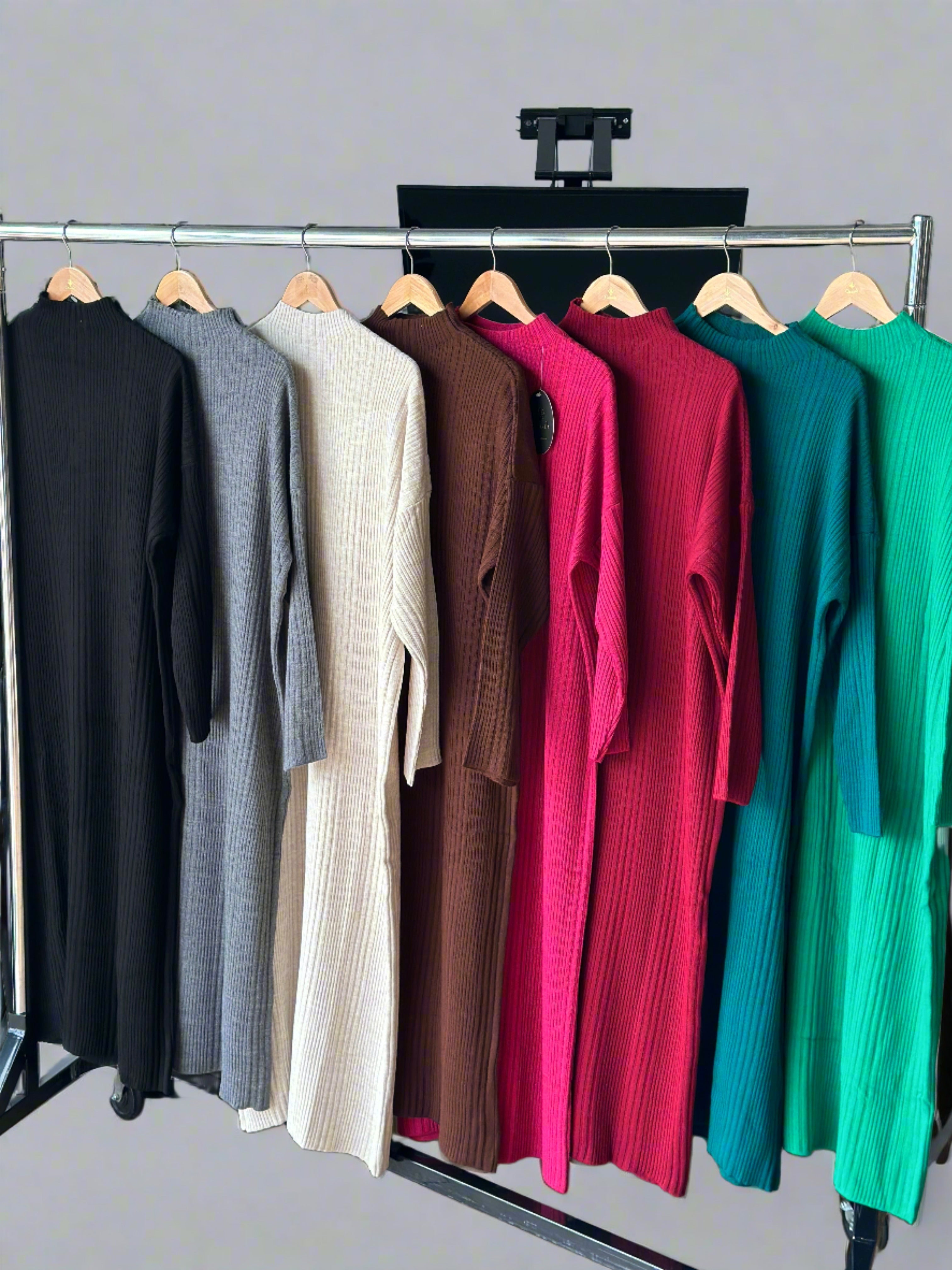 Description: The Tulz Dress is a must have for the cold days. It is a stretchy ribbed dress with loose sleeves and a high neckline. Can be layered or worn by itself.