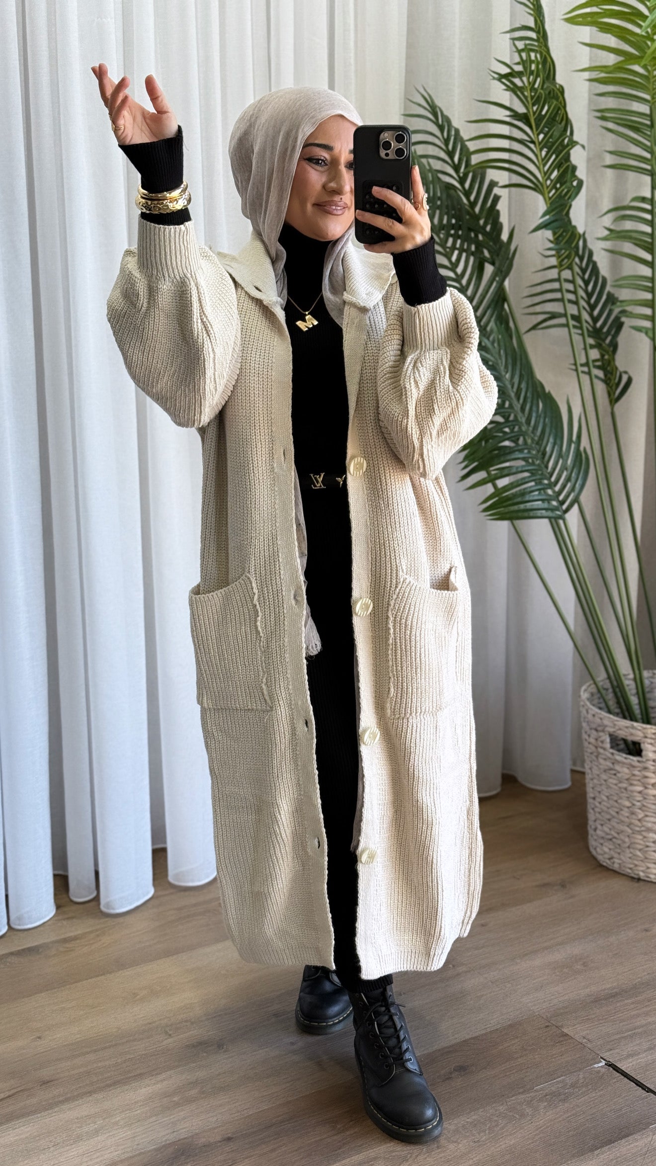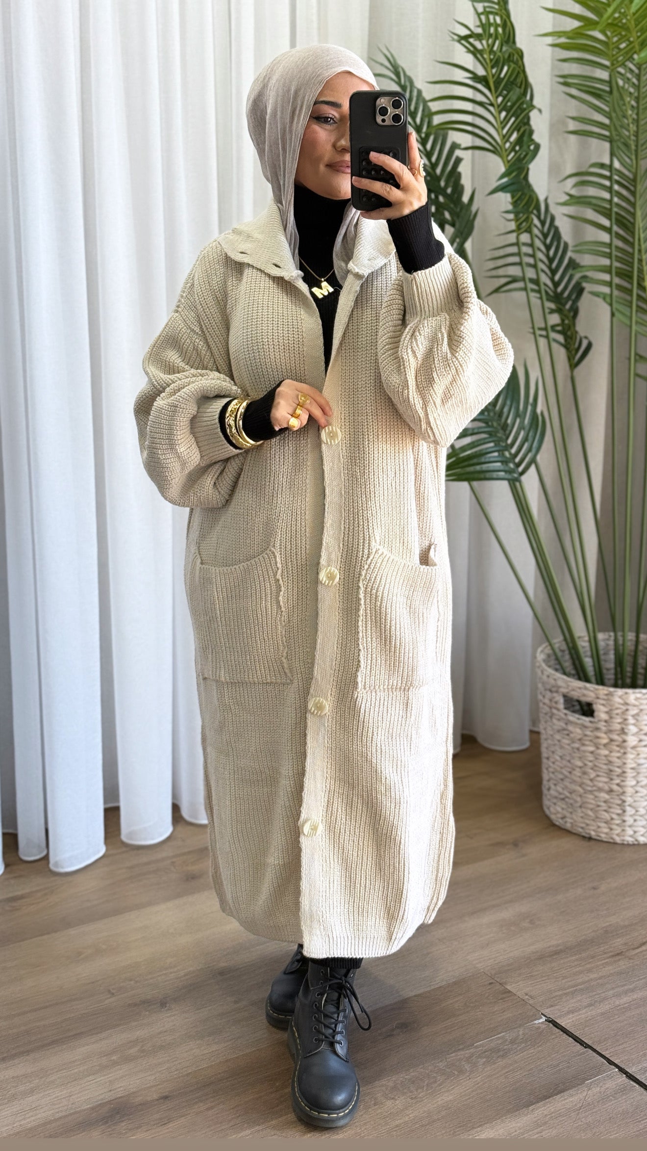 Description: The Turtleneck Cardigan is a stunning cardigan. It is a thick knit, full length or tunic (depending on your height), turtleneck, has two front pockets, full buttons, and cuffed wrists. It is thick and comfortable to layer.